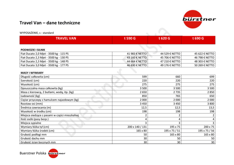 Travel Van – dane techniczne WYPOSAŻENIE, s - standard TRAVEL VAN t 590 G t 620 G t 690 G PODWOZIE I SILNIK Fiat Ducato 2,0 Mjet - 3500 kg - 115 PS Fiat Ducato 2,3 Mjet - 3500 kg - 130 PS Fiat Ducato 2,3 Mjet - 3500 kg - 148 PS Fiat Ducato 3,0 Mjet - 3500 kg - 177 PS 41 983 € NETTO 43 160 € NETTO 44 664 € NETTO 46 630 € NETTO 44 529 € NETTO 45 706 € NETTO 47 210 € NETTO 49 176 € NETTO 45 622 € NETTO 46 798 € NETTO 48 303 € NETTO 50 269 € NETTO MASY I WYMIARY Długość całkowita (cm) Szerokość (cm) Wysokość (cm) Dpouszczalna masa całkowita (kg) Masa z kierowcą, 2 butlami, wodą, itp. (kg) Ładowność (kg) Ciężar przyczepy z hamulcem najazdowym (kg) Rozstaw osi (mm) Średnica zawracania (m) Wysokość w środku (cm) Miejsca siedzące z pasami w części mieszkalnej Ilość osób (pasy bezp.) Miejsca sypialne Wymiary łóżka tył (cm) Wymiary łóżka środek (cm) Grubość podłogi mm Grubość dachu mm Grubość ścian bocznych mm 599 220 275 3 500 2 650 850 2 000 3 450 12,5 198 2 4 3 200 x 140 / 131 165 x 80 50 30 30 660 220 275 3 500 2 735 765 2 000 3 450 12,5 198 2 4 3 195 x 75 195 x 75 / 51 165 x 80 50 30 699 220 275 3 500 2 850 650 2 000 3 800 13,5 198 2 4 3 200 x 75 195 x 75 / 56 165 x 80 50 30 Buerstner Polska SAMOCHÓD ABS Rama Fiat Ducato – niska i lekka Zestaw naprawczy koła Lakierowany spoiler przedni Filtr cząstek stałych s s s s s s s s s s s s s s s KABINA KIEROWCY Poduszka powietrzna kierowcy Uchwyty do napojów Siedzenia z regulacją położenia, kąta i wysokości Zasłony szyb składane - Remis Elektrycznie opuszczane szyby, centralny zamek Siedzenia "pilota" w tapicerce jak reszta kampera s s s s s s s s s s s s s s s s s s WYKOŃCZENIE Z ZEWNĄTRZ Trzecie światło „STOP” w kształcie logo Klapa serwisowa Aluminiowe ramy okien Jednoczęściowe drzwi wejściowe Aluminiowa, gładka blacha zewnętrzna Okno dachowe w toalecie Elektrycznie wysuwany stopień Lakierowany na czarno tylny spojler Drzwi garażowe, prawe Okno dachowe Midi Heki Okno dachowe Mini Heki Podwójne okna z moskitierami i roletami Dach GFK - redukuje skutki gradu Podłoga GFK s s s s s s s s s s s s s s s s s s s s s s s s s s s s s s s s s s s s s s s s s s Buerstner Polska Ściany, dach i podłoga zawierają wzmocnienia bez drewna Izolacja XPS s s s s s s WYKOŃCZENIE WNĘTRZA Łóżko stałe z materacem z 5 strefami "zimnej pianki" (EvoPore) Garderoba z oświetleniem Meble - okleina Ginger Teak Prześcieradła na łóżkach stałych Listewki stelaża łóżka z gumą kauczukową Narzuta na łóżko s s s s s s s s s s s s s s s s s s KUCHNIA Kuchenka 3 palnikowa ze szklaną pokrywą Samodomykające szuflady Zlew z pokrywą – jednocześnie deską do krojenia Lodówka 97 litrów (w tym 11 l zamrażarka) Lodówka 145 litrów (w tym 15 l zamrażarka) s s s s - s s s s - s s s s INSTALACJA WODNA Zbiornik na brudną wodę 90 L Toaleta kasetowa Zbiornik na czystą wodę 20 – 110L (20L do dmc) Wariant łazienki Flexo-Bad Prysznic z kompletnym wyposażeniem Zintegrowane centrum obsługi s s s s s s s s s s s s s s s s s s Buerstner Polska INSTALACJA ELEKTRYCZNA Akumulator części mieszkalnej 90 Ah Oświetlenie 12V LED Transformator 250VA Oświetlenie na zewnątrz przy wejściu LED Centrum Serwisowe (wskaźniki, włączniki) Gniazdka 12V / 230V s s s s s s s s s s s s s s s s s s OGRZEWANIE Ogrzewanie gazowe Truma Combi 4 s s s Audio - Media Instalacja do radia - antena i głośniki w kabinie kierowcy Uchwyt do TV s s s s s s UWAGA! Podane ceny w € NETTO, nie zawierają podatku akcyzowego. W Polsce, na dzień 01.09.2015 podatek akcyzowy na samochody o pojemności silnika do 2,0 l - wynosi 3,1%, powyżej 2 l - 18,6%. Buerstner Polska Wyposażenie dodatkowe Travel Van – pakiety: + 29 kg Chassis Paket – klimatyzacja manualna Poduszka powietrzna pasażera Elektrycznie regulowane i podgrzewane lusterka ESP z ASR, Trakcją Plus i Hill Holder Klimatyzacja manualna kabiny z filtrem pyłkowym Tempomat CENA: 1773 € NETTO + 29 kg Chassis Paket – klimatyzacja automatyczna Poduszka powietrzna pasażera Elektrycznie regulowane i podgrzewane lusterka ESP z ASR, Trakcją Plus i Hill Holder Klimatyzacja automatyczna kabiny z filtrem pyłkowym Tempomat CENA: 2133 € NETTO CENA: Ambiente Paket Dekoracyjne poduszki, 4 sztuki Narzuta(y) na łóżko Wysokiej jakości dywaniki w kabinie i części mieszkalnej CENA: + 31 kg Winter Paket – Truma Podgrzewane siedzenia kierowcy i pasażera Elektryczne ogrzewanie podłogowe Zbiornik i instalacja brudnej wody izolowane i podgrzewane Dodatkowe elektryczne ogrzewanie i grzanie wody Truma Combi 6 Zewnętrzna mata izolacyjna do szyb w kabinie Dodatkowy akumulator 90 Ah CENA: 1849 € NETTO Buerstner Polska 0 kg Fiat Interieur Design Paket Aluminiowe wykończenia w kabinie kierowcy Chromowane ringi dookoła liczników Skórzana kierownica i gałka zmiany biegów 335 € NETTO + 7 kg 374 € NETTO Design Paket – graphite Alufelgi 16 cali Specjalny lakier graphite Chromowane aplikacje na grillu chłodnicy 0 kg CENA: Design Paket – silver/champagner Alufelgi 16 cali Specjalny lakier silver/champagner Chromowane aplikacje na grillu chłodnicy 992 € NETTO 0 kg CENA: 1681 € NETTO Wyposażenie dodatkowe Travel Van: o – opcjonalnie WYPOSAŻENIE t 590 G t 620 G t 690 G MASA (kg) 255,450,190,1700,61,481,108,432,108,255,325,1350,991,130,130,269,244,150,- o o o o o o o o o o o o o o o o o o o o o o o o o o o o o o o o o o o o o o o o o o o o o o o o o o o o o o 3 0 2 17 28 1 0 15 0 6 11 19 18 2 0 0 1 0 1037,- o o o 50 798,- o o o 4 CENA (€ NETTO) SAMOCHÓD Poduszka powietrzna pasażera Alufelgi 16 cali dla podwozia Elektrycznie regulowane i podgrzewane lusterka Automatyczna skrzynia biegów Zbiornik paliwa 120L ESP z ASR, Trakcją Plus i Hill Holder Zwiększenie masy całkowitej (dmc) do 3650 kg dla podwozia Light (3,5t) Zwiększenie masy całkowitej (dmc) do 3850 kg dla podwozia Light (3,5t) Zwiększenie masy całkowitej (dmc) d