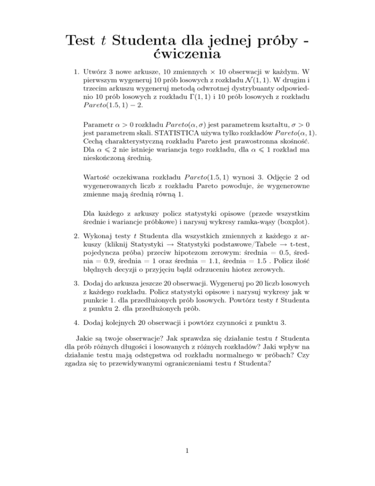 Test t Studenta dla jednej próby ćwiczenia 1. Utwórz 3 nowe arkusze, 10 zmiennych × 10 obserwacji w każdym. W pierwszym wygeneruj 10 prób losowych z rozkładu N (1, 1). W drugim i trzecim arkuszu wygeneruj metodą odwrotnej dystrybuanty odpowiednio 10 prób losowych z rozkładu Γ(1, 1) i 10 prób losowych z rozkładu P areto(1.5, 1) − 2. Parametr α > 0 rozkładu P areto(α, σ) jest parametrem kształtu, σ > 0 jest parametrem skali. STATISTICA używa tylko rozkładów P areto(α, 1). Cechą charakterystyczną rozkładu Pareto jest prawostronna skośność. Dla α ¬ 2 nie istnieje wariancja tego rozkładu, dla α ¬ 1 rozkład ma nieskończoną średnią. Wartość oczekiwana rozkładu P areto(1.5, 1) wynosi 3. Odjęcie 2 od wygenerowanych liczb z rozkładu Pareto powoduje, że wygenerowne zmienne mają średnią równą 1. Dla każdego z arkuszy policz statystyki opisowe (przede wszystkim średnie i wariancje próbkowe) i narysuj wykresy ramka-wąsy (boxplot). 2. Wykonaj testy t Studenta dla wszystkich zmiennych z każdego z arkuszy (kliknij Statystyki → Statystyki podstawowe/Tabele → t-test, pojedyncza próba) przeciw hipotezom zerowym: średnia = 0.5, średnia = 0.9, średnia = 1 oraz średnia = 1.1, średnia = 1.5 . Policz ilość błędnych decyzji o przyjęciu bądź odrzuceniu hiotez zerowych. 3. Dodaj do arkusza jeszcze 20 obserwacji. Wygeneruj po 20 liczb losowych z każdego rozkładu. Policz statystyki opisowe i narysuj wykresy jak w punkcie 1. dla przedłużonych prób losowych. Powtórz testy t Studenta z punktu 2. dla przedłużonych prób. 4. Dodaj kolejnych 20 obserwacji i powtórz czynności z punktu 3. Jakie są twoje obserwacje? Jak sprawdza się działanie testu t Studenta dla prób różnych długości i losowanych z różnych rozkładów? Jaki wpływ na działanie testu mają odstępstwa od rozkładu normalnego w próbach? Czy zgadza się to przewidywanymi ograniczeniami testu t Studenta? 1