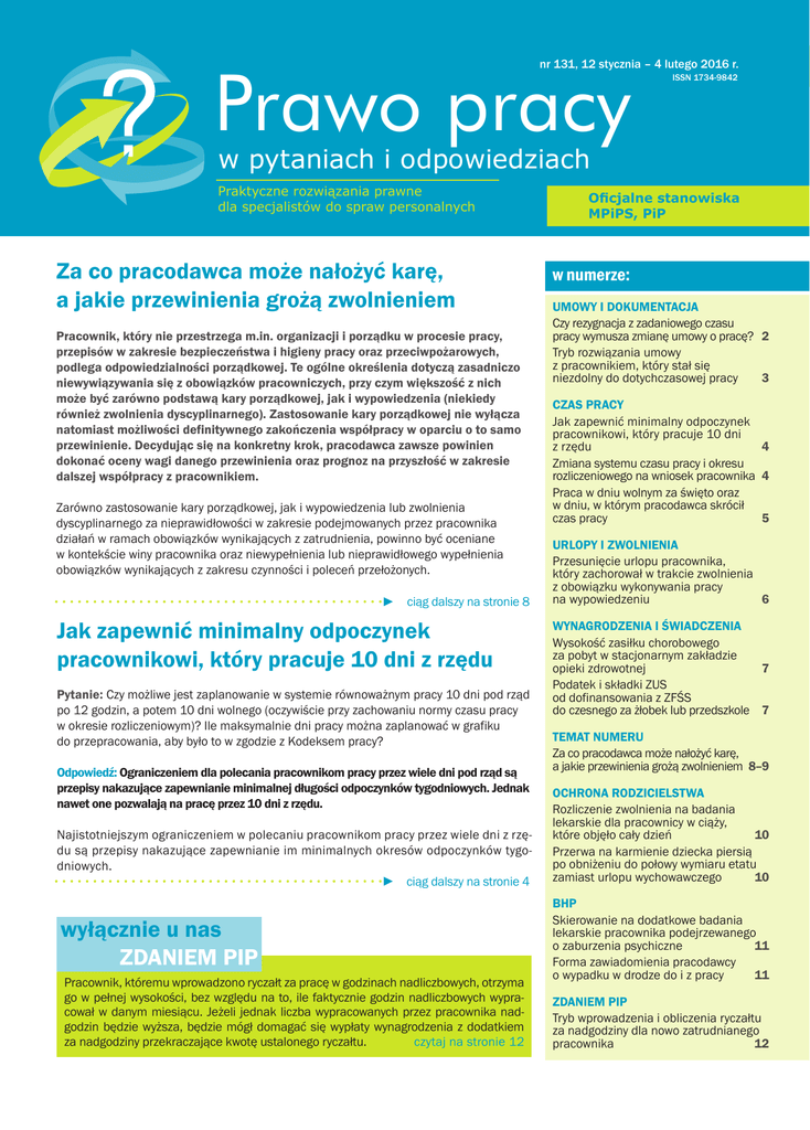 Prawo pracy nr 131, 12 stycznia – 4 lutego 2016 r. ???????????????? ISSN 1734-9842 w pytaniach i odpowiedziach Praktyczne rozwiązania prawne dla specjalistów do spraw personalnych Za co pracodawca może nałożyć karę, a jakie przewinienia grożą zwolnieniem Pracownik, który nie przestrzega m.in. organizacji i porządku w procesie pracy, przepisów w zakresie bezpieczeństwa i higieny pracy oraz przeciwpożarowych, podlega odpowiedzialności porządkowej. Te ogólne określenia dotyczą zasadniczo niewywiązywania się z obowiązków pracowniczych, przy czym większość z nich może być zarówno podstawą kary porządkowej, jak i wypowiedzenia (niekiedy również zwolnienia dyscyplinarnego). Zastosowanie kary porządkowej nie wyłącza natomiast możliwości definitywnego zakończenia współpracy w oparciu o to samo przewinienie. Decydując się na konkretny krok, pracodawca zawsze powinien dokonać oceny wagi danego przewinienia oraz prognoz na przyszłość w zakresie dalszej współpracy z pracownikiem. Zarówno zastosowanie kary porządkowej, jak i wypowiedzenia lub zwolnienia dyscyplinarnego za nieprawidłowości w zakresie podejmowanych przez pracownika działań w ramach obowiązków wynikających z zatrudnienia, powinno być oceniane w kontekście winy pracownika oraz niewypełnienia lub nieprawidłowego wypełnienia obowiązków wynikających z zakresu czynności i poleceń przełożonych. ciąg dalszy na stronie 8 Jak zapewnić minimalny odpoczynek pracownikowi, który pracuje 10 dni z rzędu Pytanie: Czy możliwe jest zaplanowanie w systemie równoważnym pracy 10 dni pod rząd po 12 godzin, a potem 10 dni wolnego (oczywiście przy zachowaniu normy czasu pracy w okresie rozliczeniowym)? Ile maksymalnie dni pracy można zaplanować w grafiku do przepracowania, aby było to w zgodzie z Kodeksem pracy? Odpowiedź: Ograniczeniem dla polecania pracownikom pracy przez wiele dni pod rząd są przepisy nakazujące zapewnianie minimalnej długości odpoczynków tygodniowych. Jednak nawet one pozwalają na pracę przez 10 dni z rzędu. Najistotniejszym ograniczeniem w polecaniu pracownikom pracy przez wiele dni z rzędu są przepisy nakazujące zapewnianie im minimalnych okresów odpoczynków tygodniowych. ciąg dalszy na stronie 4 wyłącznie u nas ZDANIEM PIP Pracownik, któremu wprowadzono ryczałt za pracę w godzinach nadliczbowych, otrzyma go w pełnej wysokości, bez względu na to, ile faktycznie godzin nadliczbowych wypracował w danym miesiącu. Jeżeli jednak liczba wypracowanych przez pracownika nadgodzin będzie wyższa, będzie mógł domagać się wypłaty wynagrodzenia z dodatkiem za nadgodziny przekraczające kwotę ustalonego ryczałtu. czytaj na stronie 12 Oficjalne stanowiska MPiPS, PiP w numerze: UMOWY I DOKUMENTACJA Czy rezygnacja z zadaniowego czasu pracy wymusza zmianę umowy o pracę? 2 Tryb rozwiązania umowy z pracownikiem, który stał się niezdolny do dotychczasowej pracy 3 CZAS PRACY Jak zapewnić minimalny odpoczynek pracownikowi, który pracuje 10 dni z rzędu 4 Zmiana systemu czasu pracy i okresu rozliczeniowego na wniosek pracownika 4 Praca w dniu wolnym za święto oraz w dniu, w którym pracodawca skrócił czas pracy 5 URLOPY I ZWOLNIENIA Przesunięcie urlopu pracownika, który zachorował w trakcie zwolnienia z obowiązku wykonywania pracy na wypowiedzeniu 6 WYNAGRODZENIA I ŚWIADCZENIA Wysokość zasiłku chorobowego za pobyt w stacjonarnym zakładzie opieki zdrowotnej 7 Podatek i składki ZUS od dofinansowania z ZFŚS do czesnego za żłobek lub przedszkole 7 TEMAT NUMERU Za co pracodawca może nałożyć karę, a jakie przewinienia grożą zwolnieniem 8–9 OCHRONA RODZICIELSTWA Rozliczenie zwolnienia na badania lekarskie dla pracownicy w ciąży, które objęło cały dzień 10 Przerwa na karmienie dziecka piersią po obniżeniu do połowy wymiaru etatu zamiast urlopu wychowawczego 10 BHP Skierowanie na dodatkowe badania lekarskie pracownika podejrzewanego o zaburzenia psychiczne 11 Forma zawiadomienia pracodawcy o wypadku w drodze do i z pracy 11 ZDANIEM PIP Tryb wprowadzenia i obliczenia ryczałtu za nadgodziny dla nowo zatrudnianego pracownika 12 Umowy i dokumentacja Czy rezygnacja z zadaniowego czasu pracy wymusza zmianę umowy o pracę? OD REDAKCJI Pytanie: W umowie o pracę pracownika został określony zadaniowy czas pracy. Obecnie chcemy zmienić charakter pracy pracownika i zrezygnować z takiego systemu pracy. Czy należy przygotować aneks do umowy o pracę, czy jest to wypowiedzenie warunków pracy? WYRAŹNA GRANICA CZY CIENKA LINIA? Czy za lekceważenie przepisów bhp można pracownika tylko ukarać, czy nawet zwolnić? Ile „żółtych kartek” musi uzbierać pracownik, aby pracodawca miał podstawy do wypowiedzenia umowy, a jak ciężkie musi być przewinienie podwładnego, aby zasłużył on na dyscyplinarkę? Czym różni się sytuacja pracownika, który pił alkohol w pracy, od sytuacji pracownika uzależnionego od alkoholu, który dopuścił się takiego samego występku? Wokół odpowiedzialności pracowników za naruszenie lub nienależyte wykonywanie swoich obowiązków narosło wiele mitów. Nasz ekspert wyjaśnia, gdzie leży granica, której przekroczenie uprawnia pracodawcę do ukarania pracownika lub do zwolnienia z pracy oraz czy zawsze jest ona możliwa do ustalenia. Emilia Wawrzyszczuk redaktor prowadząca, specjalista w zakresie prawa pracy i wynagrodzeń Numery telefonu na dyżur eksperta od 14.00 do 16.00: 19, 26 stycznia 2016 r. – tel. 22 318 07 30 2, 9 lutego 2016 r. – tel. 22 318 07 35 Prawo pracy w pytaniach i odpowiedziach Kierownik grupy wydawniczej: Agnieszka Konopacka-Kuramochi Redaktor prowadząca: Emilia Wawrzyszczuk Konsultant merytoryczny: Halina Tulwin dyrektor Departamentu Prawnego GIP Wydawca: Hanna Komorowska Koordynator produkcji: Mariusz Jezierski Projekt graficzny: Magdalena Huta Druk: MDruk Nakład: 2800 egz. Korekta, skład i łamanie: Cała Jaskrawość, www.calajaskrawosc.
