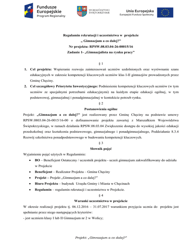 Regulamin rekrutacji i uczestnictwa w projekcie „ Gimnazjum a co dalej?” Nr projektu: RPSW.08.03.04-26-00015/16 Zadanie 1- „Gimnazjalista na rynku pracy” §1 1. Cel projektu: Wspieranie rozwoju zainteresowań uczniów uzdolnionych oraz wyrównanie szans edukacyjnych w zakresie kompetencji kluczowych uczniów klas I-II gimnazjów prowadzonych przez Gminę Chęciny. 2. Cel szczegółowy Priorytetu Inwestycyjnego: Podniesienie kompetencji kluczowych uczniów (w tym uczniów ze specjalnymi potrzebami edukacyjnymi) na każdym etapie edukacji ogólnej, w tym podstawowej, gimnazjalnej i ponadgimnazjalnej w kontekście potrzeb rynku. §2 Postanowienia ogólne Projekt: „Gimnazjum a co dalej?” jest realizowany przez Gminę Chęciny na podstawie umowy RPSW.0803.04-26-0015/16-00 o dofinansowanie projektu zawartej z Marszałkiem Województwa Świętokrzyskiego, w ramach działania RPSW.08.03.04 Zwiększenie dostępu do wysokiej jakości edukacji przedszkolnej oraz kształcenia podstawowego, gimnazjalnego i ponadgimnazjalnego, Poddziałanie 8.3.4 Rozwój szkolnictwa ponadpodstawowego w budowaniu kompetencji kluczowych. §3 Słownik pojęć Wyjaśnienie pojęć użytych w Regulaminie: BO – Beneficjent Ostateczny / uczestnik projektu - uczeń gimnazjum zakwalifikowany do udziału w Projekcie Beneficjent – Realizator Projektu – Gmina Chęciny Projekt – Projekt „Gimnazjum a co dalej?” Biuro Projektu – budynek Urzędu Gminy i Miasta w Chęcinach Regulamin – regulamin rekrutacji i uczestnictwa w Projekcie. §4 Warunki uczestnictwa w projekcie W okresie realizacji projektu tj. 06.12.2016 – 31.07.2017 warunkiem przyjęcia ucznia do projektu jest spełnianie przez niego następujących kryteriów: - jest uczniem klasy I lub II Gimnazjum nr 2 w Wolicy; Projekt: „Gimnazjum a co dalej?” - jest osobą fizyczną, która uczy się, pracuje lub zamieszkuje na obszarze województwa świętokrzyskiego w rozumieniu przepisów Kodeksu Cywilnego §5 Zasady rekrutacji 1. Rekrutacja Uczestników odbywać się będzie na zasadach określonych w niniejszym regulaminie. 2. Wymagane jest wypełnienie i złożenie przez kandydata/kę dokumentów rekrutacyjnych stanowiących załączniki do niniejszego Regulaminu; 3. Decyzję o zakwalifikowaniu do projektu podejmuje Komisja Rekrutacyjna. 4. Złożone Formularze są gromadzone w rejestrze wg alfabetu. 5. Do udziału w projekcie w zadaniu 1. „Gimnazjalista na rynku pracy” preferowani są uczniowie, którzy posiadają słabe wyniki w nauce oraz duży poziom motywacji do zdobywania wiedzy. 6. Znaczenie punktowe przy naborze do projektu: klasa II- na podstawie ocen z matematyki, języka angielskiego i informatyki (koniec roku szkolnego 2015/2016): - ocena dostateczna – 3 pkt - ocena dobra – 2 pkt - opinia wychowawcy lub nauczyciela w/w przedmiotów – 2 pkt klasa I- na postawie wyników ze sprawdzianu szóstoklasistów z części matematyczno-przyrodniczej oraz języka angielskiego: - poniżej średniej woj. – 3 pkt - powyżej średniej woj.- 2 pkt - opinia pedagoga szkolnego na podst. rozmowy z uczniem – 2 pkt - uczniowie posiadający opinię z poradni specjalistycznej o trudnościach w nauce – 2 pkt. 7. Pierwszeństwo do udziału w projekcie będą mieli uczniowie z orzeczeniem o niepełnosprawności. 8. Aby zapewnić równość szans kobiet i mężczyzn, proces rekrutacji będzie prowadzony do wyczerpania miejsc przewidzianych osobno dla kobiet i mężczyzn. 9. O zakwalifikowaniu do uczestnictwa w projekcie decyduje uzyskana liczba punktów, przy równej ilości punktów decyduje kolejność zgłoszeń. 10. W przypadku zgłaszania się do udziału w zadaniu większej niż zakładano liczby chętnych zostanie utworzona lista osób rezerwowych, wykorzystywana w przypadku rezygnacji osób wcześniej zakwalifikowanych. 11. Wzór Deklaracji uczestnictwa w projekcie wraz z załącznikami do pobrania: w sekretariacie szkoły, w Biurze Projektu: Urząd Gminy i Miasta w Chęcinach, oraz na stronach internetowych: www.zsowolica.checiny.pl , zsocheciny.szkolnastrona.pl, www.checiny.pl 12. Odrzucane będą osoby, które: - złożą deklarację uczestnictwa na innym niż określony w załączniku nr 2 wzorze, Projekt: „Gimnazjum a co dalej?” - złożą niekompletne lub nieprawidłowe załączniki, - nieczytelnie wypełnią dokumenty zgłoszeniowe. 13. Podczas naboru, zachowana zostanie zasada równych szans dostępu, w tym równość płci. 14. Osoby zakwalifikowane do projektu zostaną powiadomione osobiście przez powołanych koordynatorów szkolnych. 15. Dokumentację rekrutacyjną uczestnik składa do dnia 17.01.2017 r. §6 Uprawnienia i obowiązki Uczestnika projektu 1. Uczestnik projektu jest uprawniony do nieodpłatnego udziału w projekcie: „Gimnazjum a co dalej?” 2. Uczestnik projektu zobowiązany jest do rzetelnego uczestnictwa w działaniach przewidzianych w ramach projektu. 3. Realizator projektu dopuszcza usprawiedliwione nieobecności uczestnika spowodowane chorobą lub ważnymi sytuacjami losowymi. Usprawiedliwienie wymaga telefonicznego oraz pisemnego zawiadomienia przez rodzica/opiekuna o przyczynach nieobecności. 4. Liczba nieobecności w trakcie projektu nie może przekroczyć 20 % godzin realizowanych w ramach zadania. §7 Zasady monitoringu i kontroli 1. Uczestnik projektu oraz rodzic/opiekun składa oświadczenie, wyrażając własnoręcznym podpisem zgodę na udostępnianie i przetwarzanie danych osobowych, zgodnie ze wzorem stanowiącym załącznik nr 4 do niniejszego Regulaminu.. 2. Dane osobowe, o których mowa w ust. 1, przetwarzane będą w celu umożliwienia monitoringu, kontroli i ewaluacji Projektu. §8 Zasady rezygnacji z uczestnictwa w projekcie 1. Realizator projektu zastrzega sobie prawo skreślenia Beneficjenta Ostatecznego z listy uczestników projektu w przypadku nieobecności przekraczającej 20% zajęć zgodnie z § 6 w ust.4. 2. W przypadku rezygnacji lub skreślenia uczestnika z listy osób zakwa