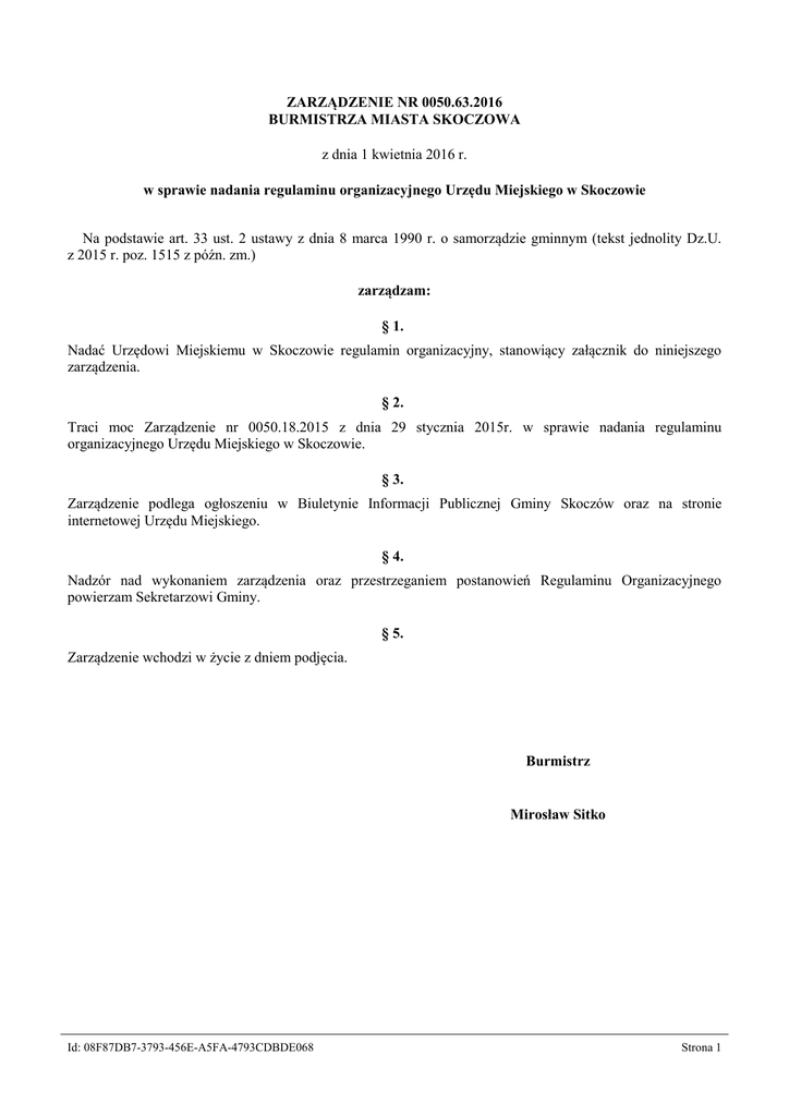 ZARZĄDZENIE NR 0050.63.2016 BURMISTRZA MIASTA SKOCZOWA z dnia 1 kwietnia 2016 r. w sprawie nadania regulaminu organizacyjnego Urzędu Miejskiego w Skoczowie Na podstawie art. 33 ust. 2 ustawy z dnia 8 marca 1990 r. o samorządzie gminnym (tekst jednolity Dz.U. z 2015 r. poz. 1515 z późn. zm.) zarządzam: § 1. Nadać Urzędowi Miejskiemu w Skoczowie regulamin organizacyjny, stanowiący załącznik do niniejszego zarządzenia. § 2. Traci moc Zarządzenie nr 0050.18.2015 z dnia 29 stycznia 2015r. w sprawie nadania regulaminu organizacyjnego Urzędu Miejskiego w Skoczowie. § 3. Zarządzenie podlega ogłoszeniu w Biuletynie Informacji Publicznej Gminy Skoczów oraz na stronie internetowej Urzędu Miejskiego. § 4. Nadzór nad wykonaniem zarządzenia oraz przestrzeganiem postanowień Regulaminu Organizacyjnego powierzam Sekretarzowi Gminy. § 5. Zarządzenie wchodzi w życie z dniem podjęcia. Burmistrz Mirosław Sitko Id: 08F87DB7-3793-456E-A5FA-4793CDBDE068 Strona 1 Załącznik do Zarządzenia Nr 0050.63.2016 Burmistrza Miasta Skoczowa z dnia 1 kwietnia 2016 r. REGULAMIN ORGANIZACYJNY URZĘDU MIEJSKIEGO W SKOCZOWIE Rozdział 1 POSTANOWIENIA OGÓLNE §1 Regulamin organizacyjny Urzędu Miejskiego w Skoczowie, zwany dalej „Regulaminem", określa szczegółową organizację, zasady funkcjonowania oraz tryb pracy Urzędu Miejskiego w Skoczowie, w tym: 1. strukturę organizacyjną Urzędu, 2. zasady kierowania Urzędem, 3. zasady działania i podstawowe kompetencje komórek organizacyjnych Urzędu, 4. zasady podpisywania pism i decyzji, 5. zasady i tryb postępowania przy opracowywaniu i wydawaniu aktów prawnych, 6. organizację przyjmowania, rozpatrywania i załatwiania skarg, wniosków oraz spraw indywidualnych, 7. organizację działalności kontrolnej. §2 Urząd Miejski w Skoczowie jest jednostką organizacyjną Gminy Skoczów. §3 1. Urząd Miejski jest zakładem pracy w rozumieniu przepisów prawa pracy. 2. Siedzibą Urzędu Miejskiego jest Skoczów, Rynek 1. 3. Urząd Miejski działa na zasadach jednostki budżetowej. §4 Ilekroć w Regulaminie jest mowa o: 1. Urzędzie - rozumie się przez to Urząd Miejski w Skoczowie, 2. Burmistrzu - rozumie się przez to Burmistrza Miasta Skoczowa, 3. Zastępcy Burmistrza - rozumie się przez to Zastępcę Burmistrza Miasta Skoczowa, 4. Sekretarzu - rozumie się przez to Sekretarza Gminy Skoczów, 5. Skarbniku - rozumie się przez to Skarbnika Gminy Skoczów, 6. Radzie - rozumie się przez to Radę Miejską Skoczowa. Rozdział 2 Struktura organizacyjna Urzędu Kierownictwo Urzędu stanowią: 1. Burmistrz 2. Zastępca Burmistrza 3. Sekretarz Gminy 4. Skarbnik Gminy Id: 08F87DB7-3793-456E-A5FA-4793CDBDE068 Symbol B Z ST FS Strona 2 §5 W ramach struktury organizacyjnej Urzędu wyodrębnia się wydziały, biura, samodzielne stanowiska pracy i inne komórki organizacyjne wymienione w niniejszym paragrafie. 1. Wydziały: symbol 1) Wydział Finansowo - Budżetowy WF a) Referat ds. Podatków i Opłat WF1 b) Referat ds. Budżetu WF2 2) Wydział Organizacyjny WO a) Sekretariat WO1 b) Kancelaria WO2 c) Działalność gospodarcza WO3 d) Biuro Rady Miejskiej RM 3) Wydział Inwestycji i Rozwoju, mieszczący się przy ul. Mickiewicza 14 WIR 4) Wydział Gospodarki Komunalnej i Środowiska WK 5) Wydział Spraw Obywatelskich i Obronnych WSO 6) Wydział Nieruchomości i Planowania Przestrzennego WN 7) Wydział Funduszy Europejskich, mieszczący się przy Rynek 17 WFE 2. Straż Miejska, mieszcząca się przy ul. Mickiewicza 14 SM 3. Urząd Stanu Cywilnego USC 4. Biuro Radców Prawnych BP 5. Biuro Promocji, Informacji i Turystki, BPI 6. Archiwum zakładowe AZ 7. Samodzielne stanowiska pracy: 1) Stanowisko ds. kontroli wewnętrznej i nadzoru właścicielskiego SK 2) Stanowisko ds. zamówień publicznych ZP 3) Stanowisko ds. audytu wewnętrznego SA 4) Stanowisko ds. gospodarki leśnej SGL 5) Stanowisko ds. kadr SKD Rozdział 3. Zasady kierowania Urzędem §6 1. Burmistrz jest w szczególności: kierownikiem Urzędu oraz zwierzchnikiem służbowym pracowników Urzędu, 1) reprezentuje Urząd na zewnątrz, 2) upoważnia pracowników Urzędu do wydawania w jego imieniu decyzji administracyjnych w indywidualnych sprawach z zakresu administracji publicznej, 3) udziela pełnomocnictw do załatwiania spraw prowadzonych przez Burmistrza, 4) powierza pracownikom zakres zadań i uprawnień, 5) Burmistrz może na wniosek naczelnika powołać jego zastępcę. Id: 08F87DB7-3793-456E-A5FA-4793CDBDE068 Strona 3 §7 Zastępca Burmistrza merytorycznie kieruje i sprawuje zwierzchnictwo nad komórkami organizacyjnymi określonymi w zarządzeniu Burmistrza w sprawie podziału zadań pomiędzy Burmistrzem i Zastępcą Burmistrza, ponadto w czasie nieobecności Burmistrza, wykonuje wszystkie jego zadania i przejmuje jego uprawnienia zgodnie z udzielonym upoważnieniem. §8 Sekretarz zapewnia sprawne funkcjonowanie Urzędu i organizowanie jego pracy poprzez: 1) czuwanie nad opracowywaniem projektów aktów wewnętrznych, regulujących strukturę i zasady działania Urzędu i jego komórek organizacyjnych, 2) nadzorowanie toku przygotowywania projektów zarządzeń Burmistrza oraz prac związanych z organizacją jego pracy, 3) koordynowanie prac dotyczących przygotowywania i wnoszenia pod obrady Rady i na posiedzenia komisji Rady projektów uchwał i innych materiałów przedstawianych przez Burmistrza, 4) zapewnienie warunków materialno - technicznych dla działalności Urzędu, 5) nadzorowanie zakupów środków trwałych, remontów oraz gospodarki powierzchnią użytkową budynków wchodzących w skład siedziby Urzędu, 6) wykonywanie innych zadań powierzonych przez Burmistrza, 7) udostępnianie informacji publicznej w zakresie organizacji i funkcjonowania Urzędu, 8) sprawowanie bezpośredniego nadzoru nad: a) Wydziałem Organizacyjnym, b) Wydziałem Spraw Obywatelskich i Obronnych w zakresie niezastrzeżonym dla Burmistrza, c) Stanowiskiem ds. kadr, d) Archiwum zakładowym. 9) bi