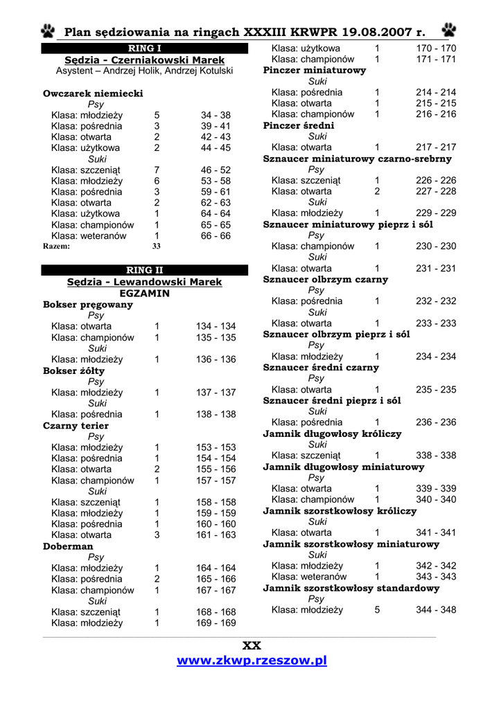 Plan sędziowania na ringach XXXIII KRWPR 19.08.2007 r. RING I Sędzia - Czerniakowski Marek Asystent – Andrzej Holik, Andrzej Kotulski Owczarek niemiecki Psy Klasa: młodzieŜy Klasa: pośrednia Klasa: otwarta Klasa: uŜytkowa Suki Klasa: szczeniąt Klasa: młodzieŜy Klasa: pośrednia Klasa: otwarta Klasa: uŜytkowa Klasa: championów Klasa: weteranów 5 3 2 2 34 - 38 39 - 41 42 - 43 44 - 45 7 6 3 2 1 1 1 46 - 52 53 - 58 59 - 61 62 - 63 64 - 64 65 - 65 66 - 66 Razem: 33 RING II Sędzia - Lewandowski Marek EGZAMIN Bokser pręgowany Psy Klasa: otwarta 1 134 - 134 Klasa: championów 1 135 - 135 Suki Klasa: młodzieŜy 1 136 - 136 Bokser Ŝółty Psy Klasa: młodzieŜy 1 137 - 137 Suki Klasa: pośrednia 1 138 - 138 Czarny terier Psy Klasa: młodzieŜy 1 153 - 153 Klasa: pośrednia 1 154 - 154 Klasa: otwarta 2 155 - 156 Klasa: championów 1 157 - 157 Suki Klasa: szczeniąt 1 158 - 158 Klasa: młodzieŜy 1 159 - 159 Klasa: pośrednia 1 160 - 160 Klasa: otwarta 3 161 - 163 Doberman Psy Klasa: młodzieŜy 1 164 - 164 Klasa: pośrednia 2 165 - 166 Klasa: championów 1 167 - 167 Suki Klasa: szczeniąt 1 168 - 168 Klasa: młodzieŜy 1 169 - 169 Klasa: uŜytkowa 1 170 - 170 Klasa: championów 1 171 - 171 Pinczer miniaturowy Suki Klasa: pośrednia 1 214 - 214 Klasa: otwarta 1 215 - 215 Klasa: championów 1 216 - 216 Pinczer średni Suki Klasa: otwarta 1 217 - 217 Sznaucer miniaturowy czarno-srebrny Psy Klasa: szczeniąt 1 226 - 226 Klasa: otwarta 2 227 - 228 Suki Klasa: młodzieŜy 1 229 - 229 Sznaucer miniaturowy pieprz i sól Psy Klasa: championów 1 230 - 230 Suki Klasa: otwarta 1 231 - 231 Sznaucer olbrzym czarny Psy Klasa: pośrednia 1 232 - 232 Suki Klasa: otwarta 1 233 - 233 Sznaucer olbrzym pieprz i sól Psy Klasa: młodzieŜy 1 234 - 234 Sznaucer średni czarny Psy Klasa: otwarta 1 235 - 235 Sznaucer średni pieprz i sól Suki Klasa: pośrednia 1 236 - 236 Jamnik długowłosy króliczy Suki Klasa: szczeniąt 1 338 - 338 Jamnik długowłosy miniaturowy Psy Klasa: otwarta 1 339 - 339 Klasa: championów 1 340 - 340 Jamnik szorstkowłosy króliczy Suki Klasa: otwarta 1 341 - 341 Jamnik szorstkowłosy miniaturowy Suki Klasa: młodzieŜy 1 342 - 342 Klasa: weteranów 1 343 - 343 Jamnik szorstkowłosy standardowy Psy Klasa: młodzieŜy 5 344 - 348 _____________________________________________________________________________________________________________________________________________________________________ XX www.zkwp.rzeszow.pl Plan sędziowania na ringach XXXIII KRWPR 19.08.2007 r. Suki Klasa: młodzieŜy Klasa: otwarta Klasa: uŜytkowa Razem: 1 1 1 349 - 349 350 - 350 351 - 351 53 RING III Sędzia - Jaworski Andrzej Jack Russell Terrier Psy Klasa: szczeniąt Suki Klasa: otwarta Terier szkocki Psy Klasa: pośrednia Klasa: otwarta Suki Klasa: młodzieŜy West Highland White Psy Klasa: otwarta Suki Klasa: szczeniąt Klasa: młodzieŜy Klasa: pośrednia Klasa: otwarta Kerry Blue Terrier Psy Klasa: otwarta Klasa: championów Suki Klasa: otwarta Klasa: championów Klasa: weteranów Yorkshire Terrier Psy Klasa: szczeniąt Klasa: młodzieŜy Klasa: pośrednia Klasa: otwarta Suki Klasa: szczeniąt Klasa: młodzieŜy Klasa: pośrednia Klasa: otwarta Klasa: championów Razem: 1 263 - 263 1 264 - 264 2 1 277 - 278 279 - 279 1 Terrier 280 - 280 2 284 - 285 1 1 3 3 286 - 286 287 - 287 288 - 290 291 - 293 1 1 265 - 265 266 - 266 1 1 1 267 - 267 268 - 268 269 - 269 2 5 4 2 294 - 295 296 - 300 301 - 304 305 - 306 1 13 9 7 1 307 - 307 308 - 320 321 - 329 330 - 336 337 - 337 65 RING IV Sędzia - Stępka Henryk Cocker spaniel angielski czarny Suki Klasa: championów 1 461 - 461 Cocker spaniel angielski kolorowy Suki Klasa: młodzieŜy 1 462 - 462 Cocker spaniel angielski złoty Psy Klasa: championów 1 463 - 463 Flat Coated Retriever Suki Klasa: szczeniąt 1 464 - 464 Klasa: championów 1 465 - 465 Nova Scotia Duck Tolling Retriever Psy Klasa: młodzieŜy 1 532 - 532 Suki Klasa: szczeniąt 1 533 - 533 Klasa: młodzieŜy 1 534 - 534 Płochacz niemiecki Suki Klasa: otwarta 1 535 - 535 Golden Retriever Psy Klasa: młodzieŜy 4 466 - 469 Klasa: pośrednia 1 470 - 470 Klasa: otwarta 4 471 - 474 Klasa: championów 1 475 - 475 Suki Klasa: młodzieŜy 6 476 - 481 Klasa: pośrednia 6 482 - 487 Klasa: otwarta 4 488 - 491 Klasa: championów 1 492 - 492 Labrador Retriever Psy Klasa: szczeniąt 1 493 - 493 Klasa: młodzieŜy 6 494 - 499 Klasa: pośrednia 2 500 - 501 Klasa: otwarta 3 502 - 504 Klasa: uŜytkowa 2 505 - 506 Klasa: championów 1 507 - 507 Suki Klasa: szczeniąt 2 508 - 509 Klasa: młodzieŜy 8 510 - 517 Klasa: pośrednia 5 518 - 522 Klasa: otwarta 9 523 - 531 Springer spaniel angielski Psy Klasa: otwarta 1 536 - 536 Klasa: uŜytkowa 1 537 - 537 Suki Klasa: pośrednia 1 538 - 538 Klasa: otwarta 1 539 - 539 Razem: 79 _____________________________________________________________________________________________________________________________________________________________________ XXI www.zkwp.rzeszow.pl Plan sędziowania na ringach XXXIII KRWPR 19.08.2007 r. RING V Sędzia - Jendrasiak Andrzej Airedale Terrier Psy Klasa: pośrednia 1 240 - 240 Suki Klasa: młodzieŜy 3 241 - 243 American Staffordshire Terrier Psy Klasa: młodzieŜy 1 244 - 244 Klasa: otwarta 2 245 - 246 Klasa: championów 1 247 - 247 Suki Klasa: młodzieŜy 2 248 - 249 Klasa: pośrednia 1 250 - 250 Klasa: otwarta 1 251 - 251 Bulterier standardowy Psy Klasa: pośrednia 1 252 - 252 Klasa: otwarta 2 253 - 254 Suki Klasa: pośrednia 2 255 - 256 Cairn Terrier Psy Klasa: młodzieŜy 1 257 - 257 Klasa: otwarta 1 258 - 258 Suki Klasa: młodzieŜy 1 259 - 259 Klasa: pośrednia 1 260 - 260 Klasa: otwarta 1 261 - 261 Foksterier szorstkowłosy Suki Klasa: championów 1 262 - 262 Niemiecki terier myśliwski Psy Klasa: szczeniąt 1 270 - 270 Staffordshire Bull Terrier Psy Klasa: pośrednia 1 271 - 271 Klasa: otwarta 1 272 - 272 Klasa: championów 1 273 - 273 Suki Klasa: pośrednia 1 274 - 274 Klasa: otwarta 1 275 - 275 Klasa: championów 1 276 - 276 Terier