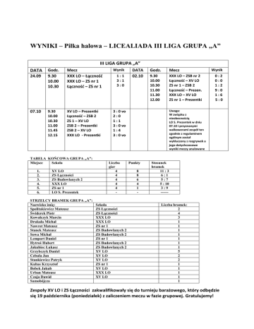 WYNIKI – Piłka halowa – LICEALIADA III LIGA GRUPA „A” III LIGA GRUPA „A” DATA 24.09 07.10 Godz. 9.30 10.00 10.30 Mecz XXX LO – Łącznośd XXX LO – ZS nr 1 Łącznośd – ZS nr 1 Wynik 9.30 10.00 10.30 11.00 11.45 12.15 XV LO – Prezentki Łącznośd – ZSB 2 ZS 1 – XV LO ZSB 2 – Prezentki ZSB 2 – XV LO XXX LO - Prezentki 3 : 0 vo 2:0 1:1 3 : 0 vo 1:4 3 : 0 vo TABELA KOŃCOWA GRUPA „A”: Miejsce Szkoła 1. 2. 3. 4. 5. 6. XV LO ZS Łączności ZS Budowlanych 2 XXX LO ZS nr 1 LO S. Prezentek STRZELCY BRAMEK GRUPA „A”: Nazwisko imię: Spolitakiewicz Mateusz Świderek Piotr Kowalczyk Marcin Drukała Michał Nawrot Mateusz Stanek Mateusz Sowa Michał Lempart Daniel Hytroś Hubert Jakubiec Łukasz Grzybczyk Daniel Cebula Jan Stankiewicz Patryk Kubas Krzysztof Bobek Jakub Urban Mateusz Czaja Dawid Samobójcza 1:1 3:1 3:0 Liczba gier 4 4 4 4 4 Szkoła ZS Łączności ZS Łączności XXX LO XXX LO ZS nr 1 ZS Budowlanych 2 ZS Budowlanych 2 ZS nr 1 ZS Budowlanych 2 ZS Budowlanych 2 XV LO XV LO XV LO ZS nr 1 XV LO XXX LO XV LO DATA 02.10 Godz. Mecz 9.30 10.00 10.30 11.00 11.30 12.00 XXX LO – ZSB nr 2 Łącznośd – XV LO ZS nr 1 – ZSB 2 Łącznośd – Prezen. XXX LO – XV LO ZS nr 1 – Prezentki Wynik 0:2 0:0 1:2 9:0 1:6 5:0 Uwaga: W związku z nieobecnością LO S. Prezentek w dniu 07.10 i przyznanymi walkowerami zespół ten zgodnie z regulaminem ogólnym został wykluczony z rozgrywek a jego dotychczasowe wyniki meczy anulowane Punkty 8 8 6 4 1 - Stosunek bramek 11 : 3 6:1 5:7 5 : 10 3:9 ------ Liczba bramek: 2 4 3 1 1 1 1 1 1 1 5 2 2 1 1 1 1 1 Zespoły XV LO i ZS Łączności zakwalifikowały się do turnieju barażowego, który odbędzie się 19 października (poniedziałek) z zaliczeniem meczu w fazie grupowej. Gratulujemy!
