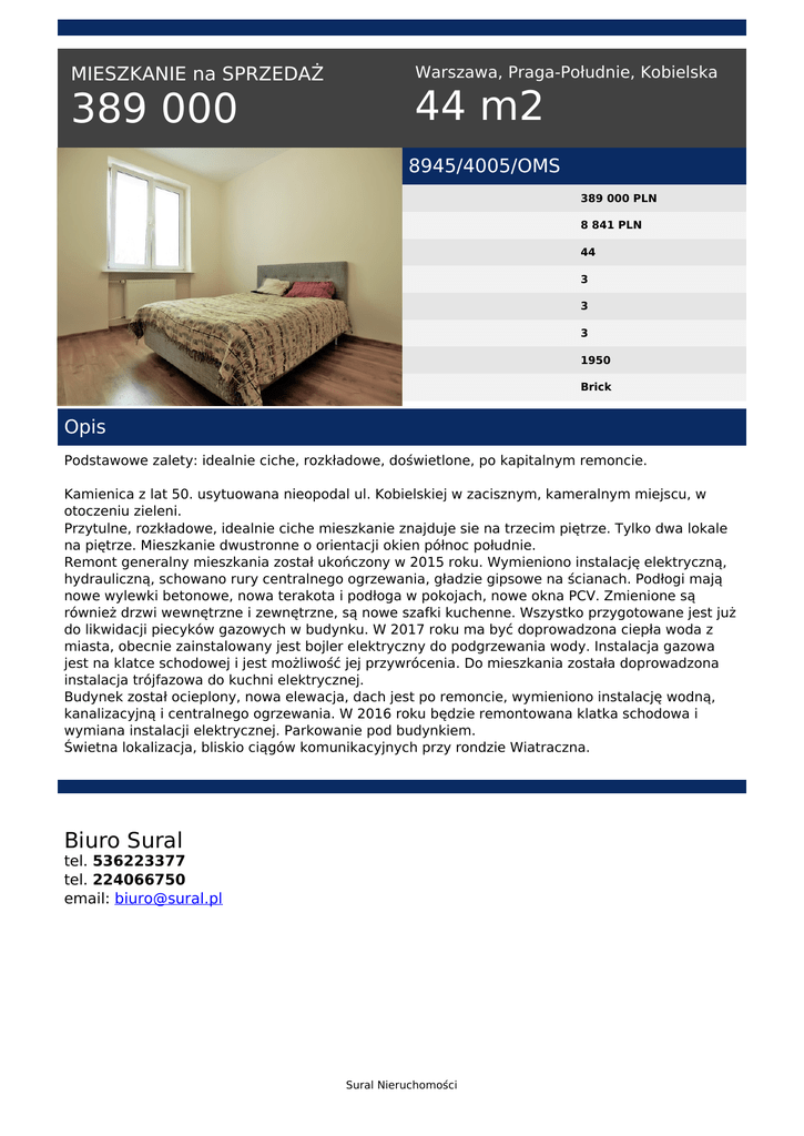 MIESZKANIE na SPRZEDAŻ 389 000 Warszawa, Praga-Południe, Kobielska 44 m2 8945/4005/OMS 389 000 PLN 8 841 PLN 44 3 3 3 1950 Brick Opis Podstawowe zalety: idealnie ciche, rozkładowe, doświetlone, po kapitalnym remoncie. Kamienica z lat 50. usytuowana nieopodal ul. Kobielskiej w zacisznym, kameralnym miejscu, w otoczeniu zieleni. Przytulne, rozkładowe, idealnie ciche mieszkanie znajduje sie na trzecim piętrze. Tylko dwa lokale na piętrze. Mieszkanie dwustronne o orientacji okien północ południe. Remont generalny mieszkania został ukończony w 2015 roku. Wymieniono instalację elektryczną, hydrauliczną, schowano rury centralnego ogrzewania, gładzie gipsowe na ścianach. Podłogi mają nowe wylewki betonowe, nowa terakota i podłoga w pokojach, nowe okna PCV. Zmienione są również drzwi wewnętrzne i zewnętrzne, są nowe szafki kuchenne. Wszystko przygotowane jest już do likwidacji piecyków gazowych w budynku. W 2017 roku ma być doprowadzona ciepła woda z miasta, obecnie zainstalowany jest bojler elektryczny do podgrzewania wody. Instalacja gazowa jest na klatce schodowej i jest możliwość jej przywrócenia. Do mieszkania została doprowadzona instalacja trójfazowa do kuchni elektrycznej. Budynek został ocieplony, nowa elewacja, dach jest po remoncie, wymieniono instalację wodną, kanalizacyjną i centralnego ogrzewania. W 2016 roku będzie remontowana klatka schodowa i wymiana instalacji elektrycznej. Parkowanie pod budynkiem. Świetna lokalizacja, bliskio ciągów komunikacyjnych przy rondzie Wiatraczna. Biuro Sural tel. 536223377 tel. 224066750 email: [email protected] Sural Nieruchomości Powered by TCPDF (www.tcpdf.org)