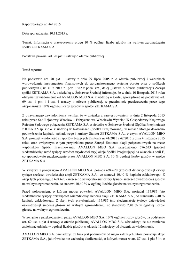 Raport bieżący nr 46/ 2015 Data sporządzenia: 10.11.2015 r. Temat: Informacja o przekroczeniu progu 10 % ogólnej liczby głosów na walnym zgromadzeniu spółki ZETKAMA S.A. Podstawa prawna: art. 70 pkt 1 ustawy o ofercie publicznej Treść raportu: Na podstawie art. 70 pkt 1 ustawy z dnia 29 lipca 2005 r. o ofercie publicznej i warunkach wprowadzania instrumentów finansowych do zorganizowanego systemu obrotu oraz o spółkach publicznych (Dz. U. z 2013 r., poz. 1382 z późn. zm., dalej „ustawa o ofercie publicznej”) Zarząd spółki ZETKAMA S.A. z siedzibą w Ścinawce Średniej informuje, że w dniu 10 listopada 2015 roku otrzymał zawiadomienie od AVALLON MBO S.A. z siedzibą w Łodzi, sporządzone na podstawie art. 69 ust. 1 pkt 1 i ust. 4 ustawy o ofercie publicznej, w przedmiocie przekroczenia przez tego akcjonariusza 10 % ogólnej liczby głosów w spółce ZETKAMA S.A. Z otrzymanego zawiadomienia wynika, że w związku z zarejestrowaniem w dniu 2 listopada 2015 roku przez Sąd Rejonowy Wrocław – Fabryczna we Wrocławiu Wydział IX Gospodarczy Krajowego Rejestru Sądowego połączenia ZETKAMA S.A. z siedzibą w Ścinawce Średniej (Spółka Przejmująca) z IDEA K5 sp. z o.o. z siedzibą w Katowicach (Spółka Przejmowana), w ramach którego dokonano podwyższenia kapitału zakładowego i zmiany Statutu ZETKAMA S.A., o czym AVALLON MBO S.A. powziął wiadomość z raportów bieżących Emitenta nr 41/2015 i 42/2015 z dnia 4 listopada 2015 roku, oraz związanym z tym przydziałem przez Zarząd Emitenta akcji połączeniowych na rzecz wspólników Spółki Przejmowanej, AVALLON MBO S.A. przydzielono 576.633 (pięćset siedemdziesiąt sześć tysięcy sześćset trzydzieści trzy) akcje Spółki Przejmującej na okaziciela serii F, co spowodowało przekroczenie przez AVALLON MBO S.A. 10 % ogólnej liczby głosów w spółce ZETKAMA S.A. W związku z powyższym AVALLON MBO S.A. posiada 694.620 (sześćset dziewięćdziesiąt cztery tysiące sześćset dwadzieścia) akcji ZETKAMA S.A., co stanowi 10,40 % kapitału zakładowego. Z akcji tych przysługuje 694.620 (sześćset dziewięćdziesiąt cztery tysiące sześćset dwadzieścia) głosów na walnym zgromadzeniu, co stanowi 10,40 % w ogólnej liczbie głosów na walnym zgromadzeniu. Przed połączeniem, o którym mowa powyżej, AVALLON MBO S.A. posiadał 117.987 (sto siedemnaście tysięcy dziewięćset osiemdziesiąt siedem) akcji ZETKAMA S.A., co stanowiło 2,40 % kapitału zakładowego. Z akcji tych przysługiwało 117.987 (sto siedemnaście tysięcy dziewięćset osiemdziesiąt siedem) głosów na walnym zgromadzeniu, co stanowiło 2,40 % w ogólnej liczbie głosów na walnym zgromadzeniu. W związku z przekroczeniem przez AVALLON MBO S.A. 10 % ogólnej liczby głosów, na podstawie art. 69 ust. 4 pkt 4 ustawy o ofercie publicznej AVALLON MBO S.A. oświadczył, że nie zamierza zwiększać udziału w ogólnej liczbie głosów w okresie 12 miesięcy od złożenia zawiadomienia. AVALLON MBO S.A. oświadczył, że brak jest podmiotów od niego zależnych, które posiadają akcje ZETKAMA S.A., jak również nie zachodzą okoliczności, o których mowa w art. 87 ust. 1 pkt 3 lit. c w zw. z art. 69 ust. 4 pkt 6 ustawy o ofercie publicznej, tj. nie istnieją osoby trzecie, z którymi akcjonariusz ten zawarł umowę, której przedmiotem jest przekazanie uprawnienia do wykonywania prawa głosu.