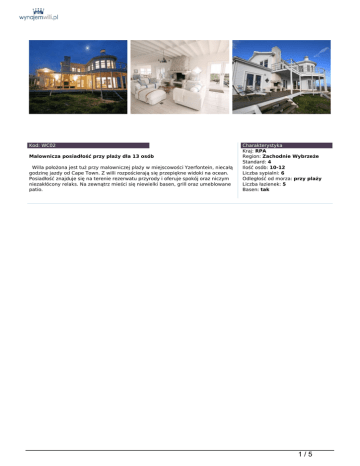 Kod: WC02 Malownicza posiadłość przy plaży dla 13 osób Willa położona jest tuż przy malowniczej plaży w miejscowości Yzerfontein, niecałą godzinę jazdy od Cape Town. Z willi rozpościerają się przepiękne widoki na ocean. Posiadłość znajduje się na terenie rezerwatu przyrody i oferuje spokój oraz niczym niezakłócony relaks. Na zewnątrz mieści się niewielki basen, grill oraz umeblowane patio. Charakterystyka Kraj: RPA Region: Zachodnie Wybrzeże Standard: 4 Ilość osób: 10-12 Liczba sypialni: 6 Odległość od morza: przy plaży Liczba łazienek: 5 Basen: tak 1/5 Zakwaterowanie: Willa mieści sześć sypialni: dwuosobowa sypialnia z dużym łóżkiem, łazienką z wanną, prywatnym tarasem z widokiem na morze, dwuosobowa sypialnia z tarasem z widokiem na morze, sypialnia jednoosobowa z widokiem na morze - dwie ostatnie sypialnie dzielą wspólną łazienkę z wanną, dwie dwuosobowe sypialnie z łazienkami i tarasem jednoosobowa sypialnia z toaletą, umywalką i widokiem na morze. Dodatkowo w salonie znajduje się kanapa z miejscem do spania. Kuchnia w willi jest świetnie wyposażona, ponadto dwie sypialnie posiadają aneksy kuchenne. Część wspólna składa się z otwartych, przestronnych pomieszczeń urządzonych w jasnych kolorach. Wyposażenie: Kominek, niewielki basen, grill, CD, DVD, Internet bezprzewodowy ADSL, telefon. Lokalizacja: Yzerfontein, West Coast. Dodatkowe usługi: Na zapytanie. Cena za tydzień wynajmu: Na zapytanie. 2/5 3/5 4/5 5/5 Powered by TCPDF (www.tcpdf.org)