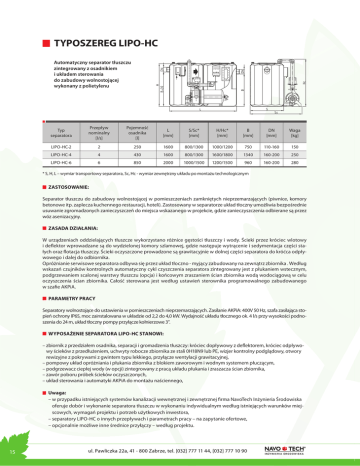 TYPOSZEREG LIPO-HC Automatyczny separator tłuszczu zintegrowany z osadnikiem i układem sterowania do zabudowy wolnostojącej wykonany z polietylenu Typ separatora Przepływ nominalny [l/s] Pojemność osadnika [l] L [mm] S/Sc* [mm] H/Hc* [mm] B [mm] DN [mm] Waga [kg] LIPO-HC-2 2 250 1600 800/1300 1000/1200 750 110-160 150 LIPO-HC-4 4 430 1600 800/1300 1600/1800 1340 160-200 250 LIPO-HC-6 6 850 2000 1000/1500 1200/1500 960 160-200 280 * S, H, L – wymiar transportowy separatora, Sc, Hc - wymiar zewnętrzny układu po montażu technologicznym ZASTOSOWANIE: Separator tłuszczu do zabudowy wolnostojącej w pomieszczeniach zamkniętych nieprzemarzających (piwnice, komory betonowe itp. zaplecza kuchennego restauracji, hoteli). Zastosowany w separatorze układ tłoczny umożliwia bezpośrednie usuwanie zgromadzonych zanieczyszczeń do miejsca wskazanego w projekcie, gdzie zanieczyszczenia odbierane są przez wóz asenizacyjny. ZASADA DZIAŁANIA: W urządzeniach oddzielających tłuszcze wykorzystano różnice gęstości tłuszczy i wody. Ścieki przez króciec wlotowy i deflektor wprowadzane są do wydzielonej komory szlamowej, gdzie następuje wytrącenie i sedymentacja części stałych oraz flotacja tłuszczy. Ścieki oczyszczone prowadzone są grawitacyjnie w dolnej części separatora do króćca odpływowego i dalej do odbiornika. Opróżnianie serwisowe separatora odbywa się przez układ tłoczno - myjący zabudowany na zewnątrz zbiornika . Według wskazań czujników kontrolnych automatyczny cykl czyszczenia separatora zintegrowany jest z płukaniem wstecznym, podgrzewaniem scalonej warstwy tłuszczu (opcja) i końcowym zraszaniem ścian zbiornika wodą wodociągową w celu oczyszczenia ścian zbiornika. Całość sterowana jest według ustawień sterownika programowalnego zabudowanego w szafie AKPiA. PARAMETRY PRACY Separatory wolnostojące do ustawienia w pomieszczeniach nieprzemarzających. Zasilanie AKPiA: 400V 50 Hz, szafa zasilająca stopień ochrony IP65, moc zainstalowana w układzie od 2,2 do 4,0 kW. Wydajność układu tłocznego ok. 4 l/s przy wysokości podnoszenia do 24 m, układ tłoczny pompy przyłącze kołnierzowe 3”. WYPOSAŻENIE SEPARATORA LIPO-HC STANOWI: – zbiornik z przedziałem osadnika, separacji i gromadzenia tłuszczy: króciec dopływowy z deflektorem, króciec odpływowy ścieków z przedłużeniem, uchwyty robocze zbiornika ze stali 0H18N9 lub PE, wizjer kontrolny podglądowy, otwory rewizyjne z pokrywami z gwintem typu lekkiego, przyłącze wentylacji grawitacyjnej, – pompowy układ opróżniania i płukania zbiornika z blokiem zaworowym i wodnym systemem płuczącym, – podgrzewacz ciepłej wody (w opcji) zintegrowany z pracą układu płukania i zraszacza ścian zbiornika, – zawór poboru próbek ścieków oczyszczonych, – układ sterowania i automatyki AKPiA do montażu naściennego, Uwaga: – w przypadku istniejących systemów kanalizacji wewnętrznej i zewnętrznej firma NavoTech Inżynieria Środowiska oferuje dobór i wykonanie separatora tłuszczu w wykonaniu indywidualnym według istniejących warunków miejscowych, wymagań projektu i potrzeb użytkowych inwestora, – separatory LIPO-HC o innych przepływach i parametrach pracy – na zapytanie ofertowe, – opcjonalnie możliwe inne średnice przyłączy – według projektu. 15 ul. Pawliczka 22a, 41 - 800 Zabrze, tel. [032] 777 11 44, [032] 777 10 90
