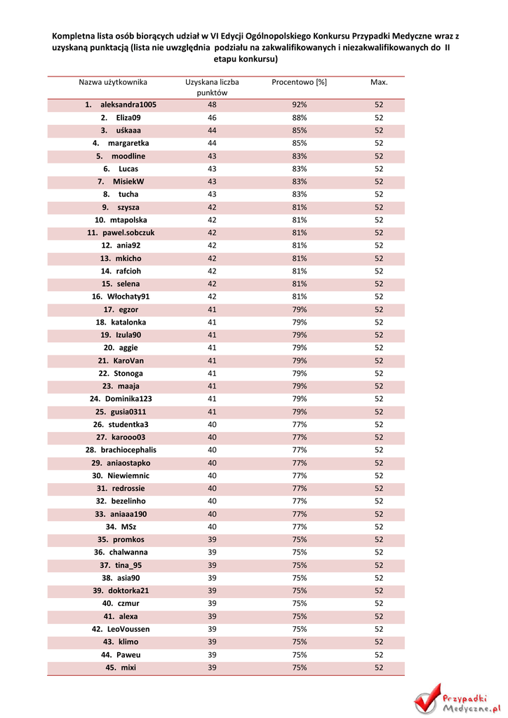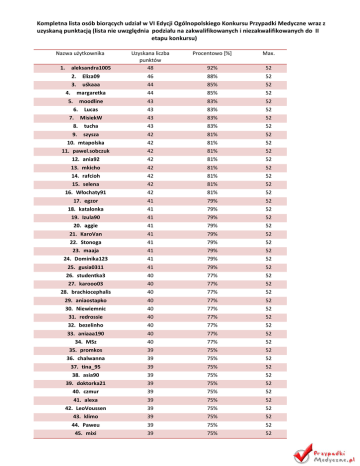 Kompletna lista osób biorących udział w VI Edycji Ogólnopolskiego Konkursu Przypadki Medyczne wraz z uzyskaną punktacją (lista nie uwzględnia podziału na zakwalifikowanych i niezakwalifikowanych do II etapu konkursu) Nazwa użytkownika Uzyskana liczba punktów 48 46 44 Procentowo [%] Max. 92% 88% 85% 52 52 52 4. margaretka 5. moodline 6. Lucas 7. MisiekW 8. tucha 9. szysza 10. mtapolska 44 43 43 43 43 42 42 85% 83% 83% 83% 83% 81% 81% 52 52 52 52 52 52 52 11. pawel.sobczuk 12. ania92 13. mkicho 14. rafcioh 15. selena 16. Włochaty91 42 42 42 42 42 42 81% 81% 81% 81% 81% 81% 52 52 52 52 52 52 17. egzor 18. katalonka 41 41 79% 79% 52 52 19. Izula90 20. aggie 21. KaroVan 22. Stonoga 23. maaja 24. Dominika123 25. gusia0311 41 41 41 41 41 41 41 79% 79% 79% 79% 79% 79% 79% 52 52 52 52 52 52 52 26. studentka3 27. karooo03 28. brachiocephalis 29. aniaostapko 30. Niewiemnic 31. redrossie 32. bezelinho 40 40 40 40 40 40 40 77% 77% 77% 77% 77% 77% 77% 52 52 52 52 52 52 52 33. aniaaa190 40 77% 52 34. MSz 35. promkos 36. chalwanna 37. tina_95 38. asia90 39. doktorka21 40. czmur 40 39 39 39 39 39 39 77% 75% 75% 75% 75% 75% 75% 52 52 52 52 52 52 52 41. alexa 42. LeoVoussen 43. klimo 44. Paweu 45. mixi 39 39 39 39 39 75% 75% 75% 75% 75% 52 52 52 52 52 1. aleksandra1005 2. Eliza09 3. uśkaaa Kompletna lista osób biorących udział w VI Edycji Ogólnopolskiego Konkursu Przypadki Medyczne wraz z uzyskaną punktacją (lista nie uwzględnia podziału na zakwalifikowanych i niezakwalifikowanych do II etapu konkursu) 46. Agouti 47. ciniminis 48. marciat 49. spyrkadaniel 50. barlek 39 38 38 38 38 75% 73% 73% 73% 73% 52 52 52 52 52 51. Paulina2311 52. Zaba93 53. Paulinaa 54. elfiatka92 55. wloczykij3 56. MisiuWielki 57. Kosik 38 38 38 38 38 38 38 73% 73% 73% 73% 73% 73% 73% 52 52 52 52 52 52 52 58. Matebugate 59. k8m1l 60. thirteen 61. anitagor 62. Dynayr 63. nataliaa4442 64. willvonb 65. aster 38 38 38 38 38 38 38 37 73% 73% 73% 73% 73% 73% 73% 71% 52 52 52 52 52 52 52 52 66. Agnieszka20 67. medycyniara 68. fieryscissors 69. Margaret_92 70. Star-witness 71. medlek4444 72. lekinspe 37 37 37 37 37 37 37 71% 71% 71% 71% 71% 71% 71% 52 52 52 52 52 52 52 73. armaxm 74. ekim 75. margot999 76. juliad 77. agatakr 78. going_slightly_mad 79. gersimi 37 37 37 37 37 37 37 71% 71% 71% 71% 71% 71% 71% 52 52 52 52 52 52 52 80. cintaroja 37 71% 52 81. marcelina.myszynska 82. miiisiaa 83. kot.schrodingera 84. monka22 85. kolcztomek 86. Jestemzwyciezca 87. Dracarys 37 37 37 37 37 37 36 71% 71% 71% 71% 71% 71% 69% 52 52 52 52 52 52 52 88. janka_otruli 36 69% 52 89. aniap. 90. aina_m218 91. monko 36 36 36 69% 69% 69% 52 52 52 Kompletna lista osób biorących udział w VI Edycji Ogólnopolskiego Konkursu Przypadki Medyczne wraz z uzyskaną punktacją (lista nie uwzględnia podziału na zakwalifikowanych i niezakwalifikowanych do II etapu konkursu) 92. potfur 93. czuczubaka 94. pietras 95. irsin 96. Cathierine 36 36 36 36 36 69% 69% 69% 69% 69% 52 52 52 52 52 97. moscati 98. Jakub9999 99. karolina.roza 100. legolas55 101. dusiołak 102. Karolina W 103. merymaid 36 36 36 36 36 36 36 69% 69% 69% 69% 69% 69% 69% 52 52 52 52 52 52 52 104. ewc.2 105. NessLoch 106. 91red91 107. topaz 108. pyrka 109. strzelcu 110. David1093 111. ewa76 36 36 35 35 35 35 35 35 69% 69% 67% 67% 67% 67% 67% 67% 52 52 52 52 52 52 52 52 112. morwsin 113. Kurcio88 114. karolcia157 115. plankk 116. g.sinica 117. EdytaMCh 118. MilenaRurka 35 35 35 35 35 35 35 67% 67% 67% 67% 67% 67% 67% 52 52 52 52 52 52 52 119. dido3 120. manteeno 121. amap29 122. emilola93 123. mannitol-ka 124. Idan 125. Camillus 35 35 35 35 35 35 35 67% 67% 67% 67% 67% 67% 67% 52 52 52 52 52 52 52 126. Koksybek 34 65% 52 127. kanarek 128. zanet 129. neuro 130. Nadis 131. poklewski76 132. kapuściany łeb 133. dianus.4 34 34 34 34 34 34 34 65% 65% 65% 65% 65% 65% 65% 52 52 52 52 52 52 52 134. lusine93 34 65% 52 135. polinezja 136. pceglarek 137. james.j 34 34 34 65% 65% 65% 52 52 52 Kompletna lista osób biorących udział w VI Edycji Ogólnopolskiego Konkursu Przypadki Medyczne wraz z uzyskaną punktacją (lista nie uwzględnia podziału na zakwalifikowanych i niezakwalifikowanych do II etapu konkursu) 138. agaa93 139. pat 140. Bordetella 141. dawstor 142. anaretka18 34 34 34 34 34 65% 65% 65% 65% 65% 52 52 52 52 52 143. anetama333 144. mateuszducki 145. karolina1727 146. mamilo 147. izas 148. KubaR 149. obol 34 34 34 34 34 34 34 65% 65% 65% 65% 65% 65% 65% 52 52 52 52 52 52 52 150. olk91 151. Beata03 152. merci-13 153. Kapib93 154. adwenturyn 155. rolbi04 156. Kokosza1993pl 157. remigiusz.domin 34 34 33 33 33 33 33 33 65% 65% 63% 63% 63% 63% 63% 63% 52 52 52 52 52 52 52 52 158. peter92 159. ladybird 160. lolek1 161. Aselir 162. miloszch 163. aliceinwonderland 164. MatkaDyrektorka 33 33 33 33 33 33 33 63% 63% 63% 63% 63% 63% 63% 52 52 52 52 52 52 52 165. Kniewulska 166. BartekSko 167. agamsz 168. n.bieszczad 169. korek14 170. Zireael 171. yoda94 33 33 33 33 33 33 33 63% 63% 63% 63% 63% 63% 63% 52 52 52 52 52 52 52 172. Niedzialko 33 63% 52 173. sookie 174. b_kostka 175. Kinia14 176. ala_stankiewicz 177. humerus 178. lidka 179. karola_9306 32 32 32 32 32 32 32 62% 62% 62% 62% 62% 62% 62% 52 52 52 52 52 52 52 180. plinde 32 62% 52 181. Chickenka 182. clexane 183. daw17 32 32 32 62% 62% 62% 52 52 52 Kompletna lista osób biorących udział w VI Edycji Ogólnopolskiego Konkursu Przypadki Medyczne wraz z uzyskaną punktacją (lista nie uwzględnia podziału na zakwalifikowanych i niezakwalifikowanych do II etapu konkursu) 184. gusbbb 185. gosiaryk 186. paulissskaa 187. temp 188. W.Pielesiak 32 32 31 31 31 62% 62% 60% 60% 60% 52 52 52 52 52 189. ania12ka 190. kasia1 191. Mik 192. Werbel 193. Incognito 194. klaudus63821 195. domcio_med 31 31 31 31 31 31 31 60% 60% 60% 60% 60% 60% 60% 52 52 52 52 52 52 52 196. doktorzosia 197. poogy 198. mycroft 199. rekawiecki.b 200. nadolnix 201. Katherina 202. angie1363 203. Chriss 31 31 31 31 31 30 30 30 60% 60% 60% 60% 60% 58% 58% 58% 52 52 52 52 52 52 52 5