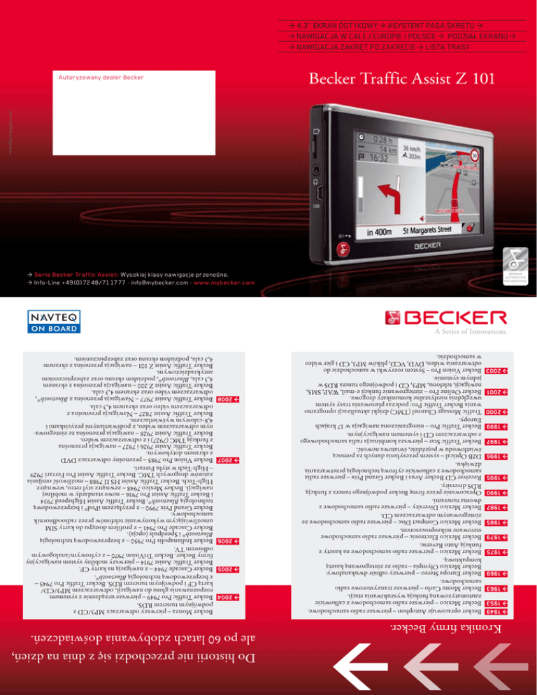 Kronika firmy Becker. > 1949 Becker opracowuje Autophon – pierwsze radio samochodowe. > 1953 Becker Mexico – pierwsze radio samochodowe z całkowicie zautomatyzowaną funkcją wyszukiwania stacji. > 1963 Becker Monte Carlo – pierwsze tranzystorowe radio samochodowe. > 1969 Becker Europa Stereo – pierwszy odbiór dwukanałowy. Becker Mexico Olympia – radio ze zintegrowaną kasetą kompaktową. > 1975 Becker Mexico – pierwsze radio samochodowe na kasety z funkcją Auto Reverse. > 1979 Becker Mexico Electronic – pierwsze radio samochodowe sterowane mikroprocesorem. > 1985 Becker Mexico Compact Disc – pierwsze radio samochodowe ze zintegrowanym odtwarzaczem CD. > 1987 Becker Mexico Diversity – pierwsze radio samochodowe z dwoma tunerami. > 1990 Opracowanie przez firmę Becker podwójnego tunera z funkcją RDS diversity. > 1995 Receiver CD Becker Avus i Becker Grand Prix – pierwsze radia samochodowe z całkowicie cyfrową technologią przetwarzania dźwięku. > 1996 D2B Optical – system przesyłania danych za pomocą światłowodu w pojeździe, światowa nowość. > 1997 Becker Traffic Star – pierwsza kombinacja radia samochodowego z odtwarzaczem CD i systemem nawigacyjnym. > 1999 Becker Traffic Pro – nieograniczona nawigacja w 17 krajach Europy. > 2000 Traffic Message Channel (TMC) dzięki aktualizacji oprogramo wania Becker Traffic Pro: podczas planowania trasy system uwzględnia niesłyszalne komunikaty drogowe. > 2001 Becker Online Pro – zintegrowanie funkcji e-mail, WAP, SMS, nawigacji, telefonu, MP3, CD i podwójnego tunera RDS w jednym systemie. > 2003 Becker Vision Pro – System rozrywki w samochodzie do odtwarzania wideo, DVD, VCD, plików MP3, CD i gier wideo w samochodzie. Do historii nie przechodzi się z dnia na dzień, ale po 60 latach zdobywania doświadczeń. > 2004 > 2005 > 2006 > 2007 > 2008 Becker Monza – pierwszy odtwarzacz MP3/CD z podwójnym tunerem RDS. Becker Traffic Pro 7949 – pierwsze urządzenie z systemem rozpoznawania głosu do nawigacji, odtwarzaczem MP3/CD/ kartą CF i podwójnym tunerem RDS. Becker Traffic Pro 7945 – z bezprzewodową technologią Bluetooth®. Becker Cascade 7944 – z nawigacją na karty CF. Becker Traffic Assist 7914 – pierwszy mobilny system nawigacyjny firmy Becker. Becker TriVision 7970 – z cyfrowym/analogowym odbiorem TV. Becker Indianapolis Pro 7950 – z bezprzewodową technologią Bluetooth® i Speedpuls (opcja). Becker Cascade Pro 7941 – z profilem dostępu do karty SIM umożliwiającym wykonywanie telefonów przez radioodbiornik samochodowy. Becker Grand Prix 7990 – z przyłączem iPod® i bezprzewodową technologią Bluetooth®. Becker Traffic Assist Highspeed 7934 i Becker Traffic Assist Pro 7916 – nowe standardy w mobilnej nawigacji. Becker Mexico 7948 – zewnątrz styl retro, wewnątrz High-Tech. Becker Traffic Assist HS II 7988 – możliwość omijania zatorów drogowych TMC. Becker Traffic Assist Pro Ferrari 7929 – High-Tech w stylu Ferrari. Becker Vision Pro 7985 – przenośny odtwarzacz DVD z ekranem dotykowym. Becker Traffic Assist 7926 i 7927 – nawigacja przenośna z funkcją TMC (7927) i z odtwarzaczem wideo. Becker Traffic Assist 7928 – nawigacja przenośna ze zintegrowa- nym odtwarzaczem wideo, z podświetlanymi przyciskami i 4,8-calowym wyświetlaczem. Becker Traffic Assist 7827 – Nawigacja przenośna z odtwarzaczem video oraz ekranem 4,3 cala. Becker Traffic Assist 7977 – Nawigacja przenośna z Bluetooth®, odtwarzaczem video oraz ekranem 4,3 cala. Becker Traffic Assist Z 200 – nawigacja przenośna z ekranem 4,3 cala, Bluetooth®, podziałem ekranu oraz zabezpieczeniem antykradzieżowym. Becker Traffic Assist Z 101 – nawigacja przenośna z ekranem 4,3 cala, podziałem ekranu oraz zabezpieczeniem. 2. Simulation Kleber Weiß/Silber (Heißfoli > Seria Becker Traffic Assist: Wysokiej klasy nawigacje przenośne. > Info-Line +49(0)7248/7117 77 · [email protected] · www.mybecker.com German Automotive engineering www.finestmagma.com Becker Traffic Assist Z 101 Autoryzowany dealer Becker > 4.3‘‚ ekran dotykowy > asystent pasa skretu > > Nawigacja w całej Europie i Polsce > Podział ekranu > > nawigacja zakręt po zakręcie > Lista trasy > Cechy produktu Obsługa: Interfejs Użytkownika Becker – specjalnie stworzone menu, bardzo prosta obsługa i łatwy dostęp do zaawansowanej technologii Automatyczne wł./wył.: automatycznie włączanie/wyłączanie urządzenia po starcie silnika lub jego wyłączeniu Planowanie trasy z uwzględnieniem punktów przejazdowych z określeniem czasu dojazdu Split-Screen (podział ekranu, dla większej ilości informacji) Nawigacja zakręt po zakręcie (nawigacja poprzez strzałkę nawigacyjną) 2D/3D/zoom Symulacja toru jazdy w tunelu > NAWIGACJA Szereg możliwości wprowadzania celu: kod pocztowy, numer budynku, skrzyżowanie, punkty POI Specjalne punkty docelowe POI: lotniska, szpitale, stacje paliw, dworce kolejowe, hotele, restauracje, stadiony sportowe itd. Punkty POI na trasie: automatyczne wyszukiwanie punktów POI jedynie wzdłuż wyznaczonej trasy jazdy, np. stacje benzynowe, parkingi Historia wyszukiwanych celów: 100 stałych i ostatnio wyszukiwanych celów Lista trasy: Wylistowanie pojedynczych odcinków trasy Informacja o trasie: wyświetlanie czasu dojazdu do celu, przewidywanego czasu jazdy i odległości do celu (także w przypadku wprowadzenia punktów tranzytowych) Wybór trasy (dozwolone/unikaj/niedozwolone): autostrada, drogi płatne, przeprawy promowe Opcje trasy: najkrótsza, najszybsza, optymalna, widokowa Kalkulacja trasy: możliwość wyboru profilu (pojazd zwykły, pojazd szybki, pojazd wolny, samochód ciężarowy, motocykl, rower, pieszy) Nawigacja: komunikaty głosowe oraz menu w różnych językach (BR, CA, CZ, D, DK, E, F, FIN, GB, GR, HU, I, MX, N, NL, P, PL, RU, S, TR, US, Vlaams) Mapy: NAVTEQ (regularna aktualizacja map) Dostępne kraje: Austria, Albania, Andora, Belgia, Białoruś, Bośnia-Her