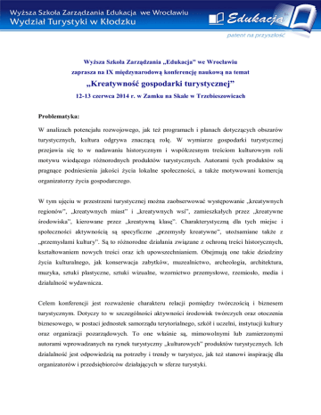Wyższa Szkoła Zarządzania „Edukacja” we Wrocławiu zaprasza na IX międzynarodową konferencję naukową na temat „Kreatywność gospodarki turystycznej” 12-13 czerwca 2014 r. w Zamku na Skale w Trzebieszowicach Problematyka: W analizach potencjału rozwojowego, jak też programach i planach dotyczących obszarów turystycznych, kultura odgrywa znaczącą rolę. W wymiarze gospodarki turystycznej przejawia się to w nadawaniu historycznym i współczesnym treściom kulturowym roli motywu wiodącego różnorodnych produktów turystycznych. Autorami tych produktów są pragnące podniesienia jakości życia lokalne społeczności, a także motywowani komercją organizatorzy życia gospodarczego. W tym ujęciu w przestrzeni turystycznej można zaobserwować występowanie „kreatywnych regionów”, „kreatywnych miast” i „kreatywnych wsi”, zamieszkałych przez „kreatywne środowiska”, kierowane przez „kreatywną klasę”. Charakterystyczną dla tych miejsc i społeczności aktywnością są specyficzne „przemysły kreatywne”, utożsamiane także z „przemysłami kultury”. Są to różnorodne działania związane z ochroną treści historycznych, kształtowaniem nowych treści oraz ich upowszechnianiem. Obejmują one takie dziedziny życia kulturalnego, jak konserwacja zabytków, muzealnictwo, archeologia, architektura, muzyka, sztuki plastyczne, sztuki wizualne, wzornictwo przemysłowe, rzemiosło, media i działalność wydawnicza. Celem konferencji jest rozważenie charakteru relacji pomiędzy twórczością i biznesem turystycznym. Dotyczy to w szczególności aktywności środowisk twórczych oraz otoczenia biznesowego, w postaci jednostek samorządu terytorialnego, szkół i uczelni, instytucji kultury oraz organizacji pozarządowych. To one właśnie są, mimowolnymi lub zamierzonymi autorami wprowadzanych na rynek turystyczny „kulturowych” produktów turystycznych. Ich dzialalność jest odpowiedzią na potrzeby i trendy w turystyce, jak też stanowi inspirację dla organizatorów i przedsiębiorców działających w sferze turystyki. Zakres tematyczny W relacjach z badań naukowych i osobistych doświadczeń będących podstawą dyskusji i wymiany poglądów, poszukuje się odniesień do następujących problemów: specyfika sektora kreatywnego w turystyce; sztuka jako odpowiedź na nowe potrzeby i trendom we współczesnej turystyce; trendy i potrzeby sektora kreatywnego; zarządzanie sektorem kreatywnym w turystyce; instytucjonalne wsparcie sztuki dla potrzeb turystyki; powiązania nauki z biznesem w sferze przemysłów kreatywnych; oryginalność turystycznych, „kulturowych” produktów w świetle etyki i prawa; ekonomika wytwarzania „produktów kreatywnych” dla potrzeb turystyki; Intencją organizatorów jest to, aby konferencja miała charakter interdyscyplinarny, co pozwoli na konfrontację obserwacji dokonanych z różnej perspektywy badawczej. Komitet naukowy: Przewodniczący: dr inż. arch. Mieczysław K. Leniartek Sekretarz naukowy: dr Teresa Bogacz Członkowie: prof. dr hab. Jan Grad, Uniwersytet im. Adama Mickiewicza w Poznaniu prof. dr hab. Ryszard W. Kluszczyński, Uniwersytet Łódzki prof. dr hab. Lesław Koćwin, Wyższa Szkoła Handlowa we Wrocławiu prof. dr hab. Włodzimierz Kurek, Uniwersytet Jagielloński prof. dr hab. Krzysztof R. Mazurski, Wyższa Szkoła Zarządzania „Edukacja” we Wrocławiu prof. dr hab. inż. arch. Anna Mitkowska, Politechnika Krakowska prof. dr hab. inż. arch. Jacek Suchodolski, Politechnika Wrocławska dr hab. Barbara Lubicz-Miszewska, Wyższa Szkoła Zarządzania „Edukacja” we Wrocławiu dr hab. Wiesława Żyszkowska, Wyższa Szkoła Zarządzania „Edukacja” we Wrocławiu Komitet organizacyjny: dr Jolanta Kowal – Prorektor WSZ „Edukacja” dr Robert Piechota – Dziekan Wydziału Turystyki WSZ-E dr Włodzimierz Ranoszek Komitet honorowy: dr Marek Lewandowski – Rektor WSZ „Edukacja” Urszula Nowak – Prezes OKiDZ „Edukacja” Maciej Awiżeń – Starosta Kłodzki Bogusław Szpytma – Burmistrz Kłodzka Stanisław Longawa – Wójt Gminy Kłodzko Sekretarz konferencji: Joanna Przerywacz- Orzechowska tel. 74 867 05 53 e-mail: [email protected] Miejsce konferencji: Hotel Zamek na Skale w Trzebieszowicach http://www.zameknaskale.com.pl Opłata konferencyjna wynosi 500,00 (pięćset) zł i pokrywa koszty opublikowania dostarczonego przez uczestników konferencji tekstu w recenzowanej pracy zbiorowej oraz otrzymanie materiałów konferencyjnych i pokonferencyjnych. Opłata nie obejmuje noclegu w Hotelu Zamek na Skale. Podaną kwotę należy wpłacić na konto: Wyższa Szkoła Zarządzania „Edukacja” we Wrocławiu 50-425 Wrocław, ul. Krakowska 56-62 11 1020 5226 0000 6702 0019 0918 do 15 maja 2014 r., z adnotacją Konferencja Kłodzko 2014. Tekst w 2. egzemplarzach wydruku oraz na płycie CD należy dostarczyć najpóźniej do 15 kwietnia 2014 r. na niżej podany adres Dodatkowo tekst referatu należy przesłać za pośrednictwem poczty elektronicznej na adres: [email protected] Wydział Turystyki Wyższej Szkoły Zarządzania „Edukacja”, ul. Wyspiańskiego 2 F, 57-300 Kłodzko z adnotacją KONFERENCJA KŁODZKO 2014. Informacje organizacyjne: Konferencja odbędzie się Termin nadsyłania kart zgłoszeń ze streszczeniami: Termin wniesienia opłaty konferencyjnej Termin ogłoszenia programu konferencji Termin nadsyłania referatów: 12-13 czerwca 2014 r. 15 maja 2014 r. 15 maja 2014 r. 07 czerwca 2014 r. 31 maja 2014 r. W celu usprawnienia procesu wydawniczego prosimy o przestrzeganie poniższych zasad: imię i nazwisko autora/ów – czcionka 12 pkt; nazwa uczelni i jednostki organizacyjnej (w jęz. polskim i angielskim) – czcionka 12 pkt; tytuł referatu (w jęz. polskim i angielskim) – czcionka 14 pkt, bold; podtytuły – czcionka 12 pkt. bold; objętość referatu (wraz z ilustracjami i tabelami) nie powinna przekraczać 15 stron formatu A4; czcionka – typu 