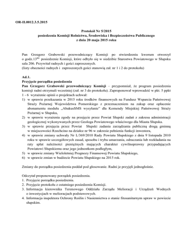 OR-II.0012.3.5.2015 Protokół Nr 5/2015 posiedzenia Komisji Rolnictwa, Środowiska i Bezpieczeństwa Publicznego z dnia 20 maja 2015 roku Pan Grzegorz Grabowski przewodniczący Komisji po stwierdzeniu kworum otworzył o godz.1300 posiedzenie Komisji, które odbyło się w siedzibie Starostwa Powiatowego w Słupsku sala 206. Przywitał radnych i gości zaproszonych. (listy obecności radnych i zaproszonych gości stanowią zał. nr 1 i 2 do protokołu) Ad.1. Przyjęcie porządku posiedzenia Pan Grzegorz Grabowski przewodniczący Komisji – przypomniał, że program posiedzenia komisji radni otrzymali wcześniej (zał. nr 3 do protokołu). Zaproponował wprowadzić w pkt. 5 ppkt 1 - 6 wyrażenie opinii o projektach uchwał: 1) w sprawie przekazania w 2015 roku środków finansowych na Fundusz Wsparcia Państwowej Straży Pożarnej Województwa Pomorskiego z przeznaczeniem na zakup oraz opłacenie abonamentu modułu „AbakusSMS wysyłanie” dla Komendy Miejskiej Państwowej Straży Pożarnej w Słupsku, 2) w sprawie wyrażenia zgody na przejęcie przez Powiat Słupski zadań z zakresu administracji geologicznej wykonywanych przez Geologa Powiatowego właściwego dla Miasta Słupska. 3) w sprawie przejęcia przez Powiat Słupski zadania zarządzania publiczną drogą gminną w miejscowości Rzechcino na działce nr 96 w zakresie pełnienia funkcji inwestora, 4) w sprawie zmiany uchwały Nr L/369/2010 Rady Powiatu Słupskiego z dnia 9 listopada 2010 roku w sprawie szczegółowych zasad, sposobu i trybu umarzania, odraczania lub rozkładania na raty spłat należności pieniężnych mających charakter cywilnoprawny przypadających Powiatowi Słupskiemu oraz jego jednostkom podległym, 5) w sprawie zmiany Wieloletniej Prognozy Finansowej Powiatu Słupskiego, 6) w sprawie zmian w budżecie Powiatu Słupskiego na 2015 rok. Zmiany do porządku posiedzenia poddał pod głosowanie. Radni je przyjęli jednogłośnie. Odczytał proponowany porządek posiedzenia. 1. Przyjęcie porządku posiedzenia. 2. Przyjęcie protokołu z ostatniego posiedzenia Komisji. 3. Informacja kierownika Terenowego Oddziału Zarządu Melioracji i Urządzeń Wodnych o inwestycjach w melioracjach podstawowych. 4. Informacja inspektora Ochrony Roślin i Nasiennictwa o stanie fitosanitarnym upraw w powiecie słupskim. 2 5. Wyrażenie opinii o projektach uchwał: 1) w sprawie przekazania w 2015 roku środków finansowych na Fundusz Wsparcia Państwowej Straży Pożarnej Województwa Pomorskiego z przeznaczeniem na zakup oraz opłacenie abonamentu modułu „AbakusSMS wysyłanie” dla Komendy Miejskiej Państwowej Straży Pożarnej w Słupsku, 2) w sprawie wyrażenia zgody na przejęcie przez Powiat Słupski zadań z zakresu administracji geologicznej wykonywanych przez Geologa Powiatowego właściwego dla Miasta Słupska, 3) w sprawie przejęcia przez Powiat Słupski zadania zarządzania publiczną drogą gminną w miejscowości Rzechcino na działce nr 96 w zakresie pełnienia funkcji inwestora, 4) w sprawie zmiany uchwały Nr L/369/2010 Rady Powiatu Słupskiego z dnia 9 listopada 2010 roku w sprawie szczegółowych zasad, sposobu i trybu umarzania, odraczania lub rozkładania na raty spłat należności pieniężnych mających charakter cywilnoprawny przypadających Powiatowi Słupskiemu oraz jego jednostkom podległym, 5) w sprawie zmiany Wieloletniej Prognozy Finansowej Powiatu Słupskiego, 6) w sprawie zmian w budżecie Powiatu Słupskiego na 2015 rok. 6. Sprawy różne. Projekt posiedzenia poddał pod głosowanie. W wyniku głosowania stwierdził, że został przyjęty jednogłośnie. Ad. 2 Przyjęcie protokołu z ostatniego posiedzenia Komisji Pan Grzegorz Grabowski przewodniczący Komisji – zapytał, czy ktoś z radnych ma uwagi do protokołu z ostatniego posiedzenia komisji. Uwag nie było. Protokół poddał pod głosowanie. W wyniku głosowania radni protokół przyjęli jednogłośnie. Ad 3 Informacja kierownika Terenowego Oddziału Zarządu Melioracji i Urządzeń Wodnych o inwestycjach w melioracjach podstawowych Pani Beata Bernas kierownik Terenowego Oddziału Zarządu Melioracji i Urządzeń Wodnych o inwestycjach w melioracjach podstawowych - poinformowała o inwestycjach, które zrealizowali w ostatnich czterech latach. Sztandarową inwestycją była przebudowa stacji pomp Modła I na folderze Modła. Jest to najważniejsza stacja pomp ponieważ zawiaduje całą gospodarką wodną w tym folderze. Kiedy morze nie jest podpiętrzone, wówczas woda spływa grawitacyjnie. Kiedy stan morza jest wyższy zamykają się zasuwy sztormowe i woda jest przepompowywana. Również dzięki tej stacji można utrzymywać stały poziom wody na jeziorze Modła. Jest na tyle ważne, ponieważ jest to rezerwat ptasi, w związku z tym nie ma nadmiernego odpływu wody. Gdyby był niski stan wód w morzu, można tę wodę podpiętrzać. Omówiła w szczegółach sposób przebudowy stacji. Wydajność tej stacji po przebudowie wzrosła trzykrotnie. Przyszłościowo planują przebudowę wałów na tym folderze. Następna przebudowa, to stacja pomp Gardna G VI, która znajduje się obok miejscowości Rowy. Również została zwiększona wydajność tej stacji z 1,58m3/s, na 2,4 m/s. Ta stacja oddziałuje na duży obszar tj. 1700 h, Modła 1 na 1800 ha. 3 W zasięgu oddziaływania tej stacji znajdują się Rowy, Objazda i Retowy. Rolę stacji Gardna V (awaryjnej) przejęła stacja przebudowana. Następna przebudowana stacja to Gardna VIII. Budynek tej stacji został podany modernizacji, natomiast cały obieg stacji jest położony odrębnie. Również została zwiększona jej wydajność. Oddziaływanie tej stacji jest na 540 ha, jest dość ważna, ze względu zasięgu, który obejmuje miejscowość Gardna. Dodała, że stacje V – VI i VII związane są z jeziorem Gardna. Odgrywają ważną rolę kiedy podnosi się woda na jeziorze. Dodała, że zagrożenie powodziowe nie jest wtedy kiedy są duże opady, tylko przy sztormach, g
