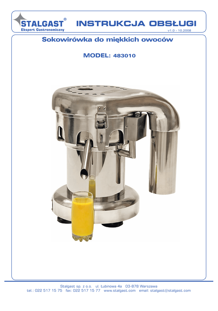 INSTRUKCJA OBSŁUGI v1.0 - 10.2008 Sokowirówka do miękkich owoców MODEL: 483010 Stalgast sp. z o.o. ul. Łubinowa 4a 03-878 Warszawa tel.: 022 517 15 75 fax: 022 517 15 77 www.stalgast.com email: [email protected] INFORMACJE OGÓLNE Urządzenie przeznaczone jest do obróbki miękkich owoców. Otrzymany w wyniku obróbki sok jest automatycznie oddzielany od miąższu dzięki sile odśrodkowej uzyskanej podczas wirowania. Sokowirówka charakteryzuje się wysoką wydajnością, łatwością obsługi oraz bezpieczeństwem. Konstrukcja ułatwia utrzymanie urządzenia w czystości. Obudowa wykonana została ze stopu aluminium. Części wchodzące w bezpośredni kontakt z przerabianymi produktami wykonane są ze stali nierdzewnej. OBSŁUGA URZĄDZENIA Przed pierwszym użyciem urządzenia należy upewnić się czy napięcie urządzenia jest zgodne z napięciem dostępnym w miejscu instalacji. Urządzenie należy podłączyć do źródła prądu z uziemieniem. Napięcie urządzenia widnieje na tabliczce znamionowej. 1. Zdjąć pokrywę, odkręcić nakrętkę mocującą tarcze tnącą. Wyjąć tarcze, sito oraz pojemnik odprowadzający sok i dokładnie wymyć i osuszyć. Ponownie zainstalować wymyte części. Upewnić się, że nakrętka mocująca jest prawidłowo dokręcona. Nałożyć i zamocować pokrywę. 2. Podłożyć pojemnik na sok i miąższ. 3. Owoce należy oczyścić, pokroić na małe części. Pestki powinny zostać usunięte. 4. Urządzenie nie służy do obróbki owoców z dużymi pestkami (brzoskwinie, mango, itp.) jak również owoców zawierających małą ilość soku (banany, miąższ kokosa, itp.) 5. Produkty należy wkładać pionowo i dociskać za pomocą dostarczonego popychacza. UWAGA! Nie dopychać owoców za pomocą rąk! Nie używać innych przedmiotów niż dostarczony popychacz w celu dociskania przerabianych produktów. Nie zanurzać urządzenia w wodzie! DANE TECHNICZNE Model Napięcie Częstotliwość Moc Prędkość Średnica tarczy Wymiary Waga 483010 230 V 50 HZ 0,55 kW 2800 obr/min 145 mm 450x300x450 mm 23 kg