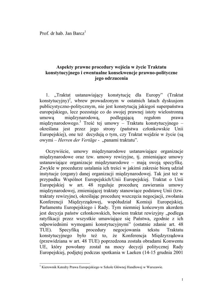 Prof. dr hab. Jan Barcz1 Aspekty prawne procedury wejścia w życie
