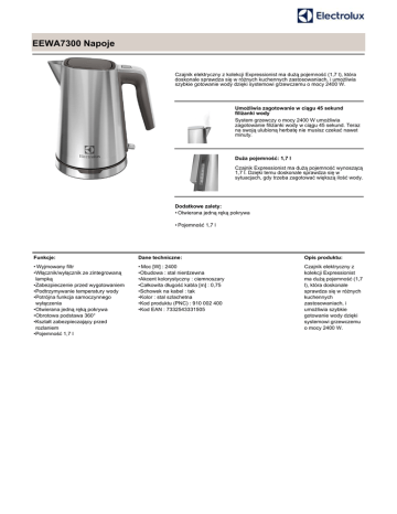 EEWA7300 Napoje Czajnik elektryczny z kolekcji Expressionist ma dużą pojemność (1,7 l), która doskonale sprawdza się w różnych kuchennych zastosowaniach, i umożliwia szybkie gotowanie wody dzięki systemowi grzewczemu o mocy 2400 W. Umożliwia zagotowanie w ciągu 45 sekund filiżanki wody System grzewczy o mocy 2400 W umożliwia zagotowanie filiżanki wody w ciągu 45 sekund. Teraz na swoją ulubioną herbatę nie musisz czekać nawet minuty. Duża pojemność: 1,7 l Czajnik Expressionist ma dużą pojemność wynoszącą 1,7 l. Dzięki temu doskonale sprawdza się w sytuacjach, gdy trzeba zagotować większą ilość wody. Dodatkowe zalety: • Otwierana jedną ręką pokrywa • Pojemność 1,7 l Funkcje: Dane techniczne: Opis produktu: • Wyjmowany filtr •Włącznik/wyłącznik ze zintegrowaną lampką •Zabezpieczenie przed wygotowaniem •Podtrzymywanie temperatury wody •Potrójna funkcja samoczynnego wyłączenia •Otwierana jedną ręką pokrywa •Obrotowa podstawa 360° •Kształt zabezpieczający przed rozlaniem •Pojemność 1,7 l • Moc [W] : 2400 •Obudowa : stal nierdzewna •Akcent kolorystyczny : ciemnoszary •Całkowita długość kabla [m] : 0,75 •Schowek na kabel : tak •Kolor : stal szlachetna •Kod produktu (PNC) : 910 002 400 •Kod EAN : 7332543331505 Czajnik elektryczny z kolekcji Expressionist ma dużą pojemność (1,7 l), która doskonale sprawdza się w różnych kuchennych zastosowaniach, i umożliwia szybkie gotowanie wody dzięki systemowi grzewczemu o mocy 2400 W.