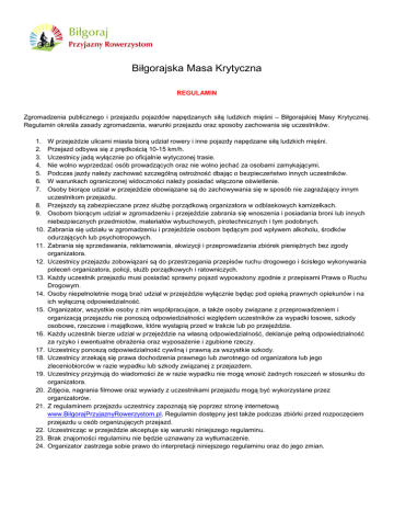 Biłgorajska Masa Krytyczna REGULAMIN Zgromadzenia publicznego i przejazdu pojazdów napędzanych siłą ludzkich mięśni – Biłgorajskiej Masy Krytycznej. Regulamin określa zasady zgromadzenia, warunki przejazdu oraz sposoby zachowania się uczestników. 1. 2. 3. 4. 5. 6. 7. 8. 9. 10. 11. 12. 13. 14. 15. 16. 17. 18. 19. 20. 21. 22. 23. 24. W przejeździe ulicami miasta biorą udział rowery i inne pojazdy napędzane siłą ludzkich mięśni. Przejazd odbywa się z prędkością 10-15 km/h. Uczestnicy jadą wyłącznie po oficjalnie wytyczonej trasie. Nie wolno wyprzedzać osób prowadzących oraz nie wolno jechać za osobami zamykającymi. Podczas jazdy należy zachować szczególną ostrożność dbając o bezpieczeństwo innych uczestników. W warunkach ograniczonej widoczności należy posiadać włączone oświetlenie. Osoby biorące udział w przejeździe obowiązane są do zachowywania się w sposób nie zagrażający innym uczestnikom przejazdu. Przejazdy są zabezpieczane przez służbę porządkową organizatora w odblaskowych kamizelkach. Osobom biorącym udział w zgromadzeniu i przejeździe zabrania się wnoszenia i posiadania broni lub innych niebezpiecznych przedmiotów, materiałów wybuchowych, pirotechnicznych i tym podobnych. Zabrania się udziału w zgromadzeniu i przejeździe osobom będącym pod wpływem alkoholu, środków odurzających lub psychotropowych. Zabrania się sprzedawania, reklamowania, akwizycji i przeprowadzania zbiórek pieniężnych bez zgody organizatora. Uczestnicy przejazdu zobowiązani są do przestrzegania przepisów ruchu drogowego i ścisłego wykonywania poleceń organizatora, policji, służb porządkowych i ratowniczych. Każdy uczestnik przejazdu musi posiadać sprawny pojazd wyposażony zgodnie z przepisami Prawa o Ruchu Drogowym. Osoby niepełnoletnie mogą brać udział w przejeździe wyłącznie będąc pod opieką prawnych opiekunów i na ich wyłączną odpowiedzialność. Organizator, wszystkie osoby z nim współpracujące, a także osoby związane z przeprowadzeniem i organizacją przejazdu nie ponoszą odpowiedzialności względem uczestników za wypadki losowe, szkody osobowe, rzeczowe i majątkowe, które wystąpią przed w trakcie lub po przejeździe. Każdy uczestnik bierze udział w przejeździe na własną odpowiedzialność, deklaruje pełną odpowiedzialność za ryzyko i ewentualne obrażenia oraz wyposażenie i zgubione rzeczy. Uczestnicy ponoszą odpowiedzialność cywilną i prawną za wszystkie szkody. Uczestnicy zrzekają się prawa dochodzenia prawnego lub zwrotnego od organizatora lub jego zleceniobiorców w razie wypadku lub szkody związanej z przejazdem. Uczestnicy przyjmują do wiadomości że w razie wypadku nie mogą wnosić żadnych roszczeń w stosunku do organizatora. Zdjęcia, nagrania filmowe oraz wywiady z uczestnikami przejazdu mogą być wykorzystane przez organizatorów. Z regulaminem przejazdu uczestnicy zapoznają się poprzez stronę internetową www.BilgorajPrzyjaznyRowerzystom.pl. Regulamin dostępny jest także podczas zbiórki przed rozpoczęciem przejazdu u osób organizujących przejazd. Uczestnicząc w przejeździe akceptuje się warunki niniejszego regulaminu. Brak znajomości regulaminu nie będzie uznawany za wytłumaczenie. Organizator zastrzega sobie prawo do interpretacji niniejszego regulaminu oraz do jego zmian.