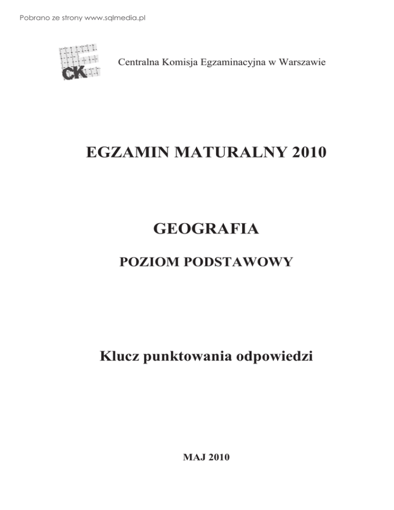 Pobrano ze strony www.sqlmedia.pl Centralna Komisja Egzaminacyjna w Warszawie EGZAMIN MATURALNY 2010 GEOGRAFIA POZIOM PODSTAWOWY Klucz punktowania odpowiedzi MAJ 2010 Pobrano ze strony www.sqlmedia.pl 2 Egzamin maturalny z geografii Klucz punktowania odpowiedzi – poziom podstawowy Zadanie 1. Korzystanie z informacji Odczytanie informacji geograficznych zapisanych na mapie 0í2 2 p. – za poprawne uzupeánienie czterech zdaĔ 1 p. – za poprawne uzupeánienie dwóch lub trzech zdaĔ Poprawna odpowiedĨ 1. 423 m n.p.m. 2. Ogrodzieniec 3. MiáoĞci 4. rezerwat przyrody, park krajobrazowy Zadanie 2. Korzystanie z informacji Rozpoznanie rodzaju skaáy przedstawionego na fotografii 0í1 1 p. – za zaznaczenie skaá, w których są wyrzeĨbione ostaĔce krasowe Poprawna odpowiedĨ D. osadowych pochodzenia organicznego. Zadanie 3. a) Korzystanie z informacji Wykonanie na podstawie mapy obliczeĔ matematyczno- 0í1 -geograficznych 1 p. – za poprawny sposób obliczenia i poprawny wynik Przykáad poprawnego rozwiązania 355 m n.p.m. í 330 m n.p.m. = 25 m b) Korzystanie z informacji OkreĞlenie na podstawie mapy miejsca zachodu SáoĔca w dniu przesilenia letniego 0í1 1 p. – za zaznaczenie nazwy wáaĞciwej miejscowoĞci Poprawna odpowiedĨ D. Grabowa Zadanie 4. Korzystanie z informacji Wykonanie na podstawie mapy pomiarów i obliczeĔ matematyczno-geograficznych 1 p. – za poprawny sposób obliczenia i poprawny wynik 0í1 Pobrano ze strony www.sqlmedia.pl Egzamin maturalny z geografii Klucz punktowania odpowiedzi – poziom podstawowy 3 Przykáad poprawnego rozwiązania OdlegáoĞü na mapie 3,5 cm 1 cm – 0,5 km 3,5 cm – x 3,5 x 0,5 km = 1,75 km § 1,8 km OdlegáoĞü w terenie 1,8 km Zadanie 5. Korzystanie z informacji Porównanie obszarów przedstawionych na mapie 0í1 1 p. – za podanie poprawnego podobieĔstwa i poprawnej róĪnicy w zagospodarowaniu terenu Przykáad poprawnej odpowiedzi PodobieĔstwo WystĊpowanie pieszych szlaków turystycznych na obszarach przedstawionych w obu polach mapy. RóĪnica WystĊpowanie parkingu tylko na obszarze przedstawionym w polu D3. Zadanie 6. Korzystanie z informacji Podanie na podstawie mapy charakterystycznych cech wskazanego obszaru 0í1 1 p. – za podanie dwóch poprawnych cech przyrodniczych niesprzyjających osadnictwu Przykáad poprawnej odpowiedzi • duĪe deniwelacje terenu • brak Ĩródeá i rzek Zadanie 7. Tworzenie informacji Zaproponowanie rozwiązania problemu istniejącego w Ğrodowisku geograficznym 0í2 2 p. – za trzy poprawne propozycje inwestycji mogących przynieĞü mieszkaĔcom korzyĞci ekonomiczne 1 p. – za dwie poprawne propozycje takich inwestycji Przykáad poprawnej odpowiedzi • Ğwiadczenie usáug turystycznych w czynnych gospodarstwach rolnych (agroturystyka) • zakáadanie punktów maáej gastronomii • organizowanie imprez dla miáoĞników wspinaczki Zadanie 8. a) Korzystanie z informacji Wykorzystanie wyników obserwacji astronomicznych do okreĞlenia poáoĪenia obiektów w przestrzeni 0í1 1 p. – za poprawne przyporządkowanie rysunkom trzech miejsc, w których osadzono gnomony Poprawna odpowiedĨ Rysunek 1 – A Rysunek 2 – B Rysunek 3 – D Pobrano ze strony www.sqlmedia.pl 4 Egzamin maturalny z geografii Klucz punktowania odpowiedzi – poziom podstawowy b) Korzystanie z informacji Wykonanie obliczeĔ astronomiczno-geograficznych 0í2 2 p. – za poprawny sposób obliczenia i poprawny wynik 1 p. – za poprawny sposób obliczenia bez poprawnego wyniku Przykáad poprawnego rozwiązania 20ºE + 40ºW = 60º 15º í 1 h 60º =4h 15º 00 12 – 4 h = 800 Godzina wedáug czasu sáonecznego 800 Zadanie 9. Korzystanie z informacji Rozpoznanie obiektów na podstawie cech przedstawionych w Ĩródle informacji geograficznej 0í2 2 p. – za poprawne przyporządkowanie klimatogramów do trzech stacji meteorologicznych zaznaczonych na mapie stref klimatycznych 1 p. – za poprawne przyporządkowanie klimatogramów do dwóch stacji meteorologicznych zaznaczonych na mapie stref klimatycznych Poprawna odpowiedĨ 1. stacja A 2. stacja B 3. stacja D Zadanie 10. Korzystanie z informacji Przewidywanie zmian w Ğrodowisku geograficznym 0í1 1 p. – za wybranie wáaĞciwego zjawiska Poprawna odpowiedĨ C. Na froncie cháodnym tworzą siĊ chmury burzowe. Zadanie 11. a) Korzystanie z informacji Odczytanie informacji zapisanych w Ĩródle wiedzy geograficznej 0í1 1 p. – za zaznaczenie poprawnej cechy klimatu Zakopanego Poprawna odpowiedĨ B. WystĊpowanie rocznej amplitudy temperatury o wartoĞci poniĪej 20 °C. b) WiadomoĞci i rozumienie Wykazanie wpáywu czynników geograficznych na zróĪnicowanie klimatu Polski 0í1 Pobrano ze strony www.sqlmedia.pl Egzamin maturalny z geografii Klucz punktowania odpowiedzi – poziom podstawowy 5 1 p. – za podanie poprawnej przyczyny róĪnicy miĊdzy sumą opadów w dwóch miastach Przykáad poprawnej odpowiedzi Zakopane jest poáoĪone wyĪej n.p.m. niĪ Kraków. Zadanie 12. WiadomoĞci i rozumienie Wykazanie siĊ znajomoĞcią cech sieci wodnej Polski 0í2 2 p. – za przyporządkowanie typów genetycznych jezior do czterech obszarów 1 p. – za przyporządkowanie typów genetycznych jezior do dwóch lub trzech obszarów Poprawna odpowiedĨ W kolejnoĞci od góry: przybrzeĪne, rynnowe, cyrkowe, deltowe Zadanie 13. Korzystanie z informacji Rozpoznanie obiektów przedstawionych w Ĩródle informacji geograficznej 0í1 1 p. – za podanie numerów wáaĞciwych rysunków odpowiadających trzem opisom ukáadów warstw skalnych Poprawna odpowiedĨ W kolejnoĞci: 2, 1, 2 Zadanie 14. a) WiadomoĞci i rozumienie Wykazanie siĊ znajomoĞcią wystĊpowania zjawisk geologicznych powodujących klĊski Īywioáowe w Europie 0í1 1 p. – za podanie poprawnej nazwy opisanego wulkanu Poprawna odpowiedĨ Wezuwiusz b) WiadomoĞci i rozumienie Wykazanie siĊ znajomoĞcią zjawisk geologicznych powodujących klĊski Īywioáowe 0í1 1 p. – za podanie trzech poprawnych nazw sta
