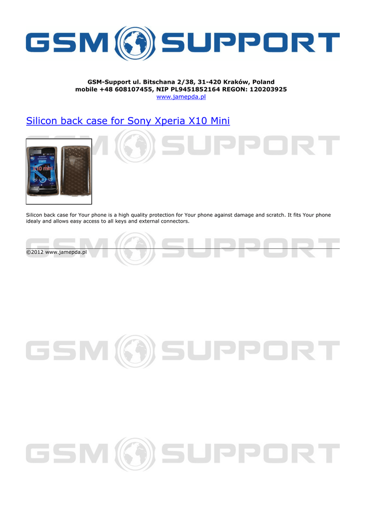 GSM-Support ul. Bitschana 2/38, 31-420 Kraków, Poland mobile +48 608107455, NIP PL9451852164 REGON: 120203925 www.jamepda.pl Silicon back case for Sony Xperia X10 Mini Silicon back case for Your phone is a high quality protection for Your phone against damage and scratch. It fits Your phone idealy and allows easy access to all keys and external connectors. ©2012 www.jamepda.pl Powered by TCPDF (www.tcpdf.org)
