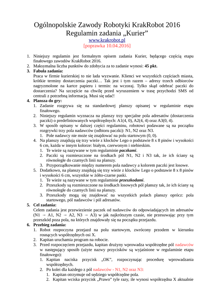 Ogólnopolskie Zawody Robotyki KrakRobot 2016 Regulamin