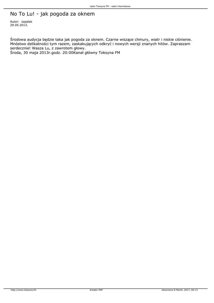 radio Toksyna FM - radio internetowe No To Lu! - jak pogoda za oknem Autor: szpalak 29.05.2013. Środowa audycja będzie taka jak pogoda za oknem. Czarne wiszące chmury, wiatr i niskie ciśnienie. Mnóstwo delikatności tym razem, zaskakujących odkryć i nowych wersji znanych hitów. Zapraszam serdecznie! Wasza Lu, z zawrotem głowy. Środa, 30 maja 2013r.godz. 20:00Kanał główny Toksyna FM http://www.toksyna.fm Kreator PDF Utworzono 8 March, 2017, 00:13