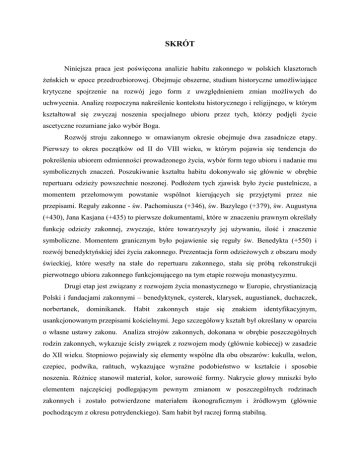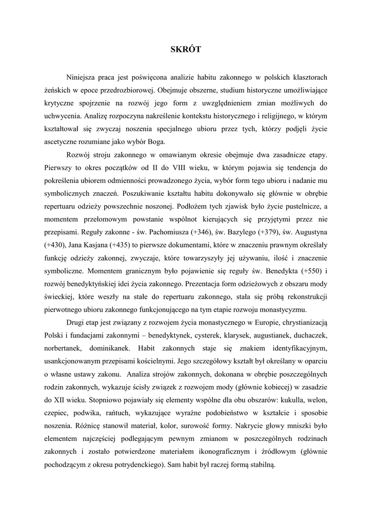 SKRÓT Niniejsza praca jest poświęcona analizie habitu zakonnego w polskich klasztorach żeńskich w epoce przedrozbiorowej. Obejmuje obszerne, studium historyczne umożliwiające krytyczne spojrzenie na rozwój jego form z uwzględnieniem zmian możliwych do uchwycenia. Analizę rozpoczyna nakreślenie kontekstu historycznego i religijnego, w którym kształtował się zwyczaj noszenia specjalnego ubioru przez tych, którzy podjęli życie ascetyczne rozumiane jako wybór Boga. Rozwój stroju zakonnego w omawianym okresie obejmuje dwa zasadnicze etapy. Pierwszy to okres początków od II do VIII wieku, w którym pojawia się tendencja do pokreślenia ubiorem odmienności prowadzonego życia, wybór form tego ubioru i nadanie mu symbolicznych znaczeń. Poszukiwanie kształtu habitu dokonywało się głównie w obrębie repertuaru odzieży powszechnie noszonej. Podłożem tych zjawisk było życie pustelnicze, a momentem przełomowym powstanie wspólnot kierujących się przyjętymi przez nie przepisami. Reguły zakonne - św. Pachomiusza (+346), św. Bazylego (+379), św. Augustyna (+430), Jana Kasjana (+435) to pierwsze dokumentami, które w znaczeniu prawnym określały funkcję odzieży zakonnej, zwyczaje, które towarzyszyły jej używaniu, ilość i znaczenie symboliczne. Momentem granicznym było pojawienie się reguły św. Benedykta (+550) i rozwój benedyktyńskiej idei życia zakonnego. Prezentacja form odzieżowych z obszaru mody świeckiej, które weszły na stałe do repertuaru zakonnego, stała się próbą rekonstrukcji pierwotnego ubioru zakonnego funkcjonującego na tym etapie rozwoju monastycyzmu. Drugi etap jest związany z rozwojem życia monastycznego w Europie, chrystianizacją Polski i fundacjami zakonnymi – benedyktynek, cysterek, klarysek, augustianek, duchaczek, norbertanek, dominikanek. Habit zakonnych staje się znakiem identyfikacyjnym, usankcjonowanym przepisami kościelnymi. Jego szczegółowy kształt był określany w oparciu o własne ustawy zakonu. Analiza strojów zakonnych, dokonana w obrębie poszczególnych rodzin zakonnych, wykazuje ścisły związek z rozwojem mody (głównie kobiecej) w zasadzie do XII wieku. Stopniowo pojawiały się elementy wspólne dla obu obszarów: kukulla, welon, czepiec, podwika, rańtuch, wykazujące wyraźne podobieństwo w kształcie i sposobie noszenia. Różnicę stanowił materiał, kolor, surowość formy. Nakrycie głowy mniszki było elementem najczęściej podlegającym pewnym zmianom w poszczególnych rodzinach zakonnych i zostało potwierdzone materiałem ikonograficznym i źródłowym (głównie pochodzącym z okresu potrydenckiego). Sam habit był raczej formą stabilną. Habit jako strój został przyjęty także przez grupy kobiet tworzących wspólnoty nie będące formalnie klasztorami – beginki i tercjarki. Zakony żeńskie mające swój początek poza granicami Polski, fundowane na naszych ziemiach: wizytki, karmelitanki, szarytki, benedyktynki sakramentki przywiozły własne wzorce strojów, których rygorystycznie przestrzegały. Znalazły one swoje udokumentowanie w postaci miniaturowych modeli i zestawu szablonów odzieżowych. Także i w tym przypadku stroje te wykazują analogię do mody kobiecej funkcjonującej na terenach, na których się kształtowały. Habit zakonny posiadał wielość znaczeń symbolicznych, zarówno jako całość stroju, jak i w odniesieniu do jego części składowych. Była to głównie symbolika chrzcielna, nupcjalna, eschatologiczna, apotropaiczna. Habit był rozumiany jako tunica sacra zapewniająca zbawienie, szata świadectwa contemptu mundi, jako znak sequella Christi, interpretowana w znaczeniu pasyjnym, wreszcie jako uczestnictwo w nowości życia dziecka Bożego. Podane znaczenia symboliczne mają swoje odniesienia w tekstach źródłowych o charakterze ascetyczno – teologicznym oraz przedstawieniach ikonograficznych w formie obrazów dewocyjnych zamieszczonych w pracy. Na zakończenie dołączono informacje odnoszące się do zwyczajów życia codziennego w klasztorze związane z funkcjonowaniem habitu, a także zestaw tkanin używanych w polskich klasztorach do jego sporządzania.