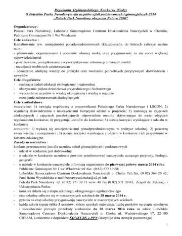 Regulamin Ogólnopolskiego Konkursu Wiedzy O Poleskim Parku Narodowym dla uczniów szkół podstawowych i gimnazjalnych 2014 „Poleski Park Narodowy obszarem Natura 2000” Organizatorzy: Poleski Park Narodowy, Lubelskie Samorządowe Centrum Doskonalenia Nauczycieli w Chełmie, Publiczne Gimnazjum Nr 1 We Włodawie Cele konkursu : Kształtowanie tzw. umiejętności ponadprzedmiotowych (kluczowych), do których zaliczyć można m.in.: - planowanie, organizowanie i ocenianie własnej nauki, oraz przyjmowanie za nią coraz większej odpowiedzialności - poszukiwanie, porządkowanie i wykorzystywanie informacji z różnych źródeł - rozwijanie osobistych zainteresowań - odnoszenie zdobytej wiedzy do praktyki oraz tworzenie potrzebnych pozytywnych doświadczeń i nawyków Cele długofalowe - realizacja zadań edukacji ekologicznej i regionalnej - ukazywanie piękna dziedzictwa przyrodniczego i kulturowego - wyposażenie uczniów w wiedzę ekologiczną i wiedzę o regionie - rozwijanie zainteresowań ekologicznych Cele krótkofalowe nauczyciele: 1) nawiążą współpracę z pracownikami Poleskiego Parku Narodowego i LSCDN; 2) wymienią doświadczenia z nauczycielami biorącymi udział w projekcie; 3) zastosują na zajęciach edukacyjnych i zajęciach pozalekcyjnych odpowiednie metody aktywizujące do treści objętych regulaminem konkursu; 4) przygotują uczniów do konkursu; 5) ocenią korzyści wynikające z udziału w konkursie uczniowie: 1) wykażą się umiejętnościami ponadprzedmiotowymi w praktyce szkolnej; 2) poszerzą swoją wiedzę i umiejętności ; 3) ocenią korzyści wynikające z udziału w konkursie i ich przydatność w karierze edukacyjne Zasady uczestnictwa : konkurs przeznaczony jest dla uczniów szkół gimnazjalnych i podstawowych - udział w konkursie jest dobrowolny - o udziale w konkursie uczniowie powinni poinformować nauczyciela uczącego przyrody, biologii, geografii - o udziale w konkursie nauczyciele informują organizatora do pierwszej połowy marca 2014 roku Publiczne Gimnazjum Nr 1 we Włodawie tel./fax (0 82) 572 10 68; Lubelskie Samorządowe Centrum Doskonalenia Nauczycieli o. Chełm Tel./fax. (0 82) 564 20 42; Pani Beata Wysokińska e-mail:[email protected] lub Poleski Park Narodowy tel. (0 82) 571 30 71 wew. 48 fax (0 82) 571 30 03, Zespół ds. Edukacji i Udostępniania Parku. - konkurs składa się z etapu szkolnego, okręgowego i ogólnopolskiego - etap szkolny odbywa się w macierzystych szkołach do 28 marca 2014 r. - pytania na etap szkolny przygotowują nauczyciele w macierzystych szkołach - każda szkoła typuje tylko 3 uczniów, którzy uzyskali najwyższą liczbę punktów na etapie szkolnym i niezwłocznie przesyła protokoły konkursów do 28 marca 2014 roku na adres: Lubelskie Samorządowe Centrum Doskonalenia Nauczycieli o. Chełm ul. Waśniewskiego 17, 22-100 CHEŁM, koniecznie z dopiskiem KONKURS o PPN (decyduje data stempla pocztowego) 1 Tematyka konkursu o Poleskim Parku Narodowym – „Poleski Park Narodowy obszarem Natura 2000”: - sieć obszarów Natura 2000 w rejonie Poleskiego Parku Narodowego - flora i fauna Parku - środowisko geograficzne Parku - ochrona przyrody Uczestnicy winni wykazać się wiadomościami i umiejętnościami z zakresu edukacji ekologicznej, sozologicznej, regionalnej, informatycznej i turystycznej. Forma konkursu : Etap szkolny: -forma pisemna (test powinien składać się z zadań zamkniętych i otwartych) Etap okręgowy: -forma pisemna (test składa się z zadań zamkniętych i otwartych), zadania układa autor projektu przy współpracy z pracownikami PPN. Do etapu okręgowego kwalifikują się uczniowie, którzy otrzymali 90% prawidłowych odpowiedzi (szkoły gimnazjalne) i 80% (szkoły podstawowe) Etap ogólnopolski: - część teoretyczna (test z ww. tematyki składający się z zadań zamkniętych i otwartych). (uczniowie szkół podstawowych i gimnazjów) - część praktyczna: (tylko dla 10 najlepszych uczniów gimnazjum) uczniowie, którzy uzyskali najlepsze wyniki w części pisemnej odpowiadają na 3 wylosowane pytania. Uczniowie szkół podstawowych uczestniczą tylko w części teoretycznej. O zajętym miejscu przez ucznia gimnazjum i uzyskaniu tytułu laureata etapu ogólnopolskiego decyduje suma punktów z części praktycznej i teoretycznej. Laureatami zostaje 10 uczniów szkół podstawowych i 10 uczniów gimnazjum. Etap Szkolny Termin do 28 marca 2014 r. Godzina wg możliwości Okręgowy 29 kwietnia 2014 r. 10.00 Ogólnopolskie 6 czerwca 2014 r. 10.00 Miejsce Macierzysta szkoła * Publiczne Gimnazjum nr 1 we Włodawie 22-200 Włodawa, ul. Szkolna 7 dla powiatu włodawskiego, parczewskiego i bialskopodlaskiego; * LSCDN ul. Waśniewskiego 17 22-100 Chełm dla powiatu chełmskiego, krasnostawskiego, zamojskiego, hrubieszowski, biłgorajskiego i pozostałych (zgodnie ze zgłoszeniem). LSCDN ul. Dominikańska 5 Lublin Dyrekcja PPN w Urszulinie 22 - 234 Urszulin, ul Lubelska 3a Skład komisji etapu okręgowego i ogólnopolskiego: nauczyciele szkół podstawowych i gimnazjalnych uczniów biorących udział w konkursie. Komisja dopuszcza obniżenie kryteriów oceny oraz punktacji. Laureaci etapu ogólnopolskiego otrzymują zaświadczenia i nagrody rzeczowe. Wszyscy uczestnicy etapu ogólnopolskiego i ich opiekunowie otrzymują materiały wydawnicze Poleskiego Parku Narodowego. Nauczyciele otrzymują podziękowania za przygotowanie uczniów do konkursu. Informacje o konkursie ukażą się w prasie i na stronach internetowych: PPN www.poleskipn.pl; PG 1 www.pg1.wlodawa.pl; LSCDN www.lscdn.pl; www.lasypolskie.pl Literatura : - Przewodnik turystyczny. Chełmskie. Lublin 1998. Wyd. PROMOTOR. - W krainie jezior, moczarów i bagien”, Lublin 1992, TWWP. - Poleski Park Narodowy. Przewodnik. Historia-Przyroda-Turystyka. Lublin 1998. - Ekologia. Podręcznik do gimnazjum. Wyd. LektorKlett. Poznań 1999. 2 - Muzeum Poleskiego Parku Narodowego. PPN. Urszulin 1996. - Między Bugiem a Wisłą. Skarby prz