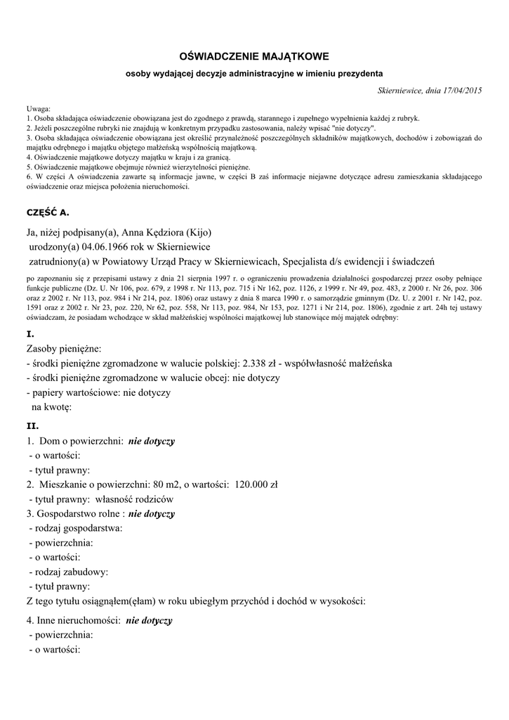 OŚWIADCZENIE MAJĄTKOWE osoby wydającej decyzje administracyjne w imieniu prezydenta Skierniewice, dnia 17/04/2015 Uwaga: 1. Osoba składająca oświadczenie obowiązana jest do zgodnego z prawdą, starannego i zupełnego wypełnienia każdej z rubryk. 2. Jeżeli poszczególne rubryki nie znajdują w konkretnym przypadku zastosowania, należy wpisać "nie dotyczy". 3. Osoba składająca oświadczenie obowiązana jest określić przynależność poszczególnych składników majątkowych, dochodów i zobowiązań do majątku odrębnego i majątku objętego małżeńską wspólnością majątkową. 4. Oświadczenie majątkowe dotyczy majątku w kraju i za granicą. 5. Oświadczenie majątkowe obejmuje również wierzytelności pieniężne. 6. W części A oświadczenia zawarte są informacje jawne, w części B zaś informacje niejawne dotyczące adresu zamieszkania składającego oświadczenie oraz miejsca położenia nieruchomości. CZĘŚĆ A. Ja, niżej podpisany(a), Anna Kędziora (Kijo) urodzony(a) 04.06.1966 rok w Skierniewice zatrudniony(a) w Powiatowy Urząd Pracy w Skierniewicach, Specjalista d/s ewidencji i świadczeń po zapoznaniu się z przepisami ustawy z dnia 21 sierpnia 1997 r. o ograniczeniu prowadzenia działalności gospodarczej przez osoby pełniące funkcje publiczne (Dz. U. Nr 106, poz. 679, z 1998 r. Nr 113, poz. 715 i Nr 162, poz. 1126, z 1999 r. Nr 49, poz. 483, z 2000 r. Nr 26, poz. 306 oraz z 2002 r. Nr 113, poz. 984 i Nr 214, poz. 1806) oraz ustawy z dnia 8 marca 1990 r. o samorządzie gminnym (Dz. U. z 2001 r. Nr 142, poz. 1591 oraz z 2002 r. Nr 23, poz. 220, Nr 62, poz. 558, Nr 113, poz. 984, Nr 153, poz. 1271 i Nr 214, poz. 1806), zgodnie z art. 24h tej ustawy oświadczam, że posiadam wchodzące w skład małżeńskiej wspólności majątkowej lub stanowiące mój majątek odrębny: I. Zasoby pieniężne: - środki pieniężne zgromadzone w walucie polskiej: 2.338 zł - współwłasność małżeńska - środki pieniężne zgromadzone w walucie obcej: nie dotyczy - papiery wartościowe: nie dotyczy na kwotę: II. 1. Dom o powierzchni: nie dotyczy - o wartości: - tytuł prawny: 2. Mieszkanie o powierzchni: 80 m2, o wartości: 120.000 zł - tytuł prawny: własność rodziców 3. Gospodarstwo rolne : nie dotyczy - rodzaj gospodarstwa: - powierzchnia: - o wartości: - rodzaj zabudowy: - tytuł prawny: Z tego tytułu osiągnąłem(ęłam) w roku ubiegłym przychód i dochód w wysokości: 4. Inne nieruchomości: nie dotyczy - powierzchnia: - o wartości: - tytuł prawny: III. Posiadam udziały w spółkach handlowych - należy podać liczbę i emitenta udziałów: nie dotyczy - liczba i emitent udziałów: - udziały te stanowią pakiet większy niż 10% udziałów w spółce: Z tego tytułu osiągnąłem(ęłam) w roku ubiegłym dochód w wysokości: IV. Posiadam akcje w spółkach handlowych - należy podać liczbę i emitenta akcji: - liczba i emitent akcji: - akcje te stanowią pakiet większy niż 10% akcji w spółce: Z tego tytułu osiągnąłem(ęłam) w roku ubiegłym dochód w wysokości: nie dotyczy V. Nabyłem(am) (nabył mój małżonek, z wyłączeniem mienia przynależnego do jego majątku odrębnego) od Skarbu Państwa, innej państwowej osoby prawnej, jednostek samorządu terytorialnego, ich związków lub od komunalnej osoby prawnej następujące mienie, które podlegało zbyciu w drodze przetargu - należy podać opis mienia i datę nabycia, od kogo: nie dotyczy VI. 1. Prowadzę działalność gospodarczą nie dotyczy forma prawna i przedmiot działalności: - osobiście: - wspólnie z innymi osobami: Z tego tytułu osiągnąłem(ęłam) w roku ubiegłym przychód i dochód w wysokości: 2. Zarządzam działalnością gospodarczą lub jestem przedstawicielem pełnomocnikiem takiej działalności: forma prawna i przedmiot działalności: nie dotyczy - osobiście: - wspólnie z innymi osobami: Z tego tytułu osiągnąłem(ęłam) w roku ubiegłym dochód w wysokości: VII. 1. W spółkach handlowych (nazwa, siedziba spółki): nie dotyczy - jestem członkiem zarządu (od kiedy): - jestem członkiem rady nadzorczej (od kiedy): - jestem członkiem komisji rewizyjnej (od kiedy): Z tego tytułu osiągnąłem(ęłam) w roku ubiegłym dochód w wysokości: 2. W spółdzielniach: nie dotyczy - jestem członkiem zarządu (od kiedy): - jestem członkiem rady nadzorczej (od kiedy): - jestem członkiem komisji rewizyjnej (od kiedy): Z tego tytułu osiągnąłem(ęłam) w roku ubiegłym dochód w wysokości: 3. W fundacjach prowadzących działalność gospodarczą: nie dotyczy - jestem członkiem zarządu (od kiedy): - jestem członkiem rady nadzorczej (od kiedy): - jestem członkiem komisji rewizyjnej (od kiedy): Z tego tytułu osiągnąłem(ęłam) w roku ubiegłym dochód w wysokości: VIII. Inne dochody osiągane z tytułu zatrudnienia lub innej działalności zarobkowej lub zajęć, z podaniem kwot uzyskiwanych z każdego tytułu: umowa o pracę - Powiatowy Urząd Pracy - 40.819,58 zł, dochód męża 50.906,27 zł IX. Składniki mienia ruchomego o wartości powyżej 10.000 złotych (w przypadku pojazdów mechanicznych należy podać markę, model i rok produkcji): Peugeot 206 SW, rok produkcji 2005, wartość 10.000 zł współwłasność małżeńska X. Zobowiązania pieniężne o wartości powyżej 10.000 złotych, w tym zaciągnięte kredyty i pożyczki oraz warunki, na jakich zostały udzielone (wobec kogo, w związku z jakim zdarzeniem, w jakiej wysokości): nie dotyczy CZĘŚĆ B. Dane niejawne - niepublikowane Powyższe oświadczenie składam świadomy(a), iż na podstawie art. 233 § 1 Kodeksu karnego za podanie nieprawdy lub zatajenie prawdy grozi kara pozbawienia wolności. Skierniewice, 17/04/2015 ...................................... (miejscowość, data) Anna Kędziora (Kijo) ...................................... (podpis)