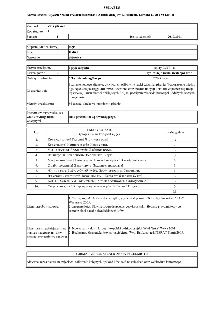 sylabus - Wyższa Szkoła Przedsiębiorczości i Administracji w Lublinie
