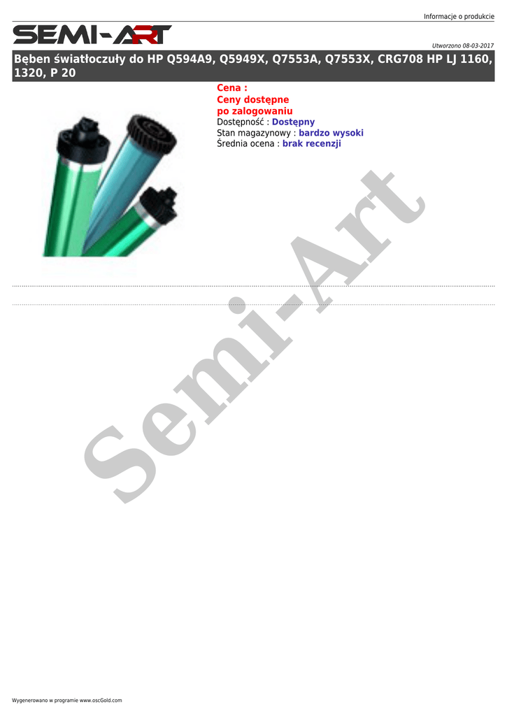 Informacje o produkcie Utworzono 08-03-2017 Bęben światłoczuły do HP Q594A9, Q5949X, Q7553A, Q7553X, CRG708 HP LJ 1160, 1320, P 20 Cena : Ceny dostępne po zalogowaniu Se m i- Ar t Dostępność : Dostępny Stan magazynowy : bardzo wysoki Średnia ocena : brak recenzji Wygenerowano w programie www.oscGold.com