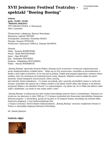 XVII Jesienny Festiwal Teatralny spektakl "Boeing Boeing" 19 października 2013 Sobota godz. 16:00 i 19:00 "BOEING BOEING" TITO PRODUCTIONS w Warszawie Marc Camoletti Tłumaczenie i adaptacja: Bartosz Wierzbięta Reżyseria: Gabriel GIETZKY Scenografia i kostiumy: Dominika SKAZA Muzyka: Szymon WYSOCKI Producenci: Katarzyna CEBULA, Damian SŁONINA Obsada: Maks - Szymon BOBROWSKI Paweł - Rafał KRÓLIKOWSKI Janet - Olga BOŁĄDŹ Jola - Dominika FIGURSKA Johanna - Magdalena BOCZARSKA Nadia – Maciej WIERZBICKI „Boeing Boeing” opowiada historię Maksa, którego życie uczuciowe i erotyczne regulowane jest przez międzynarodowy rozkład lotów... Maks ma aż trzy narzeczone, wszystkie są stewardesami, a każda z nich sądzi oczywiście, że to ona jest tą jedyną. Dzięki precyzyjnej organizacji i pomocy niezawodnej, choć nie stroniącej od sarkastycznych uwag, służącej, Maksowi zawsze udaje się skoordynować wizyty kolejnych narzeczonych, które zresztą, jak twierdzi, kocha jednakowo... Co stanie się jednak, gdy z powodu niewielkich zmian w ruchu lotniczym, wszystkie one zjawią się u Maksa niemal w tej samej chwili? Jaką rolę odegra w tej historii przyjaciel Maksa z lat młodości Paweł? I co najważniejsze, czy okaże się, że to Maks tak dobrze radzi sobie z kobietami, czy może to one radzą sobie z nim? „Boeing Boeing” to klasyczna już dziś sztuka francuskiego pisarza Marca Camolettiego. Pokazana na scenie po raz pierwszy w roku 1960 po 17,5 tysiąca wystawień jest francuską rekordzistką Guinnessa. Historia amanta i 3 stewardess, grana do tej pory w 55 krajach świata, doczekała się również kilku kinowych adaptacji, w tym hollywoodzkiego hitu z Tonym Curtisem i dwóch filmów bollywoodzkich. „Boeing Boeing” wreszcie wylądował również w Polsce w niezwykłej adaptacji Bartosza Wierzbięty. fot. Daniel Janiszyn Galeria zdjęć