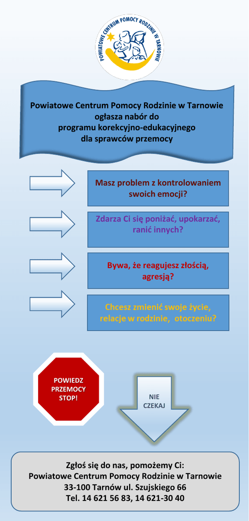 Powiatowe Centrum Pomocy Rodzinie w Tarnowie ogłasza nabór do programu korekcyjno-edukacyjnego dla sprawców przemocy Masz problem z kontrolowaniem swoich emocji? Zdarza Ci się poniżać, upokarzać, ranić innych? Bywa, że reagujesz złością, agresją? POWIEDZ PRZEMOCY STOP! NIE CZEKAJ Zgłoś się do nas, pomożemy Ci: Powiatowe Centrum Pomocy Rodzinie w Tarnowie 33-100 Tarnów ul. Szujskiego 66 Tel. 14 621 56 83, 14 621-30 40 Co należy wiedzieć o zjawisku przemocy w rodzinie? PRZEMOC w rodzinie to przestępstwo! Na skutek PRZEMOCY cierpi cała Twoja rodzina! PRZEMOC to działanie zamierzone i celowe! NIC nie usprawiedliwia PRZEMOCY! PRZEMOC nie kończy się sama, to od Ciebie zależy, czy zostanie przerwana! Pozwoli Ci na poprawę relacji w rodzinie! Nauczy Cię kontrolowania swoich emocji, zachowań! Da Ci szansę na lepsze jutro!