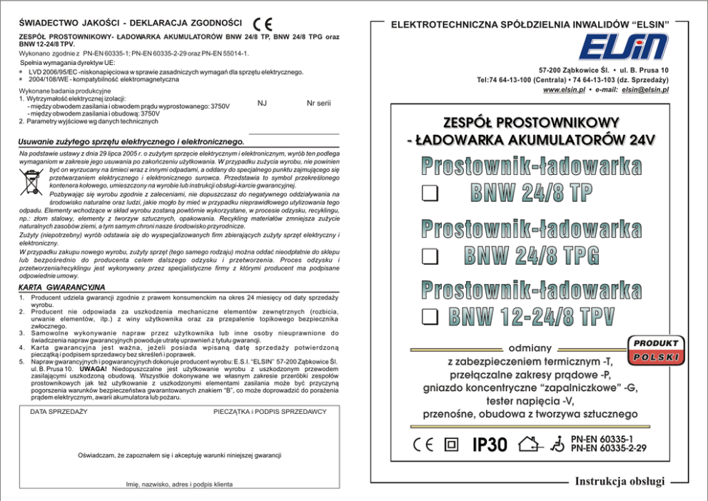 ŒWIADECTWO JAKOŒCI - DEKLARACJA ZGODNOŒCI ELEKTROTECHNICZNA SPÓ£DZIELNIA INWALIDÓW “ELSIN” ZESPÓ£ PROSTOWNIKOWY- £ADOWARKA AKUMULATORÓW BNW 24/8 TP, BNW 24/8 TPG oraz BNW 12-24/8 TPV. Wykonano zgodnie z PN-EN 60335-1; PN-EN 60335-2-29 oraz PN-EN 55014-1. Spe³nia wymagania dyrektyw UE: LVD 2006/95/EC -niskonapiêciowa w sprawie zasadniczych wymagañ dla sprzêtu elektrycznego. 2004/108/WE - kompatybilnoœæ elektromagnetyczna Wykonane badania produkcyjne 1. Wytrzyma³oœæ elektrycznej izolacji: - miêdzy obwodem zasilania i obwodem pr¹du wyprostowanego: 3750V - miêdzy obwodem zasilania i obudow¹: 3750V 2. Parametry wyjœciowe wg danych technicznych NJ 57-200 Z¹bkowice Œl. • ul. B. Prusa 10 Tel:74 64-13-100 (Centrala) • 74 64-13-103 (dz. Sprzeda¿y) www.elsin.pl • e-mail: [email protected] Nr serii Usuwanie zu¿ytego sprzêtu elektrycznego i elektronicznego. ZESPÓ£ PROSTOWNIKOWY - £ADOWARKA AKUMULATORÓW 24V Na podstawie ustawy z dnia 29 lipca 2005 r. o zu¿ytym sprzêcie elektrycznym i elektronicznym, wyrób ten podlega wymaganiom w zakresie jego usuwania po zakoñczeniu u¿ytkowania. W przypadku zu¿ycia wyrobu, nie powinien byæ on wyrzucany na œmieci wraz z innymi odpadami, a oddany do specjalnego punktu zajmuj¹cego siê przetwarzaniem elektrycznego i elektronicznego surowca. Przedstawia to symbol przekreœlonego kontenera ko³owego, umieszczony na wyrobie lub instrukcji obs³ugi-karcie gwarancyjnej. Pozbywaj¹c siê wyrobu zgodnie z zaleceniami, nie dopuszczasz do negatywnego oddzia³ywania na œrodowisko naturalne oraz ludzi, jakie mog³o by mieæ w przypadku nieprawid³owego utylizowania tego odpadu. Elementy wchodz¹ce w sk³ad wyrobu zostan¹ powtórnie wykorzystane, w procesie odzysku, recyklingu, np.: z³om stalowy, elementy z tworzyw sztucznych, opakowania. Recykling materia³ów zmniejsza zu¿ycie naturalnych zasobów ziemi, a tym samym chroni nasze œrodowisko przyrodnicze. Zu¿yty (niepotrzebny) wyrób odstawia siê do wyspecjalizowanych firm zbieraj¹cych zu¿yty sprzêt elektryczny i elektroniczny. W przypadku zakupu nowego wyrobu, zu¿yty sprzêt (tego samego rodzaju) mo¿na oddaæ nieodp³atnie do sklepu lub bezpoœrednio do producenta celem dalszego odzysku i przetworzenia. Proces odzysku i przetworzenia/recyklingu jest wykonywany przez specjalistyczne firmy z którymi producent ma podpisane odpowiednie umowy. KARTA GWARANCYJNA 1. Producent udziela gwarancji zgodnie z prawem konsumenckim na okres 24 miesiêcy od daty sprzeda¿y wyrobu. 2. Producent nie odpowiada za uszkodzenia mechaniczne elementów zewnêtrznych (rozbicia, urwanie elementów, itp.) z winy u¿ytkownika oraz za przepalenie topikowego bezpiecznika zw³ocznego. 3. Samowolne wykonywanie napraw przez u¿ytkownika lub inne osoby nieuprawnione do œwiadczenia napraw gwarancyjnych powoduje utratê uprawnieñ z tytu³u gwarancji. 4. Karta gwarancyjna jest wa¿na, je¿eli posiada wpisan¹ datê sprzeda¿y potwierdzon¹ piecz¹tk¹ i podpisem sprzedawcy bez skreœleñ i poprawek. 5. Napraw gwarancyjnych i pogwarancyjnych dokonuje producent wyrobu: E.S.I. “ELSIN” 57-200 Z¹bkowice Œl. ul. B. Prusa 10. UWAGA! Niedopuszczalne jest u¿ytkowanie wyrobu z uszkodzonym przewodem zasilaj¹cymi uszkodzon¹ obudow¹. Wszystkie dokonywane we w³asnym zakresie przeróbki zespo³ów prostownikowych jak te¿ u¿ytkowanie z uszkodzonymi elementami zasilania mo¿e byæ przyczyn¹ pogorszenia warunków bezpieczeñstwa gwarantowanych znakiem “B”, co mo¿e doprowadziæ do pora¿enia pr¹dem elektrycznym, awarii akumulatora lub po¿aru. DATA SPRZEDA¯Y PIECZ¥TKA i PODPIS SPRZEDAWCY Oœwiadczam, ¿e zapozna³em siê i akceptujê warunki niniejszej gwarancji Imiê, nazwisko, adres i podpis klienta odmiany PRODUKT POLSKI z zabezpieczeniem termicznym -T, prze³¹czalne zakresy pr¹dowe -P, gniazdo koncentryczne “zapalniczkowe” -G, tester napiêcia -V, przenoœne, obudowa z tworzywa sztucznego IP30 PN-EN 60335-1 PN-EN 60335-2-29 Instrukcja obs³ugi Informacje ogólne Eksploatacja i obs³uga Prostownik-³adowarka BNW 24/8 TP, BNW 24/8 TPG oraz BNW 12-24/8 TPV jest przeznaczona do uzupe³niaj¹cego ³adowania kwasowych akumulatorów 24V utworzonych z szeregowego po³¹czenia dwóch kwasowych akumulatorów 12V, na dwóch podzakresach pr¹dowych o pojemnoœci wg danych technicznych. Tak zestawione akumulatory wystêpuj¹ g³ównie w wózkach inwalidzkich oraz innych pojazdach napêdzanych silnikami elektrycznymi. £adowanie odbywa siê pr¹dem malej¹cym. Prostowniki BNW 24/8 TP, BNW 24/8 TPG oraz BNW 12-24/8 TPV wykonano zgodnie z normami bezpieczeñstwa PN-EN 60335-1 oraz PN-EN 60335-2-29 w II klasie ochrony elektrycznej - symbol oraz stopniu ochrony przed dostêpem i wilgoci¹ IP30. Prostownik BNW 24/8 TPG dodatkowo jest przeznaczony tak¿e do zasilania, przez gniazdo koncentryczne przenoœnych urz¹dzeñ samochodowych na napiêcie DC 24V, wyposa¿onych we wtyczki koncentryczne do zapalniczki samochodowej, np.: lodówka, radioodbiornik, je¿eli pobór pr¹du nie przekroczy mo¿liwoœci okreœlonych w danych technicznych prostownika. Przy³¹czenie zespo³u prostownikowego do ³adowania jest wykonywane za pomoc¹ z³¹cza opisanego na p³ycie czo³owej. W przypadku BNW 24/8 TP z³¹cze jest dwubiegunowe z wystêpem uniemo¿liwiaj¹cym zmianê biegunowoœci. W przypadku BNW 12-24/8 TPV z³¹cze jest trzybiegunowe gdzie na skrajnych 12V 12V, a n a z³ ¹c z u œ rodk owym po ³¹cz one bieg uny biegunach znajduj¹ siê odpowiednio: akumulatorów. Pozwala to na oddzielne ³adowanie ka¿dego akumulatora 12V co jest korzystne w przypadku ich ró¿nego roz³adowania. Akumulator do ³adowania przez prostownik BNW 24/8 TPG jest przy³¹czany za pomoc¹ dodatkowego zespo³u przewodów z wtykiem zapalniczkowym. Gniazdo koncentryczne BNW 24/8 mo¿e s³u¿yæ do zasilania urz¹dzeñ niskonapiêciowych na napiêcie 24V. Schemat pod³¹czenia akumulatorów do gniazda wózka: BNW 24/8 TP BNW 24/8 TPG BNW 12-24/