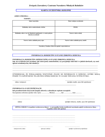 Związek Zawodowy Centrum Narodowe Młodych Rolników KARTA UCZESTNIKA KOLONII ADRES OŚRODKA: ..................................................................................................................................... TERMIN: ................................................................................................................................................. Imię i nazwisko Data i miejsce urodzenia Dokładny adres zamieszkania, telefon PESEL Dokładny adres i nr tel. Rodziców/opiekunów w czasie pobytu dziecka na kolonii Nazwa i adres szkoły Nazwa i adres zakładu pracy ojca Nazwa i adres zakładu pracy matki Narodowy Fundusz Zdrowia (podać województwo): INFORMACJA RODZICÓW O STANIE ZDROWIA DZIECKA INFORMACJA RODZICÓW (OPIEKUNÓW) O STANIE ZDROWIA DZIECKA (np. na co dziecko jest uczulone, jak znosi jazdę samochodem, czy przyjmuje stale leki i w jakich dawkach, czy nosi aparat ortodontyczny lub okulary): ................................................................................................................................................................. ................................................................................................................................................................. ................................................................................................................................................................. ……………………………………………............................................................................................. STWIERDZAM, ŻE PODAŁAM(EM) WSZYSTKIE ZNANE MI INFORMACJE O DZIECKU, KTÓRE MOGĄ POMÓC W ZAPEWNIENIU WŁAŚCIWEJ OPIEKI DZIECKU W CZASIE TRWANIA WYPOCZYNKU. ......................................... (data i miejsce) .................................................................. (podpis matki, ojca lub opiekuna) ____________________________________________________________ INFORMACJA O SZCZEPIENIACH lub przedstawienie książeczki (kopii) zdrowia z aktualnym wpisem szczepień: Szczepienia ochronne (podać rok): tężec ................, błonica ............, dur ................., inne ............. ................................................................................................................................................................... ..................................................... ......................................... (data) (podpis lekarza, matki, ojca lub opiekuna) OPINIA SZKOŁY (wypełnia wychowawca klasy) – w przypadku braku możliwości uzyskania opinii wychowawcy klasy – wypełnia rodzic lub opiekun ................................................................................................................................................................................. ................................................................................................................................................................................. ................................................................................................................................................................................. ................................................................................................................................................................................. ....................................... ........................................ (miejscowość, data) (pieczęć szkoły) .......................................... (podpis wychowawcy/opiekuna) Potwierdzenie pobytu dziecka na wypoczynku Dziecko przebywało na ……………………………………………………………………………………………………………………...........…………………………….. (forma i adres miejsca wypoczynku) od dnia …......…..……. do dnia ……….....…….. 2…………. r. ………………….........……. (data) ………………………………………………………….. (czytelny podpis kierownika wypoczynku) Uwagi i spostrzeżenia wychowawcy o dziecku podczas pobytu na kolonii/ zimowisku ……………………………………………………………………………………………………………………………………………………………………………… ……………………………………………………………………………………………………………………………………………………………………………… ……………………………………………………………………………………………………………………………………………………………………………… ……………………………………………………………………………………………………………………………………………………………………………… ……………………………………………………………………………………………………………………………………………………………………………… ................................................... (miejscowość, data) …..................................... (podpis wychowawcy) Informacje o stanie zdrowia dziecka w czasie pobytu na kolonii ……………………………………………………………………………………………………………………………………………………………………………… ……………………………………………………………………………………………………………………………………………………………………………… ……………………………………………………………………………………………………………………………………………………………………………… ……………………………………………………