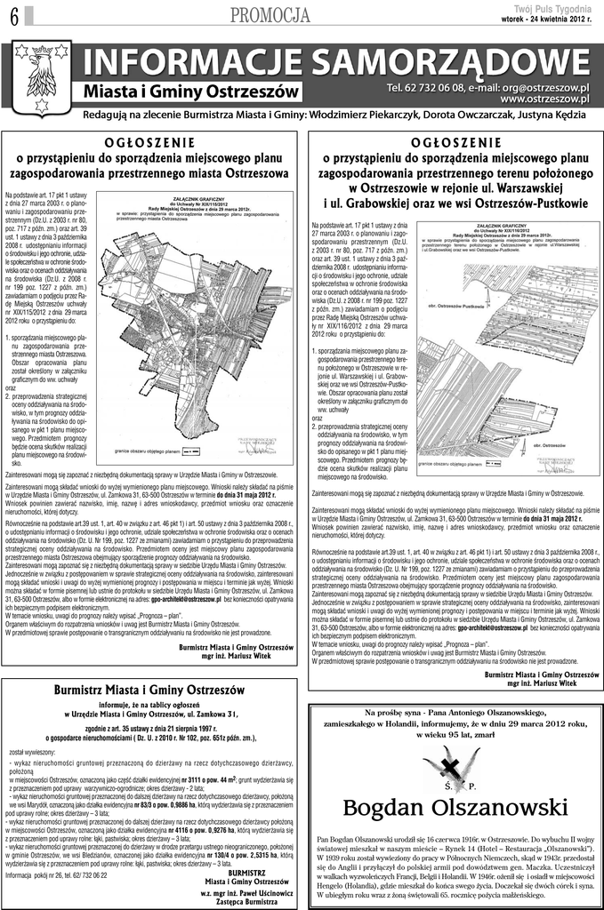 6 PROMOCJA OG£OSZENIE o przyst¹pieniu do sporz¹dzenia miejscowego planu zagospodarowania przestrzennego miasta Ostrzeszowa Na podstawie art. 17 pkt 1 ustawy z dnia 27 marca 2003 r. o planowaniu i zagospodarowaniu przestrzennym (Dz.U. z 2003 r. nr 80, poz. 717 z póŸn. zm.) oraz art. 39 ust. 1 ustawy z dnia 3 paŸdziernika 2008 r. udostêpnianiu informacji o œrodowisku i jego ochronie, udziale spo³eczeñstwa w ochronie œrodowiska oraz o ocenach oddzia³ywania na œrodowiska (Dz.U. z 2008 r. nr 199 poz. 1227 z póŸn. zm.) zawiadamiam o podjêciu przez Radê Miejsk¹ Ostrzeszów uchwa³y nr XIX/115/2012 z dnia 29 marca 2012 roku o przyst¹pieniu do: Twój Puls Tygodnia wtorek - 24 kwietnia 2012 r. OG£OSZENIE o przyst¹pieniu do sporz¹dzenia miejscowego planu zagospodarowania przestrzennego terenu po³o¿onego w Ostrzeszowie w rejonie ul. Warszawskiej i ul. Grabowskiej oraz we wsi Ostrzeszów-Pustkowie Na podstawie art. 17 pkt 1 ustawy z dnia 27 marca 2003 r. o planowaniu i zagospodarowaniu przestrzennym (Dz.U. z 2003 r. nr 80, poz. 717 z póŸn. zm.) oraz art. 39 ust. 1 ustawy z dnia 3 paŸdziernika 2008 r. udostêpnianiu informacji o œrodowisku i jego ochronie, udziale spo³eczeñstwa w ochronie œrodowiska oraz o ocenach oddzia³ywania na œrodowiska (Dz.U. z 2008 r. nr 199 poz. 1227 z póŸn. zm.) zawiadamiam o podjêciu przez Radê Miejsk¹ Ostrzeszów uchwa³y nr XIX/116/2012 z dnia 29 marca 2012 roku o przyst¹pieniu do: 1. sporz¹dzania miejscowego planu zagospodarowania przestrzennego miasta Ostrzeszowa. Obszar opracowania planu zosta³ okreœlony w za³¹czniku graficznym do ww. uchwa³y oraz 2. przeprowadzenia strategicznej oceny oddzia³ywania na œrodowisko, w tym prognozy oddzia³ywania na œrodowisko do opisanego w pkt 1 planu miejscowego. Przedmiotem prognozy bêdzie ocena skutków realizacji planu miejscowego na œrodowisko. Zainteresowani mog¹ siê zapoznaæ z niezbêdn¹ dokumentacj¹ sprawy w Urzêdzie Miasta i Gminy w Ostrzeszowie. Zainteresowani mog¹ sk³adaæ wnioski do wy¿ej wymienionego planu miejscowego. Wnioski nale¿y sk³adaæ na piœmie w Urzêdzie Miasta i Gminy Ostrzeszów, ul. Zamkowa 31, 63-500 Ostrzeszów w terminie do dnia 31 maja 2012 r. Wniosek powinien zawieraæ nazwisko, imiê, nazwê i adres wnioskodawcy, przedmiot wniosku oraz oznaczenie nieruchomoœci, której dotyczy. Równoczeœnie na podstawie art.39 ust. 1, art. 40 w zwi¹zku z art. 46 pkt 1) i art. 50 ustawy z dnia 3 paŸdziernika 2008 r., o udostêpnianiu informacji o œrodowisku i jego ochronie, udziale spo³eczeñstwa w ochronie œrodowiska oraz o ocenach oddzia³ywania na œrodowisko (Dz. U. Nr 199, poz. 1227 ze zmianami) zawiadamiam o przyst¹pieniu do przeprowadzenia strategicznej oceny oddzia³ywania na œrodowisko. Przedmiotem oceny jest miejscowy planu zagospodarowania przestrzennego miasta Ostrzeszowa obejmuj¹cy sporz¹dzenie prognozy oddzia³ywania na œrodowisko. Zainteresowani mog¹ zapoznaæ siê z niezbêdn¹ dokumentacj¹ sprawy w siedzibie Urzêdu Miasta i Gminy Ostrzeszów. Jednoczeœnie w zwi¹zku z postêpowaniem w sprawie strategicznej oceny oddzia³ywania na œrodowisko, zainteresowani mog¹ sk³adaæ wnioski i uwagi do wy¿ej wymienionej prognozy i postêpowania w miejscu i terminie jak wy¿ej. Wnioski mo¿na sk³adaæ w formie pisemnej lub ustnie do protoko³u w siedzibie Urzêdu Miasta i Gminy Ostrzeszów, ul. Zamkowa 31, 63-500 Ostrzeszów, albo w formie elektronicznej na adres: [email protected] bez koniecznoœci opatrywania ich bezpiecznym podpisem elektronicznym. W temacie wniosku, uwagi do prognozy nale¿y wpisaæ „Prognoza – plan”. Organem w³aœciwym do rozpatrzenia wniosków i uwag jest Burmistrz Miasta i Gminy Ostrzeszów. W przedmiotowej sprawie postêpowanie o transgranicznym oddzia³ywaniu na œrodowisko nie jest prowadzone. Burmistrz Miasta i Gminy Ostrzeszów mgr in¿. Mariusz Witek 1. sporz¹dzania miejscowego planu zagospodarowania przestrzennego terenu po³o¿onego w Ostrzeszowie w rejonie ul. Warszawskiej i ul. Grabowskiej oraz we wsi Ostrzeszów-Pustkowie. Obszar opracowania planu zosta³ okreœlony w za³¹czniku graficznym do ww. uchwa³y oraz 2. przeprowadzenia strategicznej oceny oddzia³ywania na œrodowisko, w tym prognozy oddzia³ywania na œrodowisko do opisanego w pkt 1 planu miejscowego. Przedmiotem prognozy bêdzie ocena skutków realizacji planu miejscowego na œrodowisko. Zainteresowani mog¹ siê zapoznaæ z niezbêdn¹ dokumentacj¹ sprawy w Urzêdzie Miasta i Gminy w Ostrzeszowie. Zainteresowani mog¹ sk³adaæ wnioski do wy¿ej wymienionego planu miejscowego. Wnioski nale¿y sk³adaæ na piœmie w Urzêdzie Miasta i Gminy Ostrzeszów, ul. Zamkowa 31, 63-500 Ostrzeszów w terminie do dnia 31 maja 2012 r. Wniosek powinien zawieraæ nazwisko, imiê, nazwê i adres wnioskodawcy, przedmiot wniosku oraz oznaczenie nieruchomoœci, której dotyczy. Równoczeœnie na podstawie art.39 ust. 1, art. 40 w zwi¹zku z art. 46 pkt 1) i art. 50 ustawy z dnia 3 paŸdziernika 2008 r., o udostêpnianiu informacji o œrodowisku i jego ochronie, udziale spo³eczeñstwa w ochronie œrodowiska oraz o ocenach oddzia³ywania na œrodowisko (Dz. U. Nr 199, poz. 1227 ze zmianami) zawiadamiam o przyst¹pieniu do przeprowadzenia strategicznej oceny oddzia³ywania na œrodowisko. Przedmiotem oceny jest miejscowy planu zagospodarowania przestrzennego miasta Ostrzeszowa obejmuj¹cy sporz¹dzenie prognozy oddzia³ywania na œrodowisko. Zainteresowani mog¹ zapoznaæ siê z niezbêdn¹ dokumentacj¹ sprawy w siedzibie Urzêdu Miasta i Gminy Ostrzeszów. Jednoczeœnie w zwi¹zku z postêpowaniem w sprawie strategicznej oceny oddzia³ywania na œrodowisko, zainteresowani mog¹ sk³adaæ wnioski i uwagi do wy¿ej wymienionej prognozy i postêpowania w miejscu i terminie jak wy¿ej. Wnioski mo¿na sk³adaæ w formie pisemnej lub ustnie do protoko³u w siedzibie Urzêdu Miasta i Gminy Ostrzeszów, ul. Zamkowa 31, 63-500 Ostrzeszów, albo w formie elektr