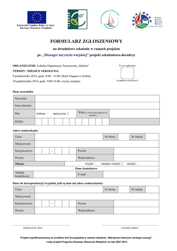 FORMULARZ ZGŁOSZENIOWY na dwudniowe szkolenie w ramach projektu pt. „Menager turystyki wiejskiej” projekt szkoleniowo-doradczy ORGANIZATOR: Lokalna Organizacja Turystyczna „Marina" TERMIN / MIEJSCE SZKOLENIA 9 października 2014, godz. 8:00 - 15:00, Hotel Niagara w Golinie 10 października 2014, godz. 9:00-16:00, wizyty studyjne Dane uczestnika Nazwisko Imię (imiona) Płeć mężczyzna kobieta Wiek (w chwili przystąpienia do projektu) PESEL Adres zamieszkania Ulica Nr domu Nr lokalu Miejscowość Kod pocztowy - Poczta Województwo Powiat wiejski Obszar miejsko-wiejski miejski Dane kontaktowe Telefon komórkowy E-mail Dane do korespondencji (wypełnić jeśli są inne niż adres zamieszkania) Ulica Nr domu Nr lokalu Miejscowość Kod pocztowy - Województwo Powiat ………………………………………… (miejscowość, data) Poczta ………………………………………… (czytelny podpis) Projekt współfinansowany ze środków Unii Europejskiej w ramach działania „Wdrażanie lokalnych strategii rozwoju” – mały projekt Programu Rozwoju Obszarów Wiejskich na lata 2007-2013. OŚWIADCZENIE O PRZESTRZEGANIU REGULAMINU Oświadczam, że zapoznałem(am) się z regulaminem rekrutacji i uczestnictwa w projekcie „Menager turystyki wiejskiej” projekt szkoleniowo-doradczy, zgadzam się z jego zapisami i zobowiązuję się do jego skrupulatnego przestrzegania. ………………………………………… (miejscowość, data) ………………………………………… (czytelny podpis) OŚWIADCZENIE O WYRAŻENIU ZGODY NA PRZETWARZANIE DANYCH OSOBOWYCH Wyrażam zgodę na przetwarzanie moich danych osobowych dla potrzeb niezbędnych do realizacji projektu „Menager turystyki wiejskiej” projekt szkoleniowo-doradczy (zgodnie z Ustawą z dnia 29.08.1997 roku o Ochronie Danych Osobowych; tekst jednolity: Dz. U. z 2002r. Nr 101, poz. 926 ze zm.) ………………………………………… (miejscowość, data) ………………………………………… (czytelny podpis) DEKLARACJA DOT. PROWADZENIA LUB ZAMIARU PODJĘCIA DZIAŁALNOŚCI ZWIĄZANEJ Z TURYSTYKĄ Oświadczam na potrzebę projektu „Menager turystyki wiejskiej” projekt szkoleniowo-doradczy, iż: Pracuję w podmiocie zajmującym się turystyką na terenie LGD Solidarni TAK NIE TAK NIE w Partnerstwie (Golina, Rzgów, Rychwał, Stare Miasto, Grodziec lub Tuliszków) NAZWA PODMIOTU: ……………………………………………. Zamierzam podjąć działalność w obszarze turystyki na terenie LGD Solidarni w Partnerstwie (Golina, Rzgów, Rychwał, Stare Miasto, Grodziec lub Tuliszków) Zaznacz X właściwą odpowiedź ………………………………………… (miejscowość, data) ………………………………………… (czytelny podpis) Projekt współfinansowany ze środków Unii Europejskiej w ramach działania „Wdrażanie lokalnych strategii rozwoju” – mały projekt Programu Rozwoju Obszarów Wiejskich na lata 2007-2013.
