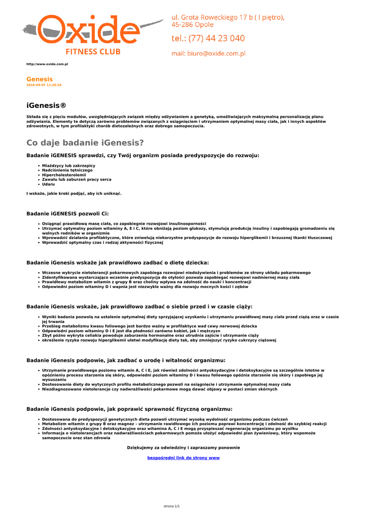 http://www.oxide.com.pl Genesis 2016-09-07 11:28:24 iGenesis® Składa się z pięciu modułów, uwzględniających związek między odżywianiem a genetyką, umożliwiających maksymalną personalizację planu odżywiania. Elementy te dotyczą zarówno problemów związanych z osiągnięciem i utrzymaniem optymalnej masy ciała, jak i innych aspektów zdrowotnych, w tym profilaktyki chorób dietozależnych oraz dobrego samopoczucia. Co daje badanie iGenesis? Badanie iGENESIS sprawdzi, czy Twój organizm posiada predyspozycje do rozwoju: Miażdzycy lub zakrzepicy Nadciśnienia tętniczego Hipercholesterolemii Zawału lub zaburzeń pracy serca Udaru I wskaże, jakie kroki podjąć, aby ich uniknąć. Badanie iGENESIS pozwoli Ci: Osiągnąć prawidłową masę ciała, co zapobiegnie rozwojowi insulinooporności Utrzymać optymalny poziom witaminy A, E i C, które obniżają poziom glukozy, stymulują produkcję insuliny i zapobiegają gromadzeniu się wolnych rodników w organizmie Wprowadzić działania profilaktyczne, które zniwelują niekorzystne predyspozycje do rozwoju hiperglikemii i brzusznej tkanki tłuszczowej Wprowadzić optymalny czas i rodzaj aktywności fizycznej Badanie iGenesis wskaże jak prawidłowo zadbać o dietę dziecka: Wczesne wykrycie nietolerancji pokarmowych zapobiega rozwojowi niedożywienia i problemów ze strony układu pokarmowego Zidentyfikowana wystarczająco wcześnie predyspozycja do otyłości pozwala zapobiegać rozwojowi nadmiernej masy ciała Prawidłowy metabolizm witamin z grupy B oraz choliny wpływa na zdolność do nauki i koncentracji Odpowiedni poziom witaminy D i wapnia jest niezwykle ważny dla rozwoju mocnych kości i zębów Badanie iGenesis wskaże, jak prawidłowo zadbać o siebie przed i w czasie ciąży: Wyniki badania pozwolą na ustalenie optymalnej diety sprzyjającej uzyskaniu i utrzymaniu prawidłowej masy ciała przed ciążą oraz w czasie jej trwania Przebieg metabolizmu kwasu foliowego jest bardzo ważny w profilaktyce wad cewy nerwowej dziecka Odpowiedni poziom witaminy D i E jest dla płodności zarówno kobiet, jak i mężczyzn Zbyt późno wykryta celiakia powoduje zaburzenia hormonalne oraz utrudnia zajście i utrzymanie ciąży określenie ryzyka rozwoju hiperglikemii ułatwi modyfikację diety tak, aby zmniejszyć ryzyko cukrzycy ciążowej Badanie iGenesis podpowie, jak zadbać o urodę i witalność organizmu: Utrzymanie prawidłowego poziomu witamin A, C i E, jak również zdolności antyoksydacyjne i detoksykacyjne są szczególnie istotne w opóźnieniu procesu starzenia się skóry, odpowiedni poziom witaminy D i kwasu foliowego opóźnia starzenie się skóry i zapobiega jej wysuszaniu Dostosowanie diety do wytycznych profilu metabolicznego pozwoli na osiągnięcie i utrzymanie optymalnej masy ciała Niezdiagnozowane nietolerancje czy nadwrażliwości pokarmowe mogą dawać objawy w postaci zmian skórnych Badanie iGenesis podpowie, jak poprawić sprawność fizyczną organizmu: Dostosowana do predyspozycji genetycznych dieta pozwoli utrzymać wysoką wydolność organizmu podczas ćwiczeń Metabolizm witamin z grupy B oraz magnez – utrzymanie rawidłowego ich poziomu poprawi koncentrację i zdolność do szybkiej reakcji Zdolności antyoksydacyjne i detoksykacyjne oraz witamina A, C i E mogą przyspieszać regenerację organizmu po wysiłku Informacja o nietolerancjach oraz nadwrażliwościach pokarmowych pomoże ułożyć odpowiedni plan żywieniowy, który wspomoże samopoczucie oraz stan zdrowia Dziękujemy za odwiedziny i zapraszamy ponownie bezpośredni link do strony www strona 1/1 Powered by TCPDF (www.tcpdf.org)