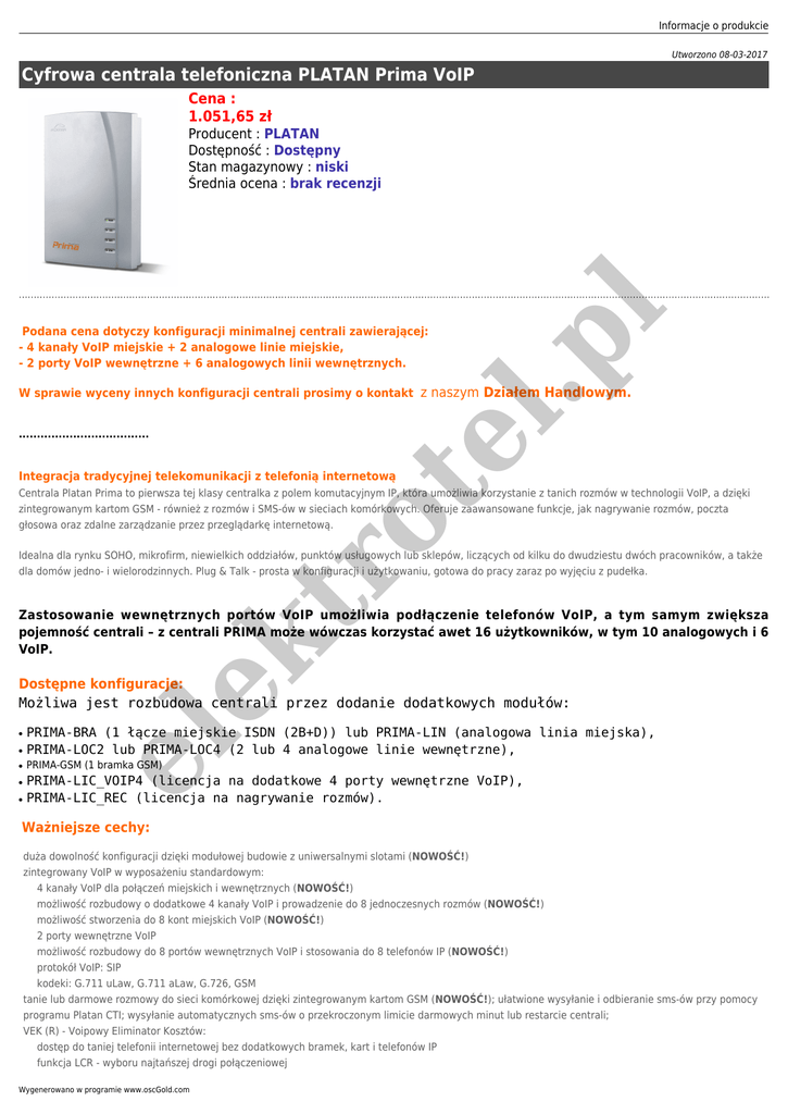 Informacje o produkcie Utworzono 08-03-2017 Cyfrowa centrala telefoniczna PLATAN Prima VoIP Cena : 1.051,65 zł Podana cena dotyczy konfiguracji minimalnej centrali zawierającej: - 4 kanały VoIP miejskie + 2 analogowe linie miejskie, - 2 porty VoIP wewnętrzne + 6 analogowych linii wewnętrznych. l.p l Producent : PLATAN Dostępność : Dostępny Stan magazynowy : niski Średnia ocena : brak recenzji W sprawie wyceny innych konfiguracji centrali prosimy o kontakt z naszym Działem Handlowym. te .................................... Integracja tradycyjnej telekomunikacji z telefonią internetową tr o Centrala Platan Prima to pierwsza tej klasy centralka z polem komutacyjnym IP, która umożliwia korzystanie z tanich rozmów w technologii VoIP, a dzięki zintegrowanym kartom GSM - również z rozmów i SMS-ów w sieciach komórkowych. Oferuje zaawansowane funkcje, jak nagrywanie rozmów, poczta głosowa oraz zdalne zarządzanie przez przeglądarkę internetową. Idealna dla rynku SOHO, mikrofirm, niewielkich oddziałów, punktów usługowych lub sklepów, liczących od kilku do dwudziestu dwóch pracowników, a także dla domów jedno- i wielorodzinnych. Plug & Talk - prosta w konfiguracji i użytkowaniu, gotowa do pracy zaraz po wyjęciu z pudełka. ek Zastosowanie wewnętrznych portów VoIP umożliwia podłączenie telefonów VoIP, a tym samym zwiększa pojemność centrali – z centrali PRIMA może wówczas korzystać awet 16 użytkowników, w tym 10 analogowych i 6 VoIP. Dostępne konfiguracje: Możliwa jest rozbudowa centrali przez dodanie dodatkowych modułów: ● ● ● ● PRIMA-BRA (1 łącze miejskie ISDN (2B+D)) lub PRIMA-LIN (analogowa linia miejska), PRIMA-LOC2 lub PRIMA-LOC4 (2 lub 4 analogowe linie wewnętrzne), el ● PRIMA-GSM (1 bramka GSM) PRIMA-LIC_VOIP4 (licencja na dodatkowe 4 porty wewnętrzne VoIP), PRIMA-LIC_REC (licencja na nagrywanie rozmów). Ważniejsze cechy: duża dowolność konfiguracji dzięki modułowej budowie z uniwersalnymi slotami (NOWOŚĆ!) zintegrowany VoIP w wyposażeniu standardowym: 4 kanały VoIP dla połączeń miejskich i wewnętrznych (NOWOŚĆ!) możliwość rozbudowy o dodatkowe 4 kanały VoIP i prowadzenie do 8 jednoczesnych rozmów (NOWOŚĆ!) możliwość stworzenia do 8 kont miejskich VoIP (NOWOŚĆ!) 2 porty wewnętrzne VoIP możliwość rozbudowy do 8 portów wewnętrznych VoIP i stosowania do 8 telefonów IP (NOWOŚĆ!) protokół VoIP: SIP kodeki: G.711 uLaw, G.711 aLaw, G.726, GSM tanie lub darmowe rozmowy do sieci komórkowej dzięki zintegrowanym kartom GSM (NOWOŚĆ!); ułatwione wysyłanie i odbieranie sms-ów przy pomocy programu Platan CTI; wysyłanie automatycznych sms-ów o przekroczonym limicie darmowych minut lub restarcie centrali; VEK (R) - Voipowy Eliminator Kosztów: dostęp do taniej telefonii internetowej bez dodatkowych bramek, kart i telefonów IP funkcja LCR - wyboru najtańszej drogi połączeniowej Wygenerowano w programie www.oscGold.com unikalna funkcja Call Through - dzwoń z komórki przez VoIP. Centralka automatycznie rozpoznaje wskazane numery komórkowe i przekierowuje je do sieci VoIP Plug & Talk czyli podłącz i rozmawiaj - centralka gotowa do użycia po wyjęciu z pudełka z predefiniowanymi ustawieniami fabrycznymi Możliwość nagrywania rozmów wszystkich użytkowników, do 10 rozmów (kanałów) jednocześnie Prima Web Konfigurator - zarządzanie centralką przez przeglądarkę internetową Rejestracja połączeń wychodzących i przychodzących, taryfikacja rozmów poprzez aplikację Grosik Zobacz Kto Dzwoni - prezentacja numeru (usługa CLIP) abonenta dzwoniącego na wyświetlaczach aparatów telefonicznych oraz w programie Platan CTI Współpraca z komputerem poprzez program Platan CTI (dodatkowe funkcje telefonu na ekranie komputera) Zintegrowana, wewnętrzna Poczta Głosowa Rejestracja połączeń z buforem w centrali Możliwość aktualizacji oprogramowania centrali (firmware update) Estetyczna obudowa do powieszenia na ścianie Platan Prima to unikalna na skalę europejską centralka IP tej wielkości oferująca zintegrowane nagrywanie rozmów, pocztę głosową, taryfikację rozmów oraz obsługująca zarówno linie VoIP, analogowe, GSM, jak i ISDN. ek tr o te l.p l Wymiary centrali: el ●