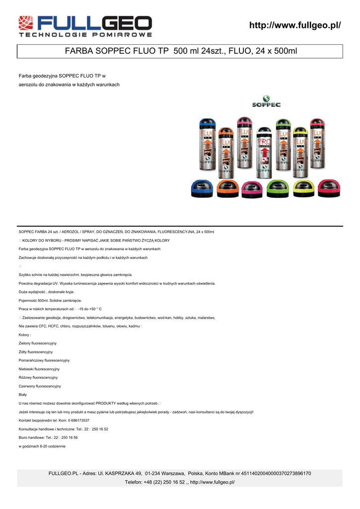 http://www.fullgeo.pl/ FARBA SOPPEC FLUO TP 500 ml 24szt., FLUO, 24 x 500ml Farba geodezyjna SOPPEC FLUO TP w aerozolu do znakowania w każdych warunkach SOPPEC FARBA 24 szt. / AEROZOL / SPRAY, DO OZNACZEŃ, DO ZNAKOWANIA, FLUORESCENCYJNA, 24 x 500ml KOLORY DO WYBORU - PROSIMY NAPISAĆ JAKIE SOBIE PAŃSTWO ŻYCZĄ KOLORY Farba geodezyjna SOPPEC FLUO TP w aerozolu do znakowania w każdych warunkach Zachowuje doskonałą przyczepność na każdym podłożu i w każdych warunkach Szybko schnie na każdej nawierzchni. bezpieczna głowica zamknięcia. Powolna degradacja UV. Wysoka luminescencja zapewnia wysoki komfort widoczności w trudnych warunkach oświetlenia. Duża wydajność , doskonale kryje. Pojemność 500ml. Solidne zamknięcie. Praca w niskich temperaturach od -15 do +50 ° C Zastosowanie geodezja, drogownictwo, telekomunikacja, energetyka, budownictwo, wod-kan, hobby, sztuka, malarstwo, Nie zawiera CFC, HCFC, chloru, rozpuszczalników, toluenu, ołowiu, kadmu Kolory : Zielony fluorescencyjny Żółty fluorescencyjny Pomarańczowy fluorescencyjny Niebieski fluorescencyjny Różowy fluorescencyjny Czerwony fluorescencyjny Biały U nas również możesz dowolnie skonfigurować PRODUKTY według własnych potrzeb. Jeżeli interesuje cię ten lub inny produkt a masz pytania lub potrzebujesz jakiejkolwiek porady - zadzwoń, nasi konsultanci są do twojej dyspozycji! Kontakt bezpośredni tel. Kom. 0 696173537 Konsultacje handlowe i techniczne: Tel.: 22 250 16 52 Biuro handlowe: Tel.: 22 250 16 56 w godzinach 8-20 codziennie FULLGEO.PL - Adres: Ul. KASPRZAKA 49, 01-234 Warszawa, Polska, Konto MBank nr 45114020040000370273896170 Telefon: +48 (22) 250 16 52 ,, http://www.fullgeo.pl/ http://www.fullgeo.pl/ FULLGEO.PL - Adres: Ul. KASPRZAKA 49, 01-234 Warszawa, Polska, Konto MBank nr 45114020040000370273896170 Telefon: +48 (22) 250 16 52 ,, http://www.fullgeo.pl/