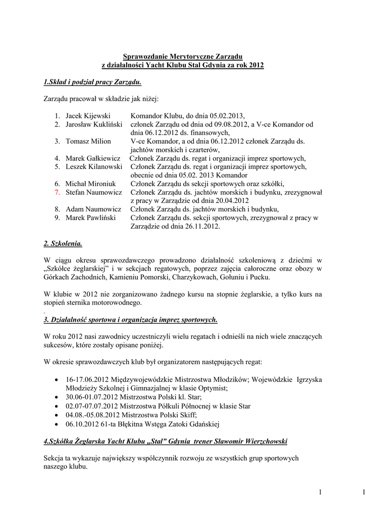 Sprawozdanie Merytoryczne Zarządu z działalności Yacht Klubu Stal Gdynia za rok 2012 1.Skład i podział pracy Zarządu. Zarządu pracował w składzie jak niżej: 1. Jacek Kijewski 2. Jarosław Kukliński Komandor Klubu, do dnia 05.02.2013, członek Zarządu od dnia od 09.08.2012, a V-ce Komandor od dnia 06.12.2012 ds. finansowych, 3. Tomasz Milion V-ce Komandor, a od dnia 06.12.2012 członek Zarządu ds. jachtów morskich i czarterów, 4. Marek Gałkiewicz Członek Zarządu ds. regat i organizacji imprez sportowych, 5. Leszek Kilanowski Członek Zarządu ds. regat i organizacji imprez sportowych, obecnie od dnia 05.02. 2013 Komandor 6. Michał Mironiuk Członek Zarządu ds sekcji sportowych oraz szkółki, 7. Stefan Naumowicz Członek Zarządu ds. jachtów morskich i budynku, zrezygnował z pracy w Zarządzie od dnia 20.04.2012 8. Adam Naumowicz Członek Zarządu ds. jachtów morskich i budynku, 9. Marek Pawliński Członek Zarządu ds. sekcji sportowych, zrezygnował z pracy w Zarządzie od dnia 26.11.2012. 2. Szkolenia. W ciągu okresu sprawozdawczego prowadzono działalność szkoleniową z dziećmi w „Szkółce żeglarskiej” i w sekcjach regatowych, poprzez zajęcia całoroczne oraz obozy w Górkach Zachodnich, Kamieniu Pomorski, Charzykowach, Gołuniu i Pucku. W klubie w 2012 nie zorganizowano żadnego kursu na stopnie żeglarskie, a tylko kurs na stopień sternika motorowodnego. . 3. Działalność sportowa i organizacja imprez sportowych. W roku 2012 nasi zawodnicy uczestniczyli wielu regatach i odnieśli na nich wiele znaczących sukcesów, które zostały opisane poniżej. W okresie sprawozdawczych klub był organizatorem następujących regat: 16-17.06.2012 Międzywojewódzkie Mistrzostwa Młodzików; Wojewódzkie Igrzyska Młodzieży Szkolnej i Gimnazjalnej w klasie Optymist; 30.06-01.07.2012 Mistrzostwa Polski kl. Star; 02.07-07.07.2012 Mistrzostwa Półkuli Północnej w klasie Star 04.08.-05.08.2012 Mistrzostwa Polski Skiff; 06.10.2012 61-ta Błękitna Wstęga Zatoki Gdańskiej 4.Szkółka Żeglarska Yacht Klubu „Stal” Gdynia trener Sławomir Wierzchowski Sekcja ta wykazuje największy współczynnik rozwoju ze wszystkich grup sportowych naszego klubu. 1 1 Obecnie w zajęciach Szkółki uczestniczy około 70 dzieci. Liczba ta nie jest stała, a wpływ na jej zmiany ma głównie pora roku. W okresie zimowym część dzieci zawiesza swój udział w zajęciach głównie ze względu na pogodę. Omega – grupę, której zadaniem jest zatrzymanie w klubie dzieci i młodzieży, które nie maja pasji żeglarstwa regatowego, a chcą zdobyć uprawnienia żeglarskie i bawić się żeglarstwem w formie szeroko pojmowanej turystyki. Klub obecnie posiada 3 Omegi 5. Sekcja Optymist trener Marek Kreft oraz Katarzyna Dłutowska Składa się z grupy A liczącej 10 zawodników i grupy B liczącej 8 zawodników, oraz grupy C liczącej 14 zawodników. W sezonie 2012 dzieci startujące w klasie Optymist zajęły 3 miejsce w Drużynowych MP w Polsce. MP w 2012 zdobył Adam Głogowski, który był uczestnikiem Mistrzostw Europy. Do kadry narodowej zostało powołany 1 zawodnik, a 4-ech zawodników zostało powołanych do Kadry PSKO. 6. Sekcja laser trener Włodzimierz Radwaniecki W klasie Laser zawodnik naszego klubu Maciej Grabowski sezonie 2012 zdobył MP, Maciej Grabowski jest również MP w klasie Star. W klasie Europa nasza zawodniczka Nicole Rydz zdobyła Puchar Polski oraz wice MP juniorek. Jest również członkiem Polskiej Kadry Narodowej W klasie ISA 407 Piotr Jędryczka został MP, a nasi zawodnicy Kacper Wysocki został MP Juniorów a Wicemistrzem Tomasz Ziemnicki. . 7. Żeglarstwo morskie w sezonie 2012 - Flota. Stan floty klubu na koniec okresu sprawozdawczego jest j/n: - s/y Copernicus rok budowy 1973, 9 osób, - s/y Purga rok budowy 1995, 8 osób, - s/y Orkan – rok budowy 1972, 6 osób, - s/y Passat – rok budowy 2002, 6 osób. W okresie sprawozdawczym nie zbyto ani nie nabyto żadnego jachtu. -Wykorzystanie jachtów klubowych w roku 2012(wykazane w dniach ) Copernicus Purga Passat Orkan czartery 79 dni, klubowe 23 dni, czartery 79 dni, klubowe 34 dni, czartery 35 dni, klubowe 45 dni, czartery 32 dni, klubowe 49 dni, - Czartery Wykonano 37 umów czarterowych. Dzięki środkom uzyskanym z umów członkowie klubu mogą po kosztach uprawiać żeglarstwo a my utrzymać flotę w należytym stanie. Również członkowie klubu mieli możliwość nieodpłatnego korzystania z jachtów według zgłoszonych potrzeb. 2 2 - Rejsy Klubowe Odbyły się następujące rejsy z załogami klubowymi: Copernicus- Hanna Gołębiewska Purga-Adam Naumowicz Orkan-Leon Hinz Passat-Adam Woźniak Również członkowie klubu brali udział w licznych rejsach dziennych i weekendowych oraz cieszących się dużym powodzeniem – wędkarskich. W okresie sezonu 2012 , mimo rejsów czarterowych i klubowych o różnej długości, jachty nasze stały przy kei przez: Copernicus Orkan Passat Purga 58 dni 80 dni 80 dni 53 dni - Bezpieczeństwo żeglugi W minionym sezonie jachty nasze nie uczestniczyły w żadnym wypadku morskim. -Remonty i naprawy Wyselekcjonowane żagle do wszystkich jachtów morskich zostały przekazane do firmy Apollo Sails w celu dokonania niezbędnych napraw do sezonu 2012 Tratwy pneumatyczne do jachtów morskich zostały oddane do stacji atestacji celem okresowych przeglądów dla jachtów komercyjnych Ta sama procedura została wykonana celem atestacji gaśnic. Jacht s/y Copernicus 1. Renowacja części nadwodnej i podwodnej kadłuba. Przywrócenie wizerunku z czasów rejsu. 2. Wymiana planek w rejonie podwięzi wantowych zgniłych w rejonie szpilek mocujących podwięzi. 3. Wymiana całkowita instalacji wód zęzowych i wody słodkiej z wymiana przejść burtowych i zaworów na nierdzewne. 4. Wymiana kilku wręgów stalowych pod kokpitem w miejscu dawnych skrzyń akumulatorowych. 5. Przebudowa zasilania z akumulatorów i ich ładowania z przeniesieniem bliżej metacentrum jachtu. 