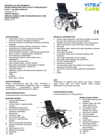 INSTRUKCJA UŻYTKOWNIKA WÓZEK INWALIDZKI SPECJALNY STABILIZUJĄCY PLECY I GŁOWĘ VCWK703 Wydanie 07.13 USER’S MANUAL SPECIAL WHEELCHAIR STABILISING BACK AND HEAD VCWK703 Edition 07.13 OPIS WYROBU: wózek typu recliner z możliwością odchylania oparcia od pozycji siedzącej do leżącej, rama aluminiowa o konstrukcji krzyżowej (podwójny krzyżak), siedzisko w kolorze czarnym wykonane z nylonu, wyposażone w miękką, grubą poduszkę, zabezpieczający pas biodrowy, demontowalne podnóżki z wyściełanym podparciem łydek, uchylne z regulacją kąta nachylenia, demontowalne podłokietniki, demontowalna górna część wózka wraz z zagłówkiem, tylne kółka antywywrotne, koła przednie pełne, rozmiar 200x45, tylne koła pompowane wyposażone w system szybkiego demontażu, rozmiar 24’’, ciągi aluminiowe, podwójny system hamowania (dla pacjenta i dla opiekuna), stolik, pompka, kolor ramy: srebrny ZASTOSOWANIE: Wózek przeznaczony jest dla osób dorosłych z mózgowym porażeniem dziecięcym oraz z rozległymi porażeniami i niedowładami kończyn i tułowia, wymagających stabilizacji pleców i głowy PRZECIWWSKAZANIA: Przeciwwskazania do pozycji siedzącej. BUDOWA WÓZKA: 1. oparcie wyjmowane z zagłówkiem 2. uchwyt rączki z regulacją kąta oparcia, 3. podłokietnik wyjmowane 4. koło tylne pneumatyczne z systemem szybkiego demontażu 5. metalowy ciąg 6. anty-wywrotne kółka 7. hamulce o regulowanym docisku 8. rama o konstrukcji krzyżowej 9. oparcie pochylane do pozycji leżącej 10. koło przednie z PU 11. platforma podnóżka 12. podnóżek 13. stolik PRODUCT DESCRIPTION: recliner type wheelchair, with the possibility of sloping the back from sitting to horizontal position, foldable aluminium frame (double cross construction), black seat made of nylon with thick, soft cushion, safe belt, removable, lifted, angle and lenght adjustable footrests with calf pads, removable armrests, removable upper part of backrest together with headrest, rear height adjustable anti-tip wheels, pneumatic quick-release rear wheels 24’’, full front wheels 200x45, aluminium handrims, double brake system (for patient and caregiver), equipped with brake pads, rear barrier which provides additional stabilization, tray, pump. USE Wheelchair for patients with spinal cord injury, cerebral palsy, lower limb and trunk injuries which require stabilisation of the head and back. CONTRAINDICATIONS: Contraindications to a sitting position. WHEELCHAIR PARTS: 1. removable backrest with headrest 2. handle holder with rest angle adjustment, 3. removable armrest 4. pneumatic, quickrelease rear wheels 5. aluminium handrim 6. anti-tip wheels 7. adjustable-pressure brakes 8. cross frame 9. backrest inclinable to horizontal position 10. front wheel made of polyurethane 11. footrest platform 12. footrest 13. tray 14. stabilizing fitting ROZKŁADANIE WÓZKA. Wyjąć wózek z opakowania i umieścić oparciem od siebie, Zamontować podłokietniki(element nr3), wsuwając je w mocowania ramy wózka do momentu zatrzaśnięcia się blokady, aby zdemontować podłokietniki należy wcisnąć dźwignię blokady podłokietnika (zewnętrzna strona stelażu podłokietnika), i wyciągnąć podłokietnik, Chwycić za podłokietniki i rozsunąć ramę wózka na boki, aby złożyć ramę należy chwycić za krzyżak ramy i unieść wózek do góry, Ustabilizować oparcie poprzez rozłożenie łącznika znajdującego się między rączkami aż do momentu zablokowania zatrzasku. Przed złożeniem ramy należy odblokować zatrzask i „złamać” łącznik Zamocować podnóżki (element nr 12) na wieszakach ramy wózka i wychylić je w kierunku środka wózka aż do momentu zablokowania zatrzasków, rozłożyć platformy podnóżków (element nr 11), podnóżki można odblokować przez naciśnięcie dźwigni zatrzasku, i maksymalne odchylenie podnóżka na zewnątrz wózka. Wysokość podnóżka regulować przez odkręcenie śruby blokującej (powyżej platformy podnóżka), po ustaleniu właściwej wysokości dokręcić śrubę blokady wysokości, kąt rozłożenia podnóżków można regulować podnosząc podnóżki, aby opuścić podnóżek należy zwolnić dźwignię blokady. Anty-wywrotne kółka montujemy w ramie wózka wsuwając je od tyłu w mocowania ramy do momentu zatrzaśnięcia się blokady, aby zdemontować „wąsy” należy wcisnąć kulkę blokady (wewnętrzna strona ramy), i wyciągnąć „wąsy”, Należy dobrać do wagi użytkownika ciśnienie w kołach tylnych, a następnie przy asekuracji opiekuna sprawdzić działanie hamulców postojowych (obciążony wagą użytkownika wózek ustawiony przodem w kierunku spadku, nie może się stoczyć na płaszczyźnie o nachyleniu 15 stopni), Regulowanie stopnia pochylenia oparcia odbywa się za pomocą dźwigni przy uchwytach oparcia; aby opuścić lub podnieść oparcie należy nacisnąć na obie dźwignie jednocześnie i pochylić oparcie ku przodowi lub tyłowi wózka. UWAGA!!! Czynność ta może być wykonana tylko przy zablokowanych hamulcach. ASSEMBLING THE WHEELCHAIR Remove the wheelchair from a package and place it positioning a backrest away from yourself, Install armrests (element No. 3) by inserting them into wheelchair frame fastenings till a lock is latched, to remove the armrests it is necessary to press an armrest lock lever (external side of the armrest frame construction), and pull the armrest out, Hold the armrests and draw the wheelchair frame sideways, to fold the frame it is necessary to hold the frame cross and lift the wheelchair, Stabilize the backrest by assembling a fitting till a latch is locked, before folding the frame it is necessary to unlock the latch and “break” the fitting, Install footrests (element No. 12) on wheelchair frame hangers and tilt them towards the centre of the wheelchair till the latches are locked, assemble footrest platforms (element No 11), the footrests can be unlocked by pressing a latch lever and maxima