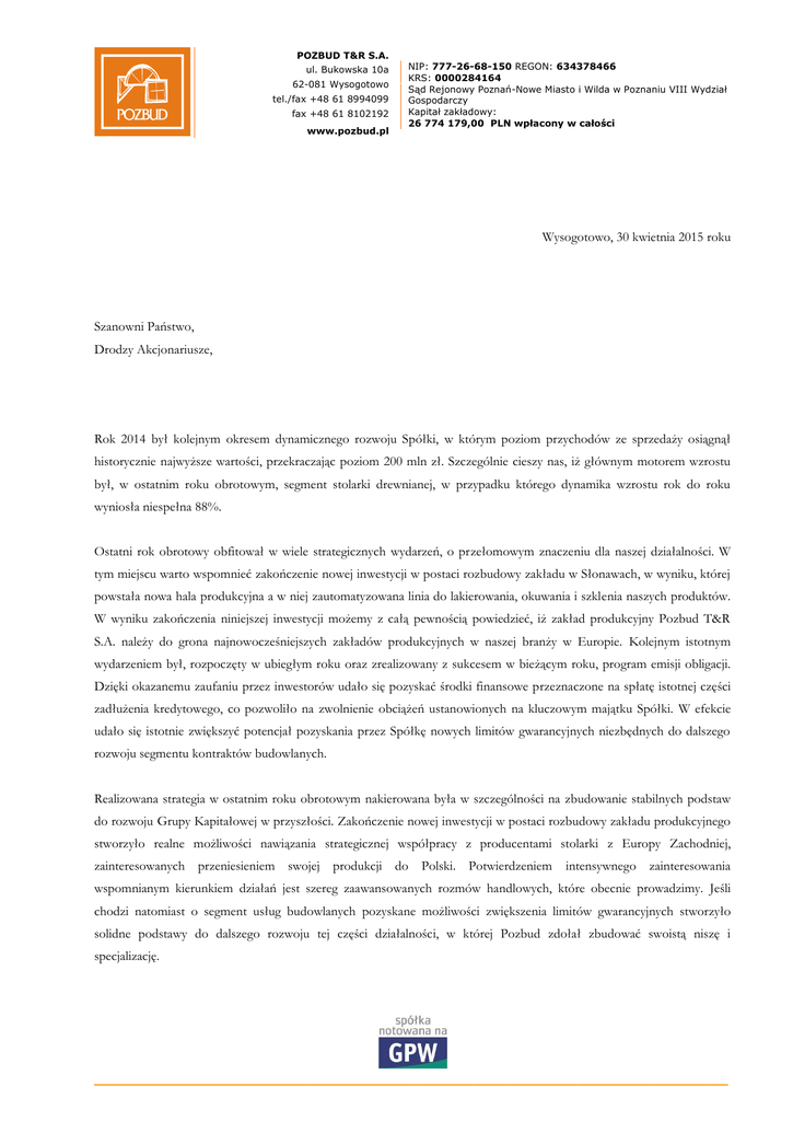 POZBUD T&R S.A. ul. Bukowska 10a 62-081 Wysogotowo tel./fax +48 61 8994099 fax +48 61 8102192 www.pozbud.pl NIP: 777-26-68-150 REGON: 634378466 KRS: 0000284164 Sąd Rejonowy Poznań-Nowe Miasto i Wilda w Poznaniu VIII Wydział Gospodarczy Kapitał zakładowy: 26 774 179,00 PLN wpłacony w całości Wysogotowo, 30 kwietnia 2015 roku Szanowni Państwo, Drodzy Akcjonariusze, Rok 2014 był kolejnym okresem dynamicznego rozwoju Spółki, w którym poziom przychodów ze sprzedaży osiągnął historycznie najwyższe wartości, przekraczając poziom 200 mln zł. Szczególnie cieszy nas, iż głównym motorem wzrostu był, w ostatnim roku obrotowym, segment stolarki drewnianej, w przypadku którego dynamika wzrostu rok do roku wyniosła niespełna 88%. Ostatni rok obrotowy obfitował w wiele strategicznych wydarzeń, o przełomowym znaczeniu dla naszej działalności. W tym miejscu warto wspomnieć zakończenie nowej inwestycji w postaci rozbudowy zakładu w Słonawach, w wyniku, której powstała nowa hala produkcyjna a w niej zautomatyzowana linia do lakierowania, okuwania i szklenia naszych produktów. W wyniku zakończenia niniejszej inwestycji możemy z całą pewnością powiedzieć, iż zakład produkcyjny Pozbud T&R S.A. należy do grona najnowocześniejszych zakładów produkcyjnych w naszej branży w Europie. Kolejnym istotnym wydarzeniem był, rozpoczęty w ubiegłym roku oraz zrealizowany z sukcesem w bieżącym roku, program emisji obligacji. Dzięki okazanemu zaufaniu przez inwestorów udało się pozyskać środki finansowe przeznaczone na spłatę istotnej części zadłużenia kredytowego, co pozwoliło na zwolnienie obciążeń ustanowionych na kluczowym majątku Spółki. W efekcie udało się istotnie zwiększyć potencjał pozyskania przez Spółkę nowych limitów gwarancyjnych niezbędnych do dalszego rozwoju segmentu kontraktów budowlanych. Realizowana strategia w ostatnim roku obrotowym nakierowana była w szczególności na zbudowanie stabilnych podstaw do rozwoju Grupy Kapitałowej w przyszłości. Zakończenie nowej inwestycji w postaci rozbudowy zakładu produkcyjnego stworzyło realne możliwości nawiązania strategicznej współpracy z producentami stolarki z Europy Zachodniej, zainteresowanych przeniesieniem swojej produkcji do Polski. Potwierdzeniem intensywnego zainteresowania wspomnianym kierunkiem działań jest szereg zaawansowanych rozmów handlowych, które obecnie prowadzimy. Jeśli chodzi natomiast o segment usług budowlanych pozyskane możliwości zwiększenia limitów gwarancyjnych stworzyło solidne podstawy do dalszego rozwoju tej części działalności, w której Pozbud zdołał zbudować swoistą niszę i specjalizację. ___________________________________________________________________ POZBUD T&R S.A. ul. Bukowska 10a 62-081 Wysogotowo tel./fax +48 61 8994099 fax +48 61 8102192 www.pozbud.pl NIP: 777-26-68-150 REGON: 634378466 KRS: 0000284164 Sąd Rejonowy Poznań-Nowe Miasto i Wilda w Poznaniu VIII Wydział Gospodarczy Kapitał zakładowy: 26 774 179,00 PLN wpłacony w całości Chciałbym w tym miejscu pod raz kolejny podkreślić, iż nie bylibyśmy w stanie osiągnąć tak wiele gdyby nie wysiłek i zaangażowanie Pracowników i Współpracowników Spółki, którym dziś bardzo serdecznie dziękuję. Osobne podziękowania kieruję do Akcjonariuszy oraz Członków Rady Nadzorczej Spółki Pozbud T&R S.A. za okazane zaufanie i wsparcie, które pozwoliło nam zrealizować założone cele strategiczne, jako również kontynuować konsekwentne budowanie wartości Spółki. Mam nadzieję, że najbliższy rok będzie dla Grupy Kapitałowej Pozbud T&R S.A. okresem dalszego umacniania pozycji rynkowej oraz wzrostu świadomości naszej marki, jak również najwyższej jakości jaką za sobą niesie. Jestem przekonany, że budowane przez pokolenia doświadczenie, wytężona praca oraz wytrwałe dążenie do realizacji założonych celów przyczyni się do intensywnego rozwoju Grupy w latach kolejnych. Tadeusz Andrzejak Prezes Zarządu ___________________________________________________________________