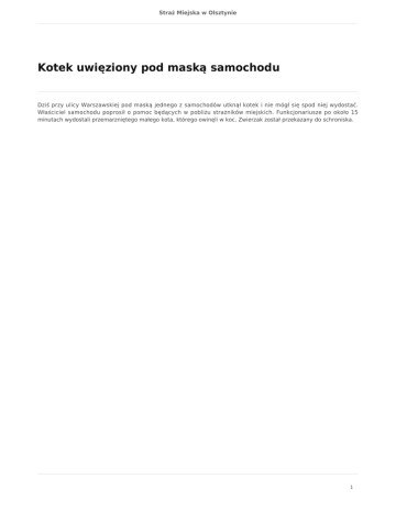 Straż Miejska w Olsztynie Kotek uwięziony pod maską samochodu Dziś przy ulicy Warszawskiej pod maską jednego z samochodów utknął kotek i nie mógł się spod niej wydostać. Właściciel samochodu poprosił o pomoc będących w pobliżu strażników miejskich. Funkcjonariusze po około 15 minutach wydostali przemarzniętego małego kota, którego owinęli w koc. Zwierzak został przekazany do schroniska. 1