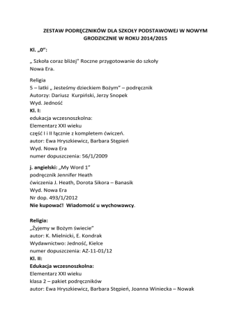 ZESTAW PODRĘCZNIKÓW DLA SZKOŁY PODSTAWOWEJ W NOWYM GRODZICZNIE W ROKU 2014/2015 Kl. „0”: „ Szkoła coraz bliżej” Roczne przygotowanie do szkoły Nowa Era. Religia 5 – latki „ Jesteśmy dzieckiem Bożym” – podręcznik Autorzy: Dariusz Kurpiński, Jerzy Snopek Wyd. Jedność Kl. I: edukacja wczesnoszkolna: Elementarz XXI wieku część I i II łącznie z kompletem ćwiczeń. autor: Ewa Hryszkiewicz, Barbara Stępień Wyd. Nowa Era numer dopuszczenia: 56/1/2009 j. angielski: „My Word 1” podręcznik Jennifer Heath ćwiczenia J. Heath, Dorota Sikora – Banasik Wyd. Nowa Era Nr dop. 493/1/2012 Nie kupować! Wiadomość u wychowawcy. Religia: „Żyjemy w Bożym świecie” autor: K. Mielnicki, E. Kondrak Wydawnictwo: Jedność, Kielce numer dopuszczenia: AZ-11-01/12 Kl. II: Edukacja wczesnoszkolna: Elementarz XXI wieku klasa 2 – pakiet podręczników autor: Ewa Hryszkiewicz, Barbara Stępień, Joanna Winiecka – Nowak Nr dop. I sem. 404/3/2013, II sem. 404/4/2013 Wyd. Nowa Era j. angielski: My World 2 Jennifer Heath Wyd. Nowa Era Nr dopuszczenia 493/2/2013 Religia: „Idziemy do Jezusa” autor: Ks. Jarosław Czerkowski, Elżbieta Kondrak Wyd. Jedność Kielce Nr zatwierdzenia: AZ-12-01/12-KI-3/12 Kl. III: Elementarz XXI wieku Klasa 3- Pakiet podręczników Semestr I i II Ewa Hryszkiewicz, Barbara Stępień Wyd. Nowa Era. Język angielski: Treetops 3 Podręcznik + ćwiczenia Autor: Sarah Howel, Lisa – Kerter Dodgson Wyd. Oxford nr dop. 311/3/2011 Religia: „Jezus jest z nami” Podręcznik do klasy II sp Auotorzy: red. Ks. Jarosław Czerkowski, Elżbieta Kondrak Nr dopuszczenie – A2 – 13 – 01/12 – KL – 4/13 Zeszyt ćwiczeń do religii „Jezus jest z nami” Autorzy: Kurpiński Dariusz, Snopek Jerzy Nr dopuszczenia: A2 – 1 – 01 /12 Wydawnictwo: Jedność Kielce Kl. IV: Język Polski: „Słowa na start” podręcznik do kształcenia literackiego i kulturalnego „Słowa na start” podręcznik do kształcenia językowego część I i II autor: Derlukiewicz Wydawnictwo: Nowa Era numer dopuszczenia: 338/1/2011 Matematyka: Wyd. WSiP, „Matematyka wokół nas” podręcznik + ćwiczenia cz. 1 i cz. 2 autor: Helena Lewicka, Marianna Kowalczyk numer dopuszczenia: 275/1/2010 Historia: „Wczoraj i dziś” autor: Grzegorz Wojciechowski Wydawnictwo Nowa Era Numer dopuszczenia 333/1/2012 Przyroda: Wyd. Nowa Era, Podręcznik „Tajemnice przyrody,” Zeszyt ćwiczeń cz. 1 i 2, autor: Maria Marko - Worłowska, Feliks Szlajfer numer dopuszczenia: 399/1/2011 Język angielski: New English Zone 1 Podręcznik Autor: Rob Nolasco New English Zone 1 Zeszyt ćwiczeń Autorzy: Rob Nolasco, Lois Arthur Wydawnictwo: Oxford University Press nr dopuszczenia 279/1/ 2012/ z 1 Religia: „Miejsce pełne Bogactw” autor K. Mielnicki, E Kondrak Wydawnictwo Jedność, Kielce nr dopuszczenia AZ – 21 – 02/12- KI – 1/12 Plastyka: „Ciekawi świata” autor Anita Przybyszewska – Pietrasiak Wydawnictwo: Operon zeszyt ćwiczeń dla klas 4-6 Numer dopuszczenia 439/2012 Zajęcia komputerowe Ciekawi świata autor Jarosław Dulian Wydawnictwo: Operon Nr dopuszczenia: 494/2012 Podręcznik na 3 lata Kl. V: Język polski: Słowa na start 5 Podręcznik do nauki o języku z ćwiczeniami Szkoła Podstawowa część 1 i 2 Autor Wojciechowska Anna Nr dop. 338/1/2011 Podręcznik . Słowa na start 5. Podręcznik do kształcenia literackiego i kulturowego. autor Derlukiewicz Marlena Wyd. Nowa Era Matematyka: Wyd. WSiP, „Matematyka wokół nas” podręcznik + ćwiczenia cz. 1 i 2 , Helena Lewicka, Marianna Kowalczyk numer dopuszczenia: 275/1/m/2012 Historia: „Wczoraj i dziś do klasy V” autor Grzegorz Wojciechowski Wyd. Nowa Era Nr dop. 443/2/2013 Przyroda: Wyd. Nowa Era, „Tajemnice Przyrody” podręcznik + 2 zeszyty ćwiczeń cz. 1 i 2, autor: J. Ślósarczyk, R.Kazik, F. Szlajfer numer dopuszczenia: 399/2/2013 Język angielski: New English Zone 2 autor Rob Nolasco New English Zone 2 (ćwiczenia) autor Rob Nolasco, Lois Arthur Nr dop. 279/1/2010 Wydawnictwo Oxford University Press Religia: „ Spotkanie uBOGAcające” Podręcznik dla klasy V szkoły podstawowej autor Krzysztof Mielnicki, Elżbieta Kondrak, Ewelina Parszewska Wyd. Jedność Kielce Nr dop. AZ-2-02/12 z 30.V.2012r. W sprzedaży od sierpnia 2013r. Plastyka: „Ciekawi świata” autor Anita Przybyszewska – Pietrasiak Wydawnictwo: Operon zeszyt ćwiczeń dla klas 4-6 Numer dopuszczenia 439/2012 Technika: Zajęcia techniczne „Odkrywamy na nowo” (część techniczna i komunikacyjna) podręcznik z ćwiczeniami dla klas V-VI autor Urszula Białka Wyd. Operon Nr dop. 978-83-7680-497-2 Wychowanie do życia w rodzinie W drodze ku dorosłości. Wychowanie do życia w rodzinie. Ćwiczenia i materiały – klasa V sp Wydawnictwo: Rubikon Muzyka „I gra muzyka” Podręcznik z ćwiczeniami do klas IV-VI Autor: M. Gromek, G. Kilbach Nr dopuszczenia: 569/2012 Wydawnictwo Nowa Era Kl. VI: Język polski: „Słowa na start” Podręcznik do kształcenia literackiego i kulturowego „Słowa na start” Podręcznik do kształcenia językowego Matematyka: Wyd. WSiP, autor: Helena Lewicka, Marianna Kowalczyk „Matematyka wokół nas” podręcznik + ćwiczenia cz. 1 i 2 , numer dopuszczenia: 275/3/2010 Historia: „Wczoraj i dziś do klasy VI” autor Grzegorz Wojciechowski Wyd. Nowa Era Nr dop. 443/2/2013 Przyroda: Wyd. Nowa Era, „Tajemnice przyrody” podręcznik + 2 zeszyty ćwiczeń autor: A. Czarny, K. Grzybowska - Mnich numer dopuszczenia: 47/09/S Język angielski: New English Zone 3 (tylko podręcznik) Autor: Rob Nolasco, Dawid Newblod Nr dopuszczenia: 279/3/2010 Oxford University Press Sprawdzian szóstoklasisty Repetytorium z testami – język angielski Marta Rosińska, Arkadiusz Mędela Wydawnictwo: Macmillian Religia: „Tajemnice BOGAtego życia”. Podręcznik do nauki religii. Autor: Ks. Dr Krzysztof Mielnicki, Elżbieta Kondrak, Ewelina Prszewska. Nr dopuszczenia : A2 – 2 – 02/12 Dostępny w sprzedaży od