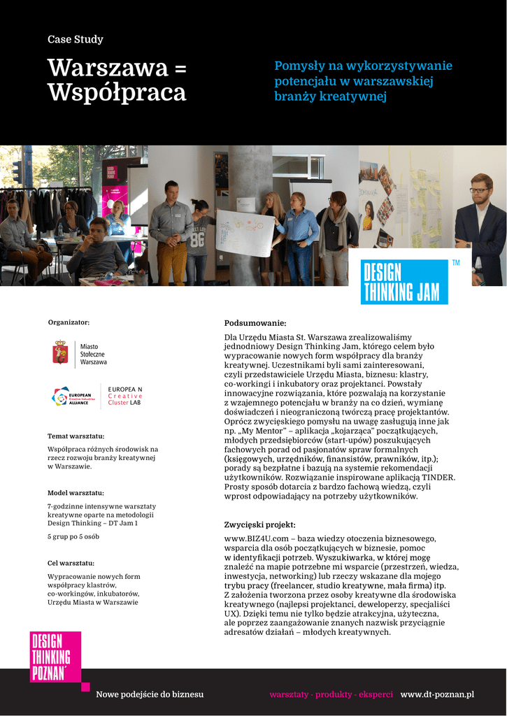 Case Study Warszawa = Współpraca Organizator: Pomysły na wykorzystywanie potencjału w warszawskiej branży kreatywnej Podsumowanie: E UROPEA N Creative Cluster LAB Temat warsztatu: Współpraca różnych środowisk na rzecz rozwoju branży kreatywnej w Warszawie. Model warsztatu: 7-godzinne intensywne warsztaty kreatywne oparte na metodologii Design Thinking – DT Jam 1 Dla Urzędu Miasta St. Warszawa zrealizowaliśmy jednodniowy Design Thinking Jam, którego celem było wypracowanie nowych form współpracy dla branży kreatywnej. Uczestnikami byli sami zainteresowani, czyli przedstawiciele Urzędu Miasta, biznesu: klastry, co-workingi i inkubatory oraz projektanci. Powstały innowacyjne rozwiązania, które pozwalają na korzystanie z wzajemnego potencjału w branży na co dzień, wymianę doświadczeń i nieograniczoną twórczą pracę projektantów. Oprócz zwycięskiego pomysłu na uwagę zasługują inne jak np. „My Mentor” – aplikacja „kojarząca” początkujących, młodych przedsiębiorców (start-upów) poszukujących fachowych porad od pasjonatów spraw formalnych porady są bezpłatne i bazują na systemie rekomendacji użytkowników. Rozwiązanie inspirowane aplikacją TINDER. Prosty sposób dotarcia z bardzo fachową wiedzą, czyli wprost odpowiadający na potrzeby użytkowników. Zwycięski projekt: 5 grup po 5 osób www.BIZ4U.com – baza wiedzy otoczenia biznesowego, wsparcia dla osób początkujących w biznesie, pomoc Cel warsztatu: znaleźć na mapie potrzebne mi wsparcie (przestrzeń, wiedza, inwestycja, networking) lub rzeczy wskazane dla mojego Wypracowanie nowych form współpracy klastrów, co-workingów, inkubatorów, Urzędu Miasta w Warszawie Nowe podejście do biznesu Z założenia tworzona przez osoby kreatywne dla środowiska kreatywnego (najlepsi projektanci, deweloperzy, specjaliści UX). Dzięki temu nie tylko będzie atrakcyjna, użyteczna, ale poprzez zaangażowanie znanych nazwisk przyciągnie adresatów działań – młodych kreatywnych. warsztaty - produkty - eksperci www.dt-poznan.pl