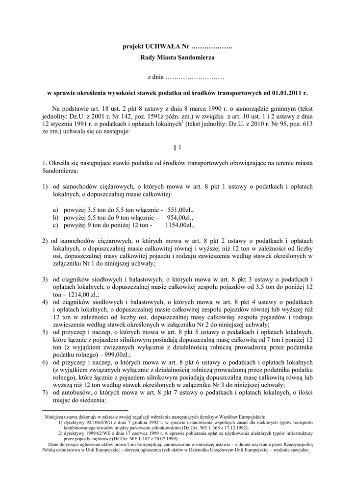 projekt UCHWAŁA Nr ………………. Rady Miasta Sandomierza z dnia ……………………… w sprawie określenia wysokości stawek podatku od środków transportowych od 01.01.2011 r. Na podstawie art. 18 ust. 2 pkt 8 ustawy z dnia 8 marca 1990 r. o samorządzie gminnym (tekst jednolity: Dz.U. z 2001 r. Nr 142, poz. 1591z późn. zm.) w związku z art. 10 ust. 1 i 2 ustawy z dnia 12 stycznia 1991 r. o podatkach i opłatach lokalnych1 (tekst jednolity: Dz.U. z 2010 r. Nr 95, poz. 613 ze zm.) uchwala się co następuje: §1 1. Określa się następujące stawki podatku od środków transportowych obowiązujące na terenie miasta Sandomierza: 1) od samochodów cięŜarowych, o których mowa w art. 8 pkt 1 ustawy o podatkach i opłatach lokalnych, o dopuszczalnej masie całkowitej: a) powyŜej 3,5 ton do 5,5 ton włącznie - 551,00zł., b) powyŜej 5,5 ton do 9 ton włącznie – 954,00zł., c) powyŜej 9 ton do poniŜej 12 ton 1154,00zł., 2) od samochodów cięŜarowych, o których mowa w art. 8 pkt 2 ustawy o podatkach i opłatach lokalnych, o dopuszczalnej masie całkowitej równej i wyŜszej niŜ 12 ton w zaleŜności od liczby osi, dopuszczalnej masy całkowitej pojazdu i rodzaju zawieszenia według stawek określonych w załączniku Nr 1 do niniejszej uchwały; 3) od ciągników siodłowych i balastowych, o których mowa w art. 8 pkt 3 ustawy o podatkach i opłatach lokalnych, o dopuszczalnej masie całkowitej zespołu pojazdów od 3,5 ton do poniŜej 12 ton – 1214,00 zł.; 4) od ciągników siodłowych i balastowych, o których mowa w art. 8 pkt 4 ustawy o podatkach i opłatach lokalnych, o dopuszczalnej masie całkowitej zespołu pojazdów równej lub wyŜszej niŜ 12 ton w zaleŜności od liczby osi, dopuszczalnej masy całkowitej zespołu pojazdów i rodzaju zawieszenia według stawek określonych w załączniku Nr 2 do niniejszej uchwały; 5) od przyczep i naczep, o których mowa w art. 8 pkt 5 ustawy o podatkach i opłatach lokalnych, które łącznie z pojazdem silnikowym posiadają dopuszczalną masę całkowitą od 7 ton i poniŜej 12 ton (z wyjątkiem związanych wyłącznie z działalnością rolniczą prowadzoną przez podatnika podatku rolnego) – 999,00zł.; 6) od przyczep i naczep, o których mowa w art. 8 pkt 6 ustawy o podatkach i opłatach lokalnych (z wyjątkiem związanych wyłącznie z działalnością rolniczą prowadzoną przez podatnika podatku rolnego), które łącznie z pojazdem silnikowym posiadają dopuszczalną masę całkowitą równą lub wyŜszą niŜ 12 ton według stawek określonych w załączniku Nr 3 do niniejszej uchwały; 7) od autobusów, o których mowa w art. 8 pkt 7 ustawy o podatkach i opłatach lokalnych, o ilości miejsc do siedzenia: 1 Niniejsza ustawa dokonuje w zakresie swojej regulacji wdroŜenia następujących dyrektyw Wspólnot Europejskich: 1) dyrektywy 92/106/EWG z dnia 7 grudnia 1992 r. w sprawie ustanowienia wspólnych zasad dla niektórych typów transportu kombinowanego towarów między państwami członkowskimi (Dz.Urz. WE L 368 z 17.12.1992), 2) dyrektywy 1999/62/WE z dnia 17 czerwca 1999 r. w sprawie pobierania opłat za uŜytkowania niektórych typów infrastruktury przez pojazdy cięŜarowe (Dz.Urz. WE L 187 z 20.07.1999). Dane dotyczące ogłoszenia aktów prawa Unii Europejskiej, zamieszczone w niniejszej ustawie – z dniem uzyskania przez Rzeczpospolitą Polską członkostwa w Unii Europejskiej – dotyczą ogłoszenia tych aktów w Dzienniku Urzędowym Unii Europejskiej – wydanie specjalne. a) mniejszej niŜ 30 miejsc – 1336,00zł., b) równej lub wyŜszej niŜ 30 miejsc – 1687,00zł. 2. Stawki podatku dla środków transportowych wyprodukowanych przed 1990 r. w wysokości: określa się 1) dla środków transportowych, o których mowa w ust. 1 pkt 1: a) - 603,00 zł., b) - 1004,00 zł., c) - 1195,00zł.; 2) dla środków transportowych, o których mowa w ust. 1 pkt 3: - 1266,00 zł., 3) dla środków transportowych, o których mowa w ust. 1 pkt 5 – 1 026,00 zł.; 4) dla środków transportowych, o których mowa w ust. 1 pkt 7: a) – 1408,00 zł b) - 1779,00 zł §2 Wykonanie uchwały powierza się Burmistrzowi Miasta Sandomierza. §3 Z dniem wejścia w Ŝycie niniejszej uchwały traci moc uchwała Nr XLII/359/2009 Rady Miasta Sandomierza z dnia 30 listopada 2009 r. w sprawie określenia wysokości stawek podatku od środków transportowych od 01.01.2010r. §4 Uchwała wchodzi w Ŝycie po upływie 14 dni od dnia jej ogłoszenia w Dzienniku Urzędowym Województwa Świętokrzyskiego i ma zastosowanie do podatku naleŜnego od 1 stycznia 2011 r. Przewodniczący Rady Miasta Załącznik Nr 1 do Uchwały Nr ………….. Rady Miasta Sandomierza z dnia …………………….. STAWKI PODATKU DLA POJAZDÓW OKREŚLONYCH w art.8 pkt 2 USTAWY Liczba osi i dopuszczalna masa całkowita (w tonach) Stawka podatku (w złotych) Nie mniej niŜ Mniej niŜ Oś jezdna (osie jezdne) z zawieszeniem pneumatycznym lub zawieszeniem uznanym za równowaŜne Inny system zawieszenia osi jezdnych 1 2 3 4 12 18 1500 1600 18 29 1876 1922 1884 1931 Dwie osie 29 Trzy osie 12 18 1680 1701 18 29 1951 2001 2015 2061 29 Cztery osie i więcej 12 18 1782 1791 18 29 1990 2100 2180 2544 29 Przewodniczący Rady Miasta Załącznik Nr 2 do Uchwały Nr…............................ Rady Miasta Sandomierza z dnia………………….. STAWKI PODATKU DLA POJAZDÓW OKREŚLONYCH w art. 8 pkt 4 USTAWY Liczba osi i dopuszczalna masa Całkowita zespołu pojazdów: ciągnik siodłowy + naczepa; ciągnik balastowy + przyczepa (w tonach) Stawka podatku (w złotych) Nie mniej niŜ Mniej niŜ Oś jezdna (osie jezdne) z Inne systemy zawieszeniem pneumatycznym zawieszenia osi lub zawieszeniem uznanym za jezdnych równowaŜne 1 2 3 4 12 18 1507 1597 18 31 1602 1629 1727 2011 1746 1797 2090 2645 Dwie osie 31 Trzy osie i więcej 12 36,1 36,1 Przewodniczący Rady Miasta Załącznik Nr 3 do Uchwały Nr ……………… Rady Miasta Sandomierza z dnia …
