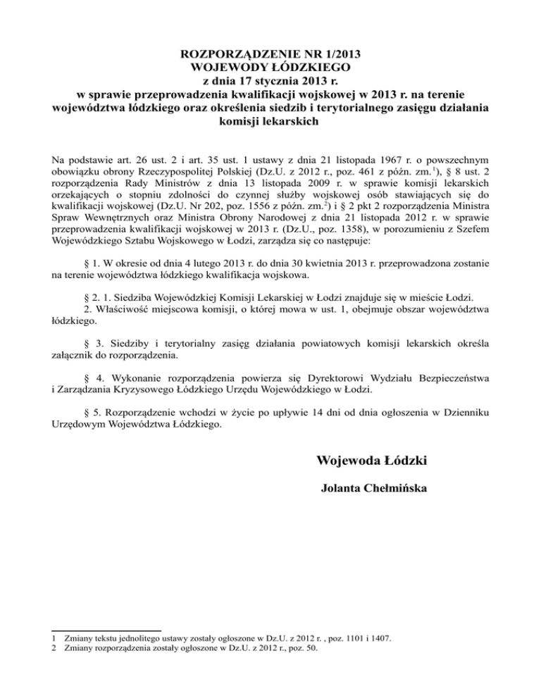 ROZPORZĄDZENIE NR 1/2013 WOJEWODY ŁÓDZKIEGO z dnia 17 stycznia 2013 r. w sprawie przeprowadzenia kwalifikacji wojskowej w 2013 r. na terenie województwa łódzkiego oraz określenia siedzib i terytorialnego zasięgu działania komisji lekarskich Na podstawie art. 26 ust. 2 i art. 35 ust. 1 ustawy z dnia 21 listopada 1967 r. o powszechnym obowiązku obrony Rzeczypospolitej Polskiej (Dz.U. z 2012 r., poz. 461 z późn. zm. 1), § 8 ust. 2 rozporządzenia Rady Ministrów z dnia 13 listopada 2009 r. w sprawie komisji lekarskich orzekających o stopniu zdolności do czynnej służby wojskowej osób stawiających się do kwalifikacji wojskowej (Dz.U. Nr 202, poz. 1556 z późn. zm.2) i § 2 pkt 2 rozporządzenia Ministra Spraw Wewnętrznych oraz Ministra Obrony Narodowej z dnia 21 listopada 2012 r. w sprawie przeprowadzenia kwalifikacji wojskowej w 2013 r. (Dz.U., poz. 1358), w porozumieniu z Szefem Wojewódzkiego Sztabu Wojskowego w Łodzi, zarządza się co następuje: § 1. W okresie od dnia 4 lutego 2013 r. do dnia 30 kwietnia 2013 r. przeprowadzona zostanie na terenie województwa łódzkiego kwalifikacja wojskowa. § 2. 1. Siedziba Wojewódzkiej Komisji Lekarskiej w Łodzi znajduje się w mieście Łodzi. 2. Właściwość miejscowa komisji, o której mowa w ust. 1, obejmuje obszar województwa łódzkiego. § 3. Siedziby i terytorialny zasięg działania powiatowych komisji lekarskich określa załącznik do rozporządzenia. § 4. Wykonanie rozporządzenia powierza się Dyrektorowi Wydziału Bezpieczeństwa i Zarządzania Kryzysowego Łódzkiego Urzędu Wojewódzkiego w Łodzi. § 5. Rozporządzenie wchodzi w życie po upływie 14 dni od dnia ogłoszenia w Dzienniku Urzędowym Województwa Łódzkiego. Wojewoda Łódzki Jolanta Chełmińska 1 Zmiany tekstu jednolitego ustawy zostały ogłoszone w Dz.U. z 2012 r. , poz. 1101 i 1407. 2 Zmiany rozporządzenia zostały ogłoszone w Dz.U. z 2012 r., poz. 50. Załącznik do rozporządzenia Nr 1/2013 Wojewody Łódzkiego z dnia 17 stycznia 2013 r. Siedziby i terytorialny zasięg działania powiatowych komisji lekarskich Lp. Nazwa Komisji Siedziba Komisji Terytorialny zasięg działania 1 2 3 4 1 Powiatowa Komisja Lekarska Łódź - 1 Łódź ul. Warecka 41 Obszar dzielnic: Bałuty i Śródmieście 2 Powiatowa Komisja Lekarska Łódź - 2 Łódź ul. S. Żeromskiego 115 Obszar dzielnicy Górna 3 Powiatowa Komisja Lekarska Łódź - 3 Łódź ul. Obornicka 11/13 Obszar dzielnic: Polesie i Widzew 4 Powiatowa Komisja Lekarska dla Piotrków Trybunalski miasta Piotrkowa Trybunalskiego ul. Wojska Polskiego 60 miasto Piotrków Trybunalski 5 Powiatowa Komisja Lekarska dla Skierniewice miasta Skierniewice ul. Trzcińska 18 miasto Skierniewice 6 Powiatowa Komisja Lekarska w Bełchatowie Bełchatów ul. Czapliniecka 66 Powiat bełchatowski 7 Powiatowa Komisja Lekarska w Brzezinach Brzeziny ul. Reformacka 9 powiat brzeziński 8 Powiatowa Komisja Lekarska w Kutnie Kutno ul. T. Kościuszki 52 powiat kutnowski 9 Powiatowa Komisja Lekarska w Łasku Łask ul. Warszawska 13 powiat łaski 10 Powiatowa Komisja Lekarska w Łęczycy Łęczyca Al. Jana Pawła II 11 powiat łęczycki 11 Powiatowa Komisja Lekarska w Łowiczu Łowicz ul. H. Sienkiewicza 1 powiat łowicki 12 Powiatowa Komisja Lekarska w Łodzi Łódź ul. H. Sienkiewicza 3 powiat łódzki - wschodni 13 Powiatowa Komisja Lekarska w Opocznie Opoczno ul. Janasa 27 powiat opoczyński 14 Powiatowa Komisja Lekarska w Pabianicach Pabianice ul. J. Kilińskiego 10/12 powiat pabianicki 15 Powiatowa Komisja Lekarska w Pajęcznie Pajęczno ul. Strażacka 14 powiat pajęczański 16 Powiatowa Komisja Lekarska w Piotrkowie Trybunalskim Piotrków Trybunalski ul. Wojska Polskiego 60 powiat piotrkowski 17 Powiatowa Komisja Lekarska w Poddębicach Poddębice ul. Łęczycka 16 powiat poddębicki 18 Powiatowa Komisja Lekarska w Radomsku Radomsko ul. Leszka Czarnego 22 powiat radomszczański 19 Powiatowa Komisja Lekarska w Rawie Mazowieckiej Rawa Mazowiecka ul. Niepodległości 8 powiat rawski 20 Powiatowa Komisja Lekarska w Sieradzu Sieradz Plac Wojewódzki 3 powiat sieradzki 21 Powiatowa Komisja Lekarska w Skierniewicach Skierniewice ul. Konstytucji 3 Maja 6 powiat skierniewicki 22 Powiatowa Komisja Lekarska w Tomaszowie Mazowieckim Tomaszów Mazowiecki powiat tomaszowski ul. Marszałka J. Piłsudskiego 37 23 Powiatowa Komisja Lekarska w Wieluniu Wieluń Plac Kazimierza Wielkiego 2 powiat wieluński 24 Powiatowa Komisja Lekarska w Wieruszowie Wieruszów ul. Kępińska 1 powiat wieruszowski 25 Powiatowa Komisja Lekarska w Zduńskiej Woli Zduńska Wola ul. Dolna 41 powiat zduńskowolski 26 Powiatowa Komisja Lekarska w Zgierzu Zgierz ul. A. Struga 13 - 21 powiat zgierski