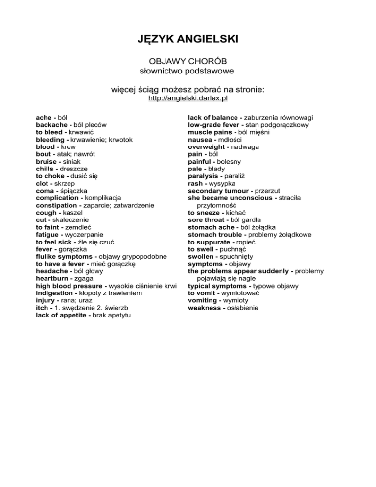 JĘZYK ANGIELSKI OBJAWY CHORÓB słownictwo podstawowe więcej ściąg możesz pobrać na stronie: http://angielski.darlex.pl ache - ból backache - ból pleców to bleed - krwawić bleeding - krwawienie; krwotok blood - krew bout - atak; nawrót bruise - siniak chills - dreszcze to choke - dusić się clot - skrzep coma - śpiączka complication - komplikacja constipation - zaparcie; zatwardzenie cough - kaszel cut - skaleczenie to faint - zemdleć fatigue - wyczerpanie to feel sick - źle się czuć fever - gorączka flulike symptoms - objawy grypopodobne to have a fever - mieć gorączkę headache - ból głowy heartburn - zgaga high blood pressure - wysokie ciśnienie krwi indigestion - kłopoty z trawieniem injury - rana; uraz itch - 1. swędzenie 2. świerzb lack of appetite - brak apetytu lack of balance - zaburzenia równowagi low-grade fever - stan podgorączkowy muscle pains - ból mięśni nausea - mdłości overweight - nadwaga pain - ból painful - bolesny pale - blady paralysis - paraliż rash - wysypka secondary tumour - przerzut she became unconscious - straciła przytomność to sneeze - kichać sore throat - ból gardła stomach ache - ból żołądka stomach trouble - problemy żołądkowe to suppurate - ropieć to swell - puchnąć swollen - spuchnięty symptoms - objawy the problems appear suddenly - problemy pojawiają się nagle typical symptoms - typowe objawy to vomit - wymiotować vomiting - wymioty weakness - osłabienie