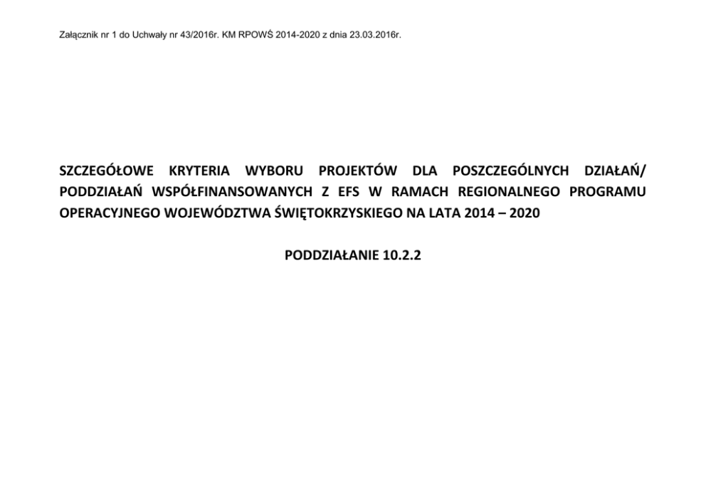 Załącznik nr 1 do Uchwały nr 43/2016r. KM RPOWŚ 2014-2020 z dnia 23.03.2016r. SZCZEGÓŁOWE KRYTERIA WYBORU PROJEKTÓW DLA POSZCZEGÓLNYCH DZIAŁAŃ/ PODDZIAŁAŃ WSPÓŁFINANSOWANYCH Z EFS W RAMACH REGIONALNEGO PROGRAMU OPERACYJNEGO WOJEWÓDZTWA ŚWIĘTOKRZYSKIEGO NA LATA 2014 – 2020 PODDZIAŁANIE 10.2.2 Załącznik nr 1 do Uchwały nr 43/2016r. KM RPOWŚ 2014-2020 z dnia 23.03.2016r. OŚ PRIORYTETOWA Oś Priorytetowa 10. Otwarty rynek pracy PRORYTET INWESTYCYJNY 8i Dostęp do zatrudnienia dla osób poszukujących pracy i osób biernych zawodowo, w tym długotrwale bezrobotnych oraz oddalonych od rynku pracy, także poprzez lokalne inicjatywy na rzecz zatrudnienia oraz wspieranie mobilności pracowników DZIAŁANIE Działanie 10.2 Działania na rzecz podniesienia aktywności zawodowej osób powyżej 29 roku życia PODDZIAŁANIE Poddziałanie 10.2.2 Wsparcie aktywności zawodowej osób powyżej 29 roku życia pozostających bez zatrudnienia – ZIT (projekty konkursowe) KRYTERIA DOSTĘPU L.P 1. Nazwa kryterium Definicja Projekt jest skierowany do grup docelowych z Kieleckiego Obszaru Funkcjonalnego (KOF), które uczą się lub zamieszkują na terenie KOF w rozumieniu przepisów Kodeksu Cywilnego. Skierowanie wsparcia do osób uczących się lub zamieszkałych na terenie KOF jest podyktowane regionalnym charakterem przewidzianego wsparcia co wynika z okoliczności wspierania mieszkańców ww. obszaru zgodnie z terytorialnym rozkładem interwencji wskazanym w Regionalnym Programie Operacyjnym Województwa Świętokrzyskiego na lata 2014-2020 (RPOWŚ). KOF obejmuje miasto Kielce i następujące gminy powiatu kieleckiego: Chęciny, Chmielnik, Daleszyce, Górno, Masłów, Miedziana Góra, Morawica, Piekoszów, Sitkówka Nowiny, Strawczyn i Zagnańsk. Kryterium zostanie zweryfikowane na podstawie treści wniosku Opis znaczenia Weryfikacja „0-1”. Niespełnienie kryterium skutkuje odrzuceniem wniosku. Moment oceny (formalna/ merytoryczna) Kryterium weryfikowane na etapie oceny merytorycznej. Stosuje się do typu/ów projektu/ów (nr) 1-5 Załącznik nr 1 do Uchwały nr 43/2016r. KM RPOWŚ 2014-2020 z dnia 23.03.2016r. o dofinansowanie projektu. 2. 3. Wnioskodawca w okresie realizacji projektu prowadzi biuro projektu (lub posiada siedzibę, filię, delegaturę, oddział, czy inną prawnie dozwoloną formę organizacyjną działalności podmiotu) na terenie KOF obejmującym miasto Kielce i następujące gminy powiatu kieleckiego: Chęciny, Chmielnik, Daleszyce, Górno, Masłów, Miedziana Góra, Morawica, Piekoszów, Sitkówka Nowiny, Strawczyn i Zagnańsk z możliwością udostępnienia pełnej dokumentacji wdrażanego projektu oraz zapewniające uczestnikom projektu możliwość osobistego kontaktu z jego kadrą. Uczestnikami projektu są osoby powyżej 29 roku życia, pozostające bez zatrudnienia (w tym zarejestrowane w Powiatowym/ Miejskim Urzędzie Pracy jako bezrobotne), znajdujące się w szczególnie trudnej sytuacji na rynku pracy, to znaczy należące do przynajmniej jednej z poniższych kategorii: Wprowadzenie kryterium uzasadnia konieczność usprawnienia kontaktu pomiędzy Wnioskodawcą, a osobami korzystającymi ze wsparcia, jak również pomiędzy Wnioskodawcą, a Instytucją Pośredniczącą. Kryterium zostanie zweryfikowane na podstawie treści wniosku o dofinansowanie projektu. Kryterium zostało wprowadzone w związku koniecznością skierowania wsparcia do osób znajdujących się w szczególnej sytuacji na rynku pracy, a także na podstawie zapisów RPOWŚ na lata 20142020. Kryterium zostanie zweryfikowane na podstawie treści wniosku o dofinansowanie projektu. Weryfikacja „0-1”. Spełnienie kryterium jest konieczne do przyznania dofinansowania. Projekty niespełniające danego kryterium są odrzucane na etapie oceny formalnej. Weryfikacja „0-1”. Spełnienie kryterium jest konieczne do przyznania dofinansowania. Niespełnienie kryterium skutkuje odrzuceniem wniosku. Kryterium weryfikowane na etapie oceny formalnej. Kryterium weryfikowane na etapie oceny formalnej. 1-5 1-5 Załącznik nr 1 do Uchwały nr 43/2016r. KM RPOWŚ 2014-2020 z dnia 23.03.2016r. - osoby po 50 roku życia, - kobiety, - osoby z niepełnosprawnościami, - osoby długotrwale bezrobotne, - osoby z niskimi kwalifikacjami, - osoby sprawujące opiekę nad osobą zależną oraz powracające na rynek pracy po zakończonym okresie sprawowania opieki. W przypadku osób zarejestrowanych jako bezrobotne wsparcie może być kierowane wyłącznie do osób, dla których ustalono pierwszy (bezrobotni aktywni) lub drugi profil pomocy (bezrobotni wymagający wsparcia). Okres realizacji projektu nie przekracza 24 miesięcy. 4. 5. Projekt zakłada: a) dla osób w wieku 50 lat i więcej - minimalny poziom kryterium efektywności Ograniczenie długości trwania projektu do maksymalnie 24 miesięcy zapewnieni wysoką efektywność realizacji wszystkich działań w projekcie. Kryterium zostanie zweryfikowane na podstawie treści wniosku o dofinansowanie projektu. Kryterium efektywności zatrudnieniowej oznacza odsetek uczestników projektu, którzy po zakończeniu udziału w projekcie podjęli zatrudnienie (łącznie z pracującymi Weryfikacja „0-1”. Spełnienie kryterium jest konieczne do przyznania dofinansowania. Niespełnienie kryterium skutkuje odrzuceniem wniosku. Weryfikacja „0-1”. Spełnienie kryterium jest konieczne do przyznania Kryterium weryfikowane na etapie oceny formalnej. 1-5 Kryterium weryfikowane na etapie oceny formalnej. 1-5 Załącznik nr 1 do Uchwały nr 43/2016r. KM RPOWŚ 2014-2020 z dnia 23.03.2016r. 6. zatrudnieniowej na poziomie co najmniej 33%, b) dla kobiet – minimalny poziom kryterium efektywności zatrudnieniowej na poziomie co najmniej 39%, c) dla osób z niepełnosprawnościami – minimalny poziom kryterium efektywności zatrudnieniowej na poziomie co najmniej 33%, d) dla osób długotrwale bezrobotnych – minimalny poziom kryterium efektywności zatrudnieniowej na 