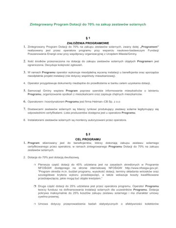 Zintegrowany Program Dotacji do 70% na zakup zestawów solarnych §1 ZAŁOŻENIA PROGRAMOWE 1. Zintegrowany Program Dotacji do 70% na zakupu zestawów solarnych, zwany dalej „Programem” realizowany jest przez operatora programu przy wsparciu naukowo-badawczym Poszanowania Energii oraz przy współpracy organizacyjnej z Urzędem Miasta/Gminy. Fundacji 2. Ilość środków przeznaczona na dotację do zakupu zestawów solarnych objętych Programem jest ograniczona. Decyduje kolejność zgłoszeń. 3. W ramach Programu operator wykonuje nieodpłatną wycenę instalacji u beneficjenta oraz sporządza nieodpłatnie projekt instalacji (nie dotyczy wspólnoty mieszkaniowej). 4. Operator przygotowuje dokumenty niezbędne do przedłożenia w banku celem uzyskania dotacji. 5. Samorząd Gminy wspiera Program poprzez szerokie informowanie mieszkańców o istnieniu Programu, organizowanie spotkań z mieszkańcami oraz zapisuje chętnych mieszkańców. 6. Operatorem i koordynatorem Programu jest firma Hetman–CB Sp. z o.o 7. Dostawcami zestawów solarnych są liderzy rynkowi produkujący zestawy solarne legitymujący się odpowiednimi certyfikatami. Lista producentów dostępna jest u operatora Programu. 8. Instalatorami zestawów solarnych są monterzy autoryzowani przez operatora. §2 CEL PROGRAMU 1. Program skierowany jest do beneficjentów, którzy dokonają zakupu zestawu solarnego certyfikowanego przez operatora, w ramach zintegrowanego Programu Dotacji do 70% na zakupu zestawów solarnych. 2. Dotacja do 70% jest dotacją dwufazową. Pierwsza część dotacji do 45% udzielana jest na zasadach określonych w Programie NFOŚiGW dostępnego na stronie internetowej NFOŚiGW http://www.nfosigw.gov.pl/. ”Program określa m.in. budżet programu, wysokość dotacji, terminy składania wniosków oraz szczegółowe kryteria wyboru przedsięwzięć, a także wskazuje koszty kwalifikowane przedsięwzięcia, jakie mogą być objęte kredytem.” Druga część dotacji do 25% udzielana jest przez operatora programu. Operator Programu tworzy fundusz na dofinansowania instalacji solarnych dla uczestników Programu. Dotacja pokrywa maksymalnie do 25% kosztów zakupu zestawu solarnego i ma charakter umowy cywilno-prawnej. Umowa dotyczy przeprowadzenia badań statystycznych o efektywności kolektorów słonecznych. Beneficjent zobowiązuje się do dostarczenia wyników w/w badań na specjalnym druku do w/w umowy w terminie ujętym w umowie. 3. Wyplata dotacji do 25% następuje po podpisaniu i spełnieniu umowy cywilno–prawnej. 4. Dotacja do 25% sfinansowana zostanie przez operatora Programu. 5. Celem Programu jest uzyskanie przez beneficjenta dotacji do 70% na zakupu kompletnego zestawu solarnego oraz uzyskanie przez operatora informacji na temat efektywności kolektorów słonecznych na terytorium Polski. 6. Beneficjentami Programu są: - Osoby fizyczne posiadające prawo do dysponowania jednorodzinnym lub wielorodzinnym budynkiem mieszkalnym, któremu służyć mają zakupione kolektory słoneczne lub - Wspólnoty mieszkaniowe instalujące kolektory słoneczne na własnych budynkach wielolokalowych (wielorodzinnych). §3 PRZEDMIOT PROGRAMU 1. Przedmiotem Programu jest dostarczenie, zainstalowanie i uruchomienie kompletnych zestawów solarnych do ogrzewania ciepłej wody użytkowej (c.w.u.) 2. Lista oraz skład i charakterystyki zestawów solarnych, objętych Programem dostępna jest u operatora Programu. 3. Wszystkie oferowane zestawy są fabrycznie nowe i spełniają warunki określone w Programie NFOŚiGW. 4. Gwarancje, płatności, terminy realizacji oraz wzajemne zobowiązania uczestników Programu, określają umowy zawierane pomiędzy operatorem a uczestnikiem Programu (beneficjentem). 5. Urząd Miasta lub Gminy nie ponosi odpowiedzialności za działania operatora. §4 WARUNKI UCZESTNICTWA W PROGRAMIE 1. Do Programu może przystąpić każdy mieszkaniec Miasta/Gminy lub wspólnota mieszkaniowa instalująca kolektory słoneczne na własnych budynkach, spełniające warunki uczestnictwa określone, w programie NFOŚiGW oraz poniższe warunki określone przez operatora Programu: a. Beneficjent zadeklaruje udział w programie poprzez złożenie zgłoszenia o przystąpienie do Programu a następnie, po wybraniu odpowiedniego zestawu, podpisze z operatorem umowy na zakup i montaż instalacji w celu skorzystania z Programu. b. Warunkiem skorzystania z Programu jest zaciągnięcie przez beneficjenta, preferencyjnego kredytu udzielanego w ramach Programu NFOŚiGW na zakup zestawu solarnego. Lista Banków udzielających powyższego kredyt dostępna jest na stronie internetowej NFOŚiGW http://www.nfosigw.gov.pl/, urzędzie Miasta/Gminy oraz u operatora Programu. c. Beneficjent posiada warunki techniczne, pozwalające na zainstalowanie kolektorów słonecznych. Warunki techniczne każdorazowo weryfikowane są przez autoryzowanych instalatorów lub doradców techniczno–handlowych operatora. d. Beneficjent zobowiąże się do przeprowadzenia badań statystycznych o efektywności zainstalowanego układ solarnego oraz aktualnego sposobu pozyskiwania energii. §5 REALIZACJA PROGRAMU 1. Warunkiem realizacji Programu z udzieleniem dofinansowania w wysokości do 70% kosztów zakupu zestawu solarnego, jest zgłoszenie się do programu minimum 20 beneficjentów w obrębie jednego Miasta/Gminy. 2. Płatność za zestaw solarny odbywa się bezgotówkowo na zasadach określonych w Programie NFOŚiGW. 3. Zainteresowani udziałem w Programie nie wnoszą żadnych przedpłat. Więcej informacji na stronie : www.hetman-cb.pl