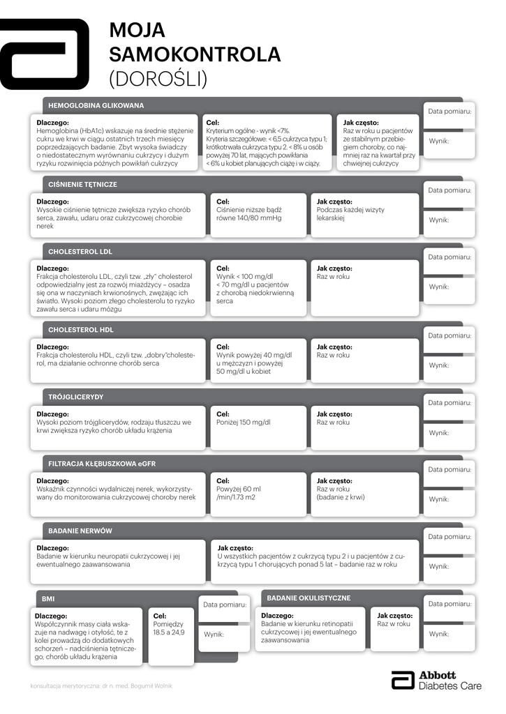 MOJA SAMOKONTROLA (DOROŚLI) HEMOGLOBINA GLIKOWANA Data pomiaru: Dlaczego: Hemoglobina (HbA1c) wskazuje na średnie stężenie cukru we krwi w ciągu ostatnich trzech miesięcy poprzedzających badanie. Zbyt wysoka świadczy o niedostatecznym wyrównaniu cukrzycy i dużym ryzyku rozwinięcia późnych powikłań cukrzycy Cel: Kryterium ogólne - wynik <7%. Kryteria szczegółowe: < 6,5 cukrzyca typu 1; krótkotrwała cukrzyca typu 2. < 8% u osób powyżej 70 lat, mających powikłania < 6% u kobiet planujących ciążę i w ciąży. Jak często: Raz w roku u pacjentów ze stabilnym przebiegiem choroby, co najmniej raz na kwartał przy chwiejnej cukrzycy CIŚNIENIE TĘTNICZE Data pomiaru: Dlaczego: Wysokie ciśnienie tętnicze zwiększa ryzyko chorób serca, zawału, udaru oraz cukrzycowej chorobie nerek Cel: Ciśnienie niższe bądź równe 140/80 mmHg Jak często: Podczas każdej wizyty lekarskiej Cel: Wynik < 100 mg/dl < 70 mg/dl u pacjentów z chorobą niedokrwienną serca Jak często: Raz w roku CHOLESTEROL LDL Wynik: Data pomiaru: Dlaczego: Frakcja cholesterolu LDL, czyli tzw. „zły” cholesterol odpowiedzialny jest za rozwój miażdżycy – osadza się ona w naczyniach krwionośnych, zwężając ich światło. Wysoki poziom złego cholesterolu to ryzyko zawału serca i udaru mózgu Wynik: CHOLESTEROL HDL Data pomiaru: Dlaczego: Frakcja cholesterolu HDL, czyli tzw. „dobry”cholesterol, ma działanie ochronne chorób serca Cel: Wynik powyżej 40 mg/dl u mężczyzn i powyżej 50 mg/dl u kobiet Jak często: Raz w roku Cel: Poniżej 150 mg/dl Jak często: Raz w roku Wynik: TRÓJGLICERYDY Data pomiaru: Dlaczego: Wysoki poziom trójglicerydów, rodzaju tłuszczu we krwi zwiększa ryzyko chorób układu krążenia Wynik: FILTRACJA KŁĘBUSZKOWA eGFR Dlaczego: Wskaźnik czynności wydalniczej nerek, wykorzystywany do monitorowania cukrzycowej choroby nerek Data pomiaru: Cel: Powyżej 60 ml /min/1.73 m2 Jak często: Raz w roku (badanie z krwi) Wynik: BADANIE NERWÓW Data pomiaru: Dlaczego: Badanie w kierunku neuropatii cukrzycowej i jej ewentualnego zaawansowania BMI Dlaczego: Współczynnik masy ciała wskazuje na nadwagę i otyłość, te z kolei prowadzą do dodatkowych schorzeń – nadciśnienia tętniczego, chorób układu krążenia Wynik: Jak często: U wszystkich pacjentów z cukrzycą typu 2 i u pacjentów z cukrzycą typu 1 chorujących ponad 5 lat – badanie raz w roku Data pomiaru: Cel: Pomiędzy 18.5 a 24,9 konsultacja merytoryczna: dr n. med. Bogumił Wolnik Wynik: BADANIE OKULISTYCZNE Dlaczego: Badanie w kierunku retinopatii cukrzycowej i jej ewentualnego zaawansowania Wynik: Data pomiaru: Jak często: Raz w roku Wynik: