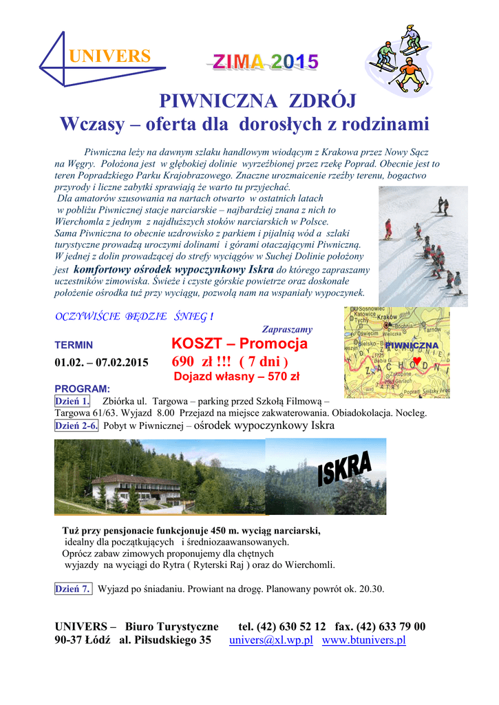 UNIVERS PIWNICZNA ZDRÓJ Wczasy – oferta dla dorosłych z rodzinami Piwniczna leży na dawnym szlaku handlowym wiodącym z Krakowa przez Nowy Sącz na Węgry. Położona jest w głębokiej dolinie wyrzeźbionej przez rzekę Poprad. Obecnie jest to teren Popradzkiego Parku Krajobrazowego. Znaczne urozmaicenie rzeźby terenu, bogactwo przyrody i liczne zabytki sprawiają że warto tu przyjechać. Dla amatorów szusowania na nartach otwarto w ostatnich latach w pobliżu Piwnicznej stacje narciarskie – najbardziej znana z nich to Wierchomla z jednym z najdłuższych stoków narciarskich w Polsce. Sama Piwniczna to obecnie uzdrowisko z parkiem i pijalnią wód a szlaki turystyczne prowadzą uroczymi dolinami i górami otaczającymi Piwniczną. W jednej z dolin prowadzącej do strefy wyciągów w Suchej Dolinie położony jest komfortowy ośrodek wypoczynkowy Iskra do którego zapraszamy uczestników zimowiska. Świeże i czyste górskie powietrze oraz doskonałe położenie ośrodka tuż przy wyciągu, pozwolą nam na wspaniały wypoczynek. OCZYWIŚCIE BĘDZIE ŚNIEG ! Zapraszamy TERMIN 01.02. – 07.02.2015 KOSZT – Promocja 690 zł !!! ( 7 dni ) PIWNICZNA ♥ Dojazd własny – 570 zł PROGRAM: Dzień 1. Zbiórka ul. Targowa – parking przed Szkołą Filmową – Targowa 61/63. Wyjazd 8.00 Przejazd na miejsce zakwaterowania. Obiadokolacja. Nocleg. Dzień 2-6. Pobyt w Piwnicznej – ośrodek wypoczynkowy Iskra Tuż przy pensjonacie funkcjonuje 450 m. wyciąg narciarski, idealny dla początkujących i średniozaawansowanych. Oprócz zabaw zimowych proponujemy dla chętnych wyjazdy na wyciągi do Rytra ( Ryterski Raj ) oraz do Wierchomli. Dzień 7. Wyjazd po śniadaniu. Prowiant na drogę. Planowany powrót ok. 20.30. UNIVERS – Biuro Turystyczne tel. (42) 630 52 12 fax. (42) 633 79 00 90-37 Łódź al. Piłsudskiego 35 [email protected] www.btunivers.pl ŚWIADCZENIA: Przejazd autokarem Zakwaterowanie – o wysokim standardzie ośrodek wypoczynkowy Iskra www.iskra.piwniczna.com położony w malowniczej dolinie Kosarzyska. pięknie usytuowany pośród lasu z widokiem na górskie zbocza. Obok obiektu znajduje się orczykowy wyciąg narciarski i wypożyczalnia sprzętu narciarskiego. Można skorzystać z zajęć szkółki narciarskiej które prowadzą właściciele wyciągu. ( do wyciągu z ośrodka jest ok. 60 m ). Obok ośrodka jest miejsce na ognisko. W ośrodku znajdziemy 2, 3 os. pokoje z łazienkami, TV i balkonami, świetlicę ze stołem do ping ponga, pokój zabaw dla dzieci i siłownię. Za dodatkową odpłatnością można skorzystać z bilarda i sauny. Wyżywienie – 3 posiłki dziennie. Wycieczki jak w programie. Ubezpieczenie NW UWAGA: Informacja dla uczestników zimowiska: Dla osób chcących poszusować dobre warunki dla początkujących i dla zaawansowanych narciarzy można znaleźć na okolicznych stokach narciarskich. W czasie pobytu gwarantujemy wyjazdy na wybrane stoki narciarskie Uwaga : karnety płatne przez uczestników zimowiska -Stacja narciarska Ryterski Raj w Rytrze www.ryterskiraj.pl Każdy znajdzie tutaj coś dla siebie. Specjalnie dla dzieci, które zaczynają zabawę z narciarstwem przygotowany został wyciąg dywanowy. Jest to łatwa trasa, na którą bez obaw możemy posłać nasze pociechy. Kolejna grupa tras to trasy szkoleniowe dla osób pragnących nauczyć się jazdy na nartach. Wyciąg szkoleniowy zawiezie je na miejsce, z którego mogą rozpocząć jazdę na dwóch trasach o długości 400 metrów. Ostatnia grupa tras przygotowana została z myślą o osobach pewnie czujących się z nartami na nogach. Mają oni do wyboru 3 trasy narciarskie o długości 800, 1000 i 1200 metrów, które rozpoczynają się na szczycie Jastrzębskiej Góry. Na trasę każdego chętnego dowiezie 4-osobowa kolej krzesełkowa. - Stacja narciarska Wierchomla – www.wierchomla.com.pl Różnorodne, profesjonalnie przygotowane stoki są naszą najlepszą wizytówką. Szerokie trasy i nowoczesne wyciągi plasują Stację Narciarską Wierchomla w czołówce najnowocześniejszych terenów narciarskich w Polsce. W Wierchomli każdy znajdzie odpowiednie dla siebie stoki, dopasowane do indywidualnych umiejętności i kondycji fizycznej. - Stacja narciarska Sucha Dolina – www.suchadolina.pl Wyciągi narciarskie Sucha Dolina – 10 wyciągów o długości od 300 do 800 m długości i o różnym stopniu trudności. UNIVERS – Biuro Turystyczne 90-307 Łódź Al. Piłsudskiego 35 tel. (42) 630 52 12 fax. (42) 633 79 00 [email protected] www.btunivers.pl
